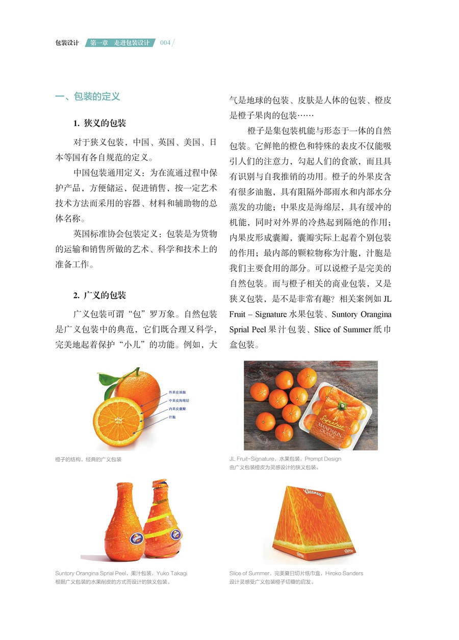 生活中,包装无处不见,它们形形色色,包罗万象,方便和美化着我们的生活。那么,什么才是包装呢?除了我们常见的瓶子、纸盒、塑料制品外,大自然中的香蕉、橙子等的外皮是包装吗?你或许说是,也或许说不是。下面,让我们打开本书,一起走进包装,了解包装设计。