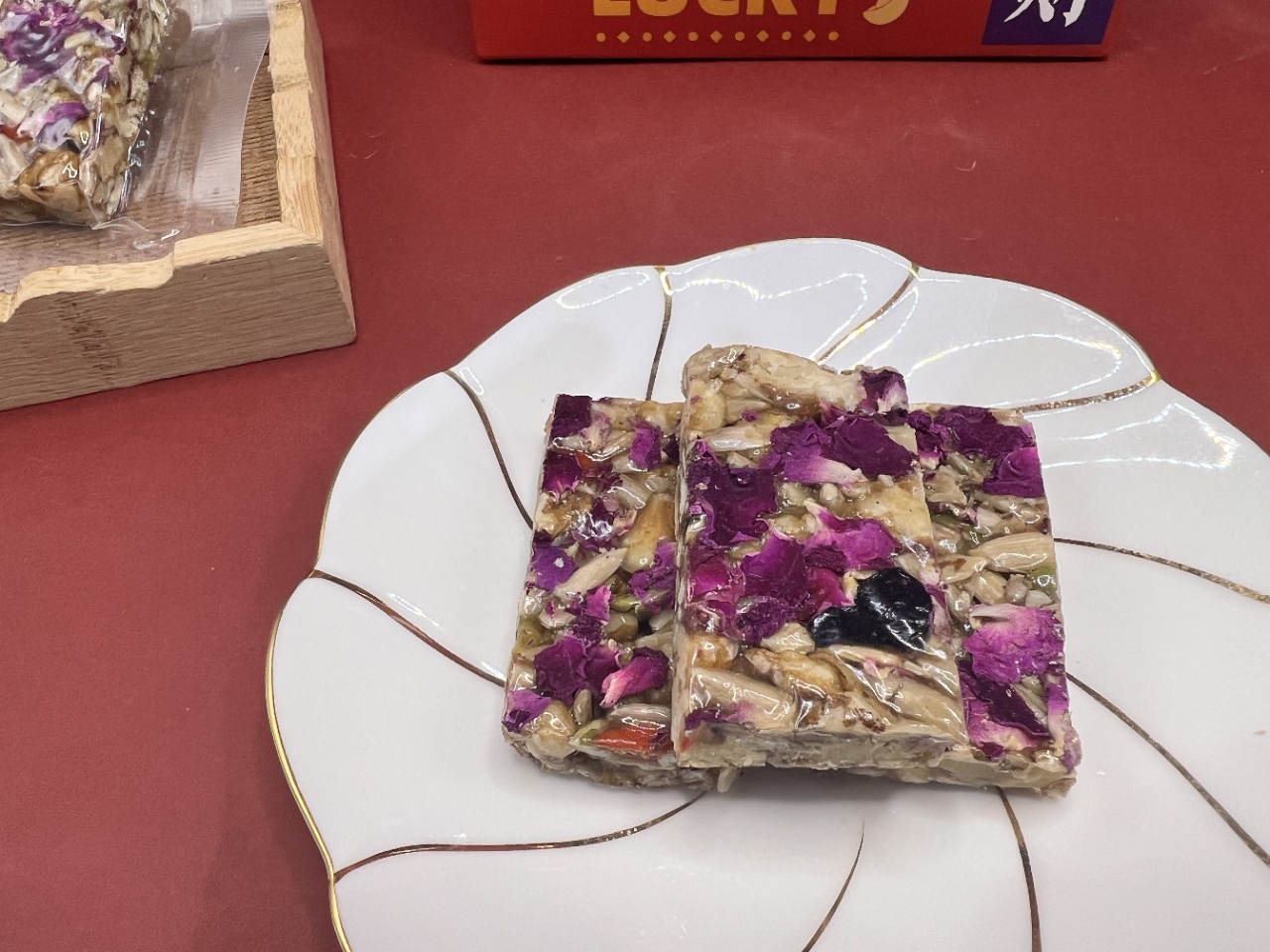 传统技艺,用葡萄干打浆熬制的浓香葡萄汁,融合各种坚果,口感层次会更多样,同时加欲放基地晾晒的玫瑰花瓣的香气,使得味蕾层次更加丰富。