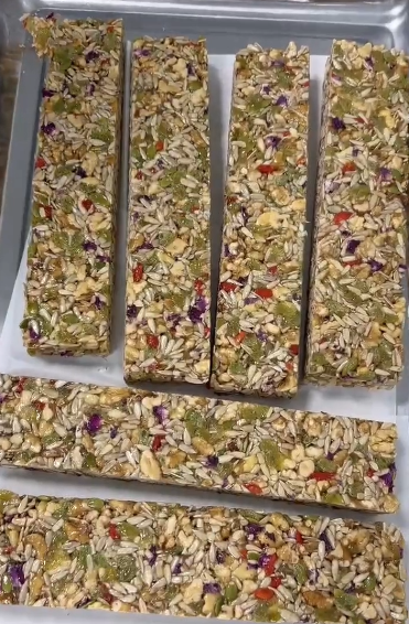 配料表:无蔗糖糖浆、葡葡汁,核桃仁,葵花籽仁,葡萄干,南瓜籽仁,枸杞,重瓣红玫瑰