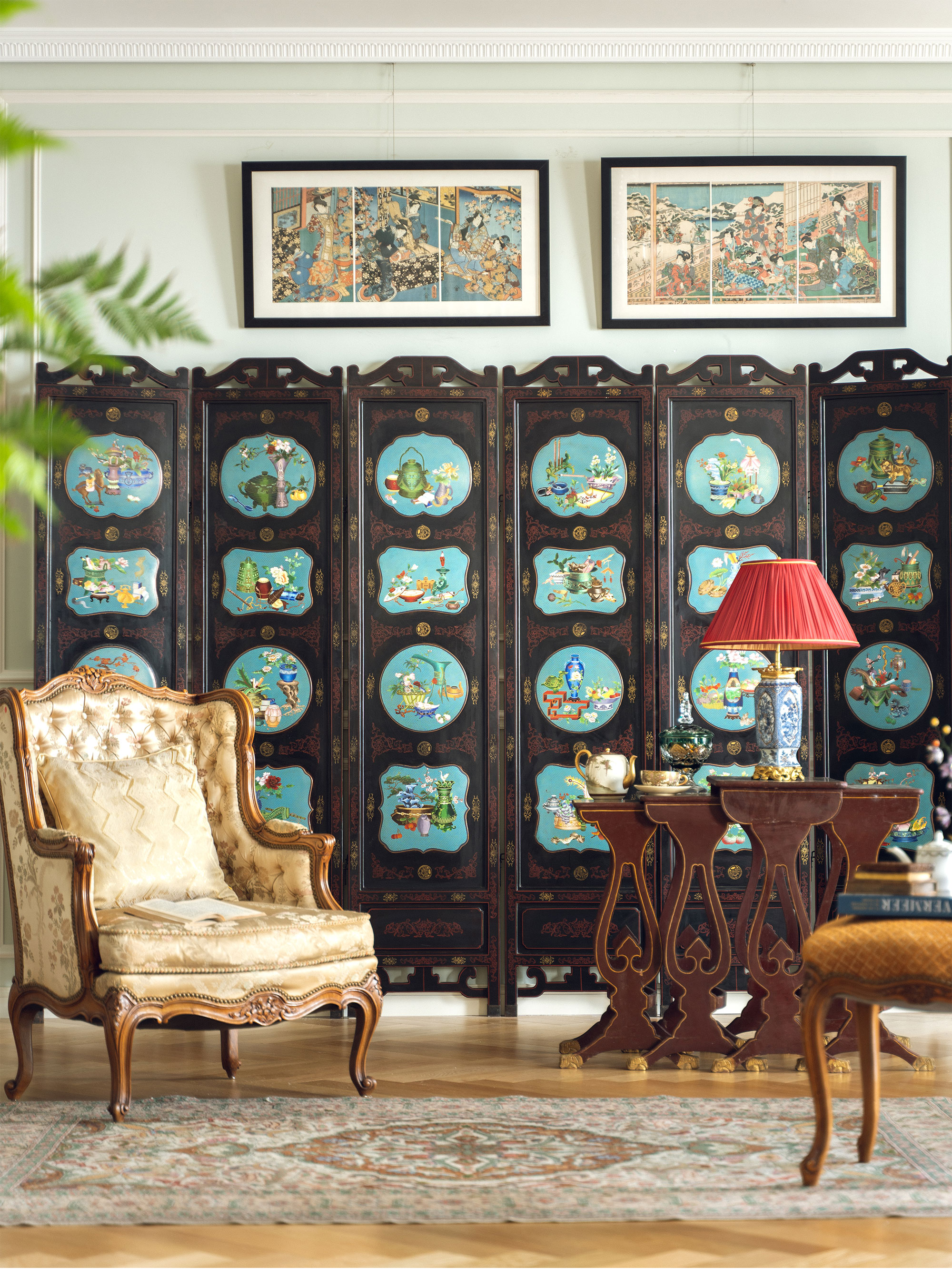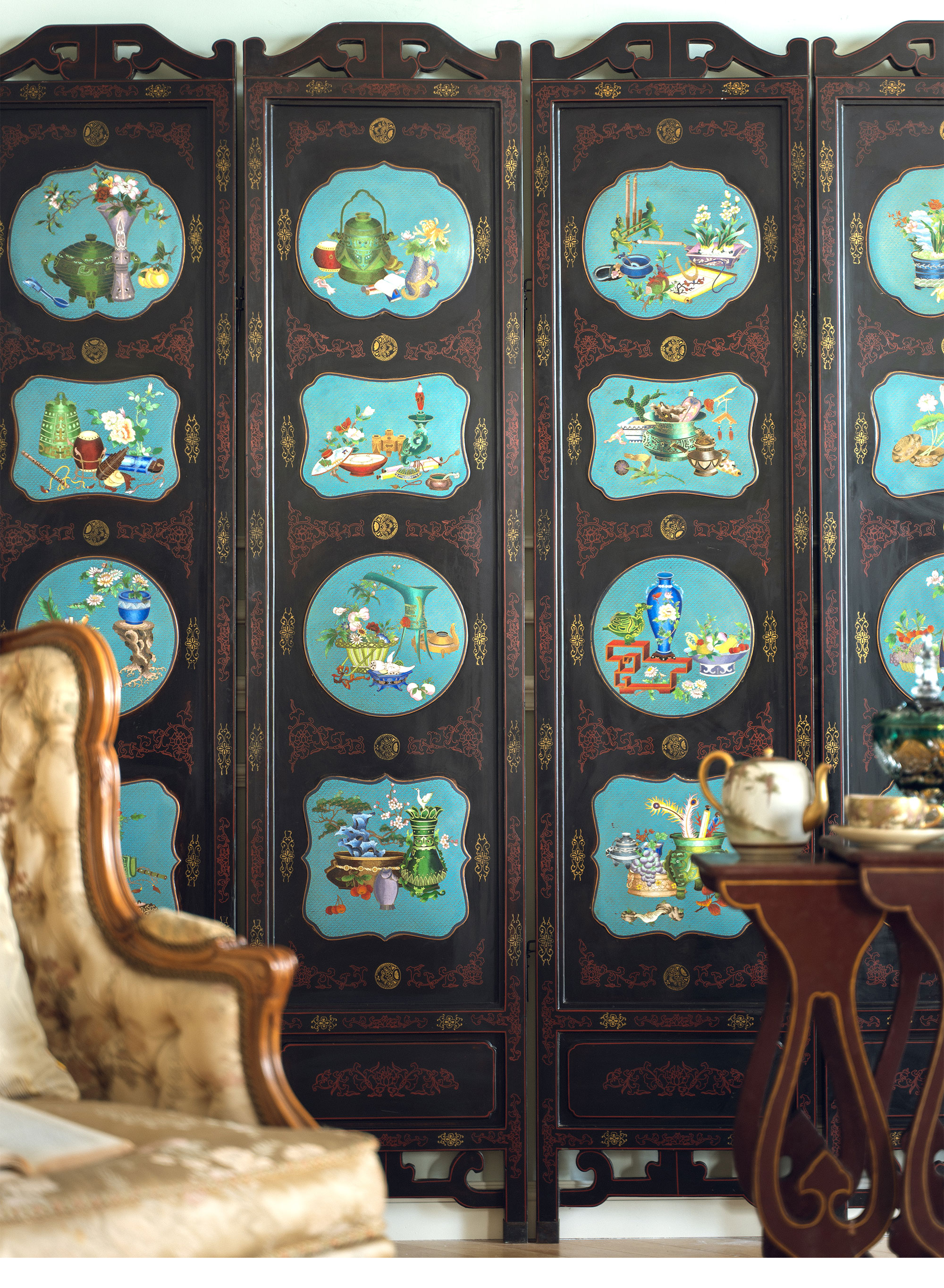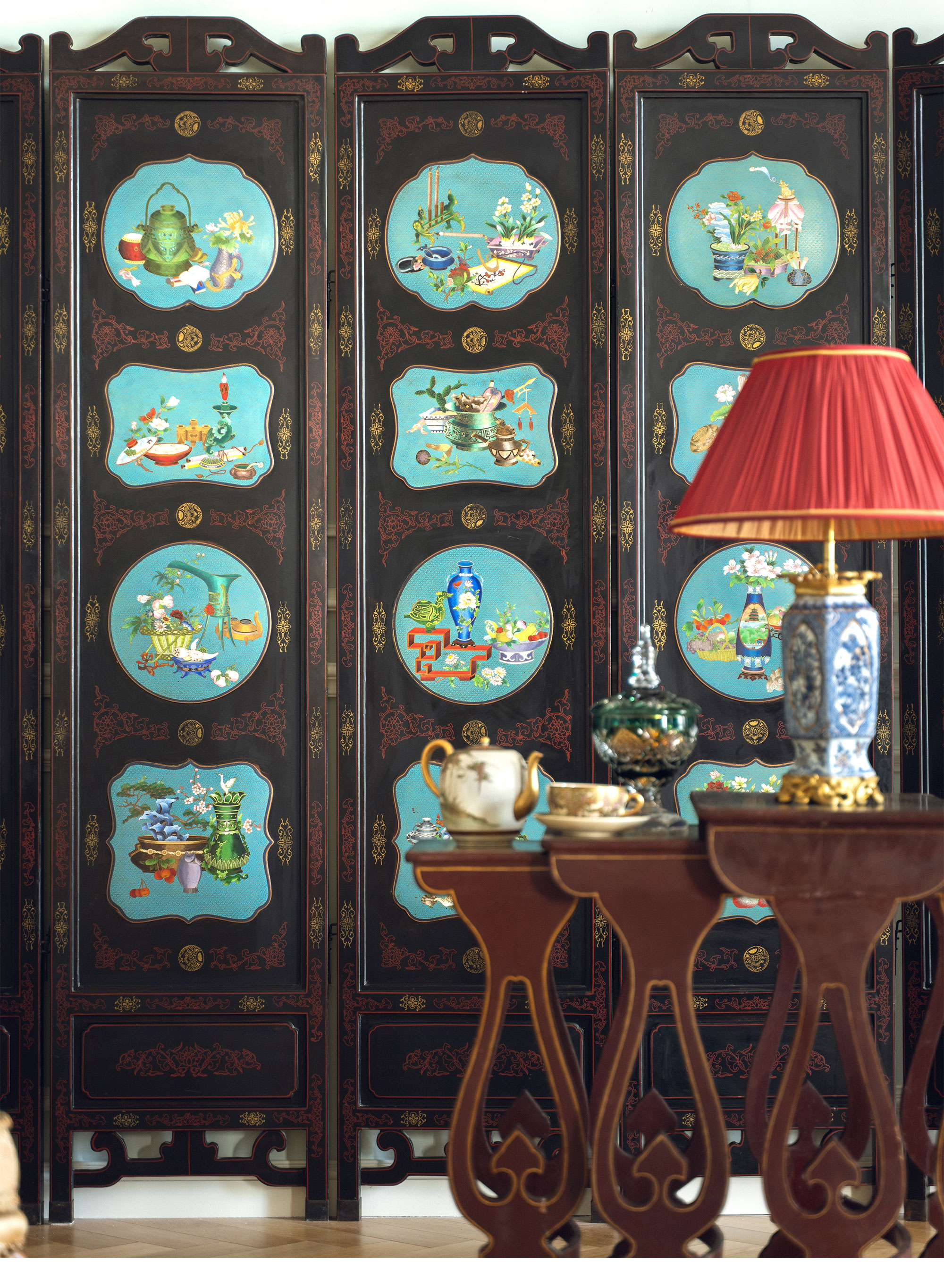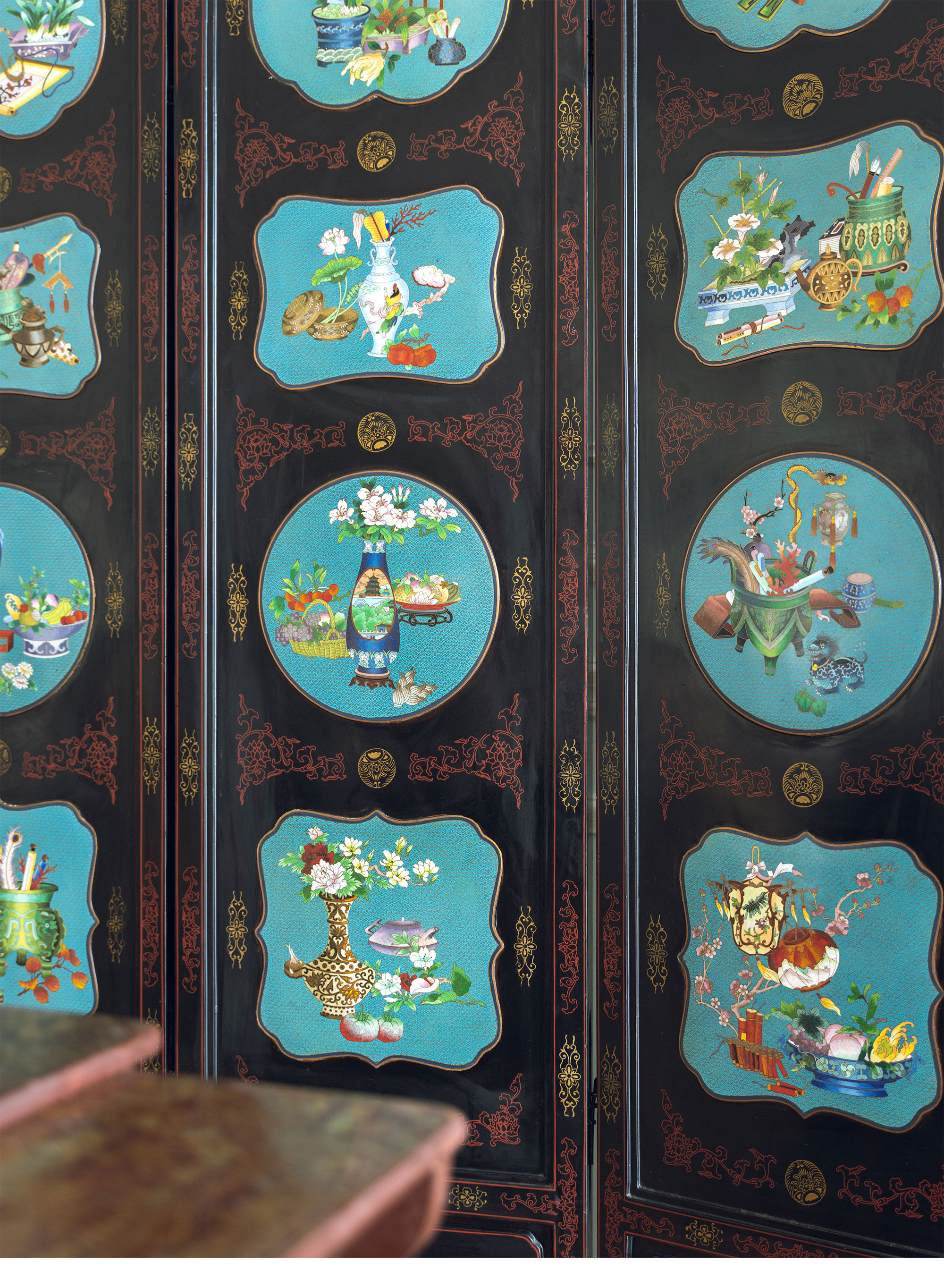 20世纪中国创汇时期出品漆木描金彩绘嵌掐丝珐琅清供博古图六曲屏风