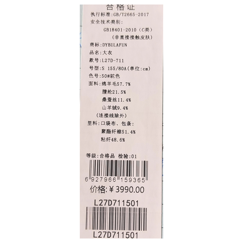 戴布拉芬呢大衣L27D711