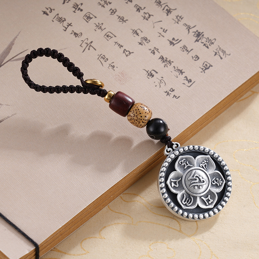 【寓意】:作品灵感源自吉祥八宝,足银圆牌中心錾刻莲花图案,搭配吉祥文字,呈现复古祥和格调。八宝祈福,平安顺遂,功德无量。