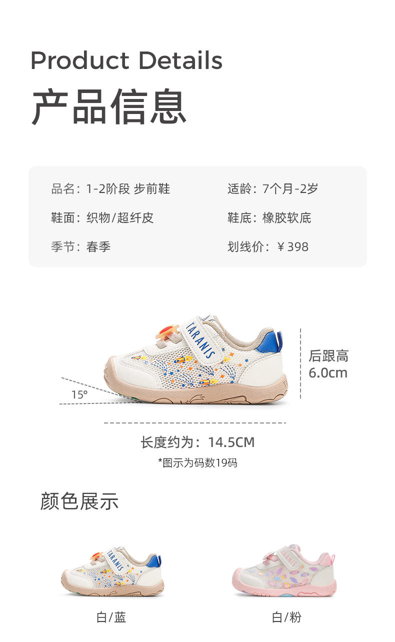 泰兰尼斯春季新款童鞋步前鞋男童婴儿鞋防滑软底女宝宝透气宝宝鞋 T01B5A6136