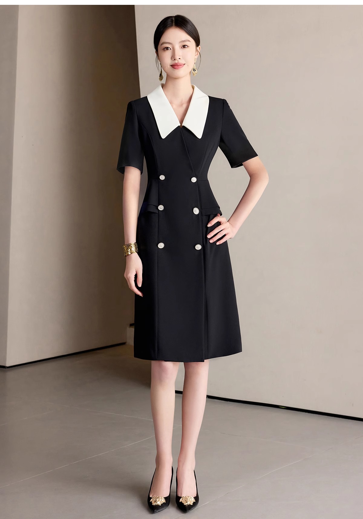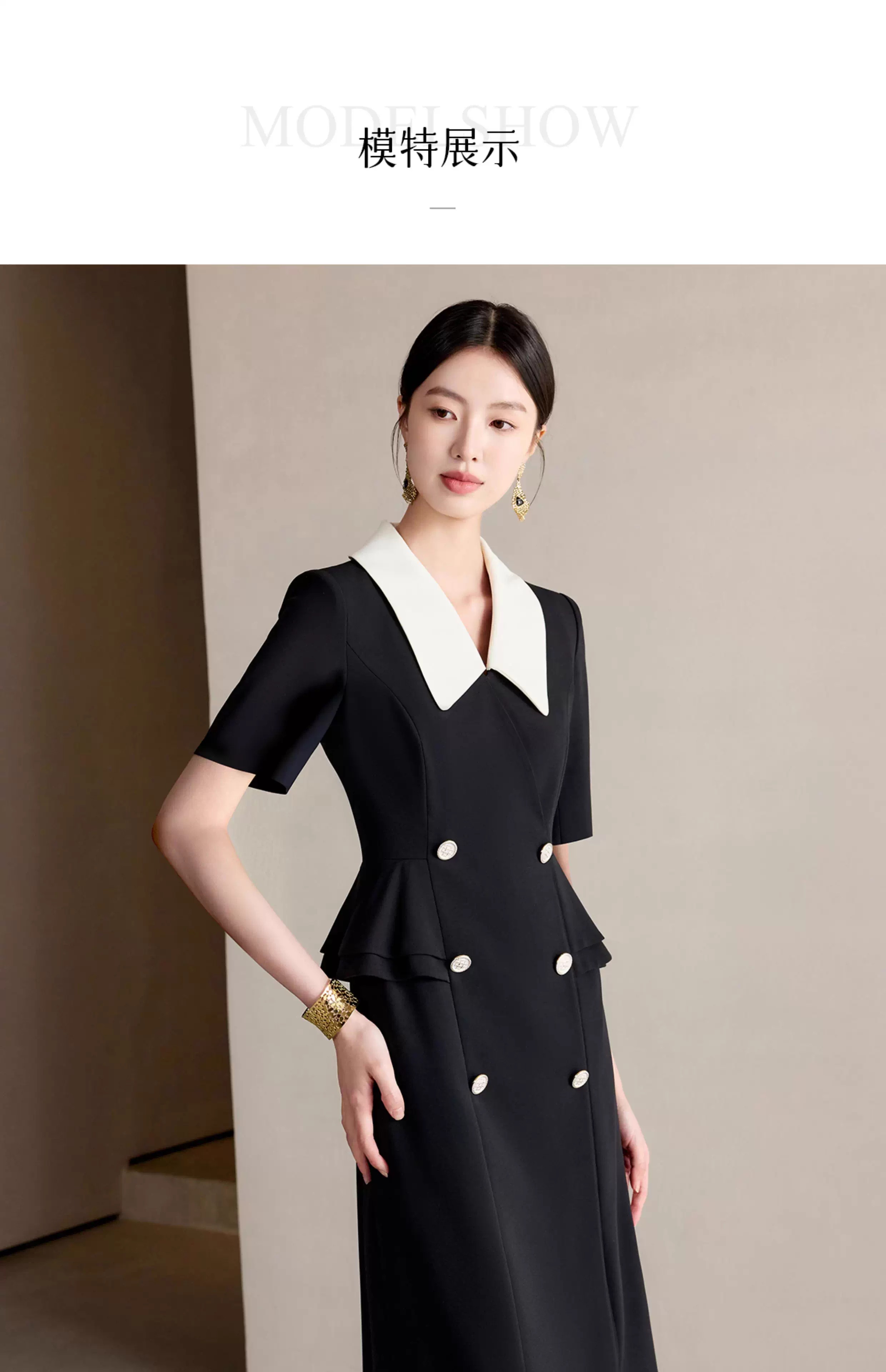 IWY/气质名媛黑色小香风拼接西装连衣裙女短袖双排扣中长裙25Q767