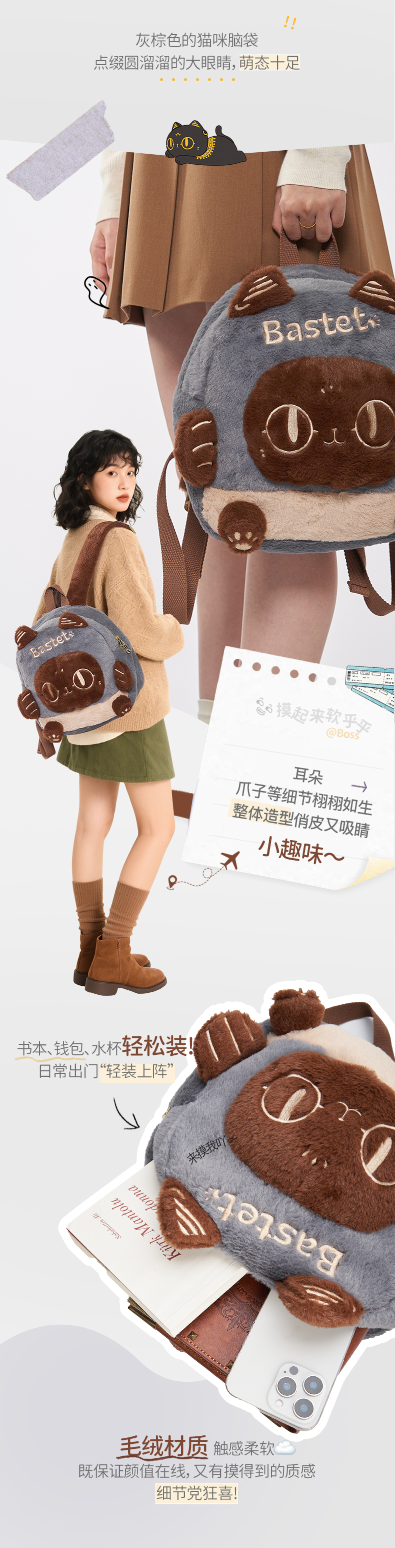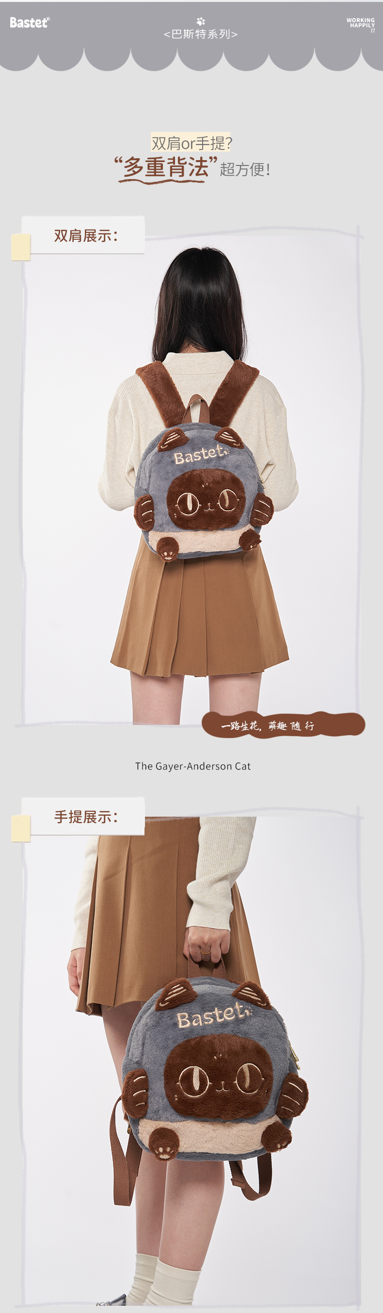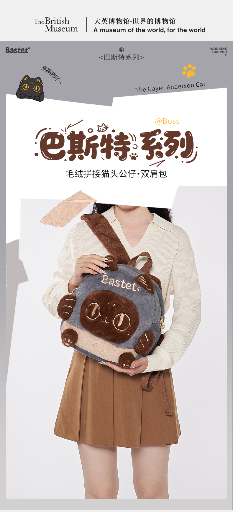 大英博物馆 盖亚·巴斯特系列 毛绒拼接猫头公仔双肩包-灰棕色