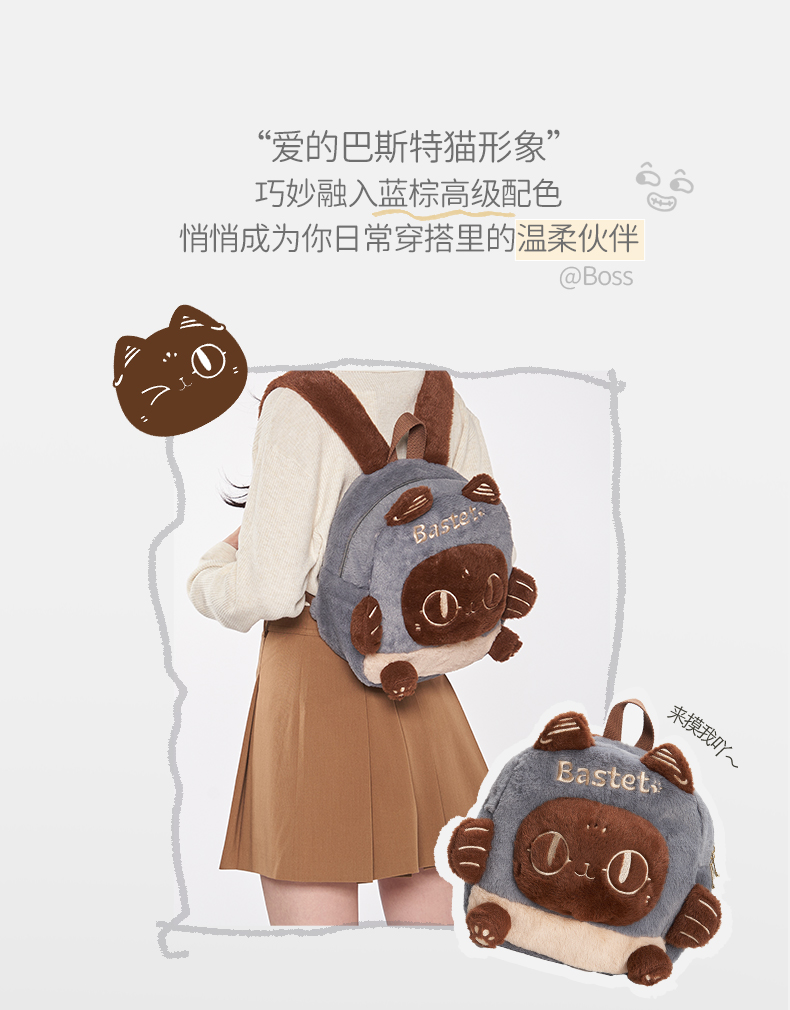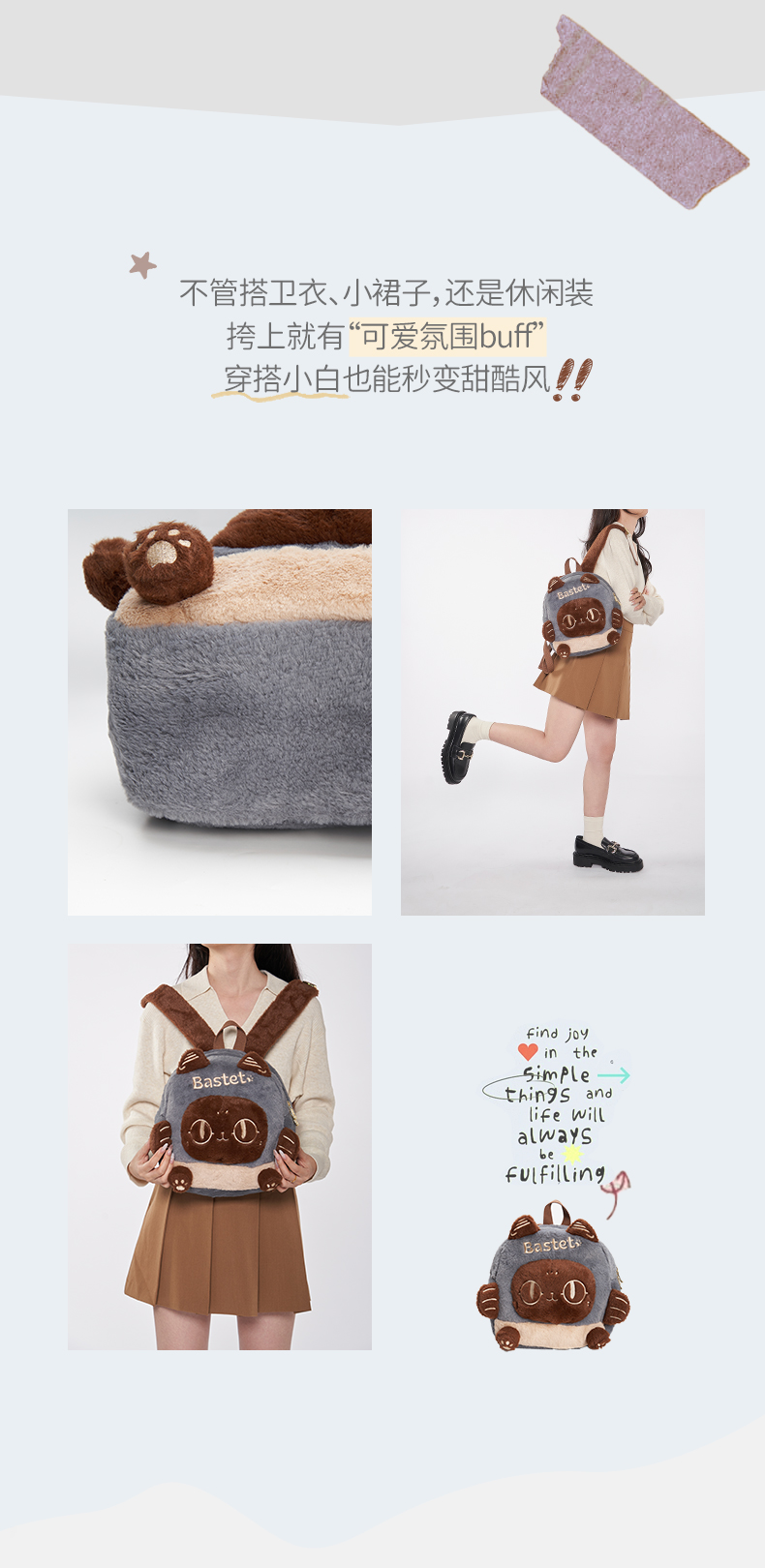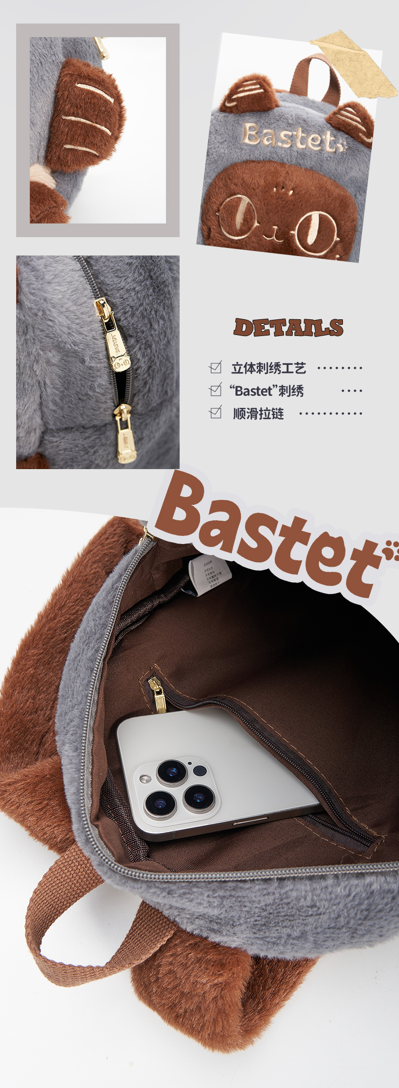 大英博物馆 盖亚·巴斯特系列 毛绒拼接猫头公仔双肩包-灰棕色