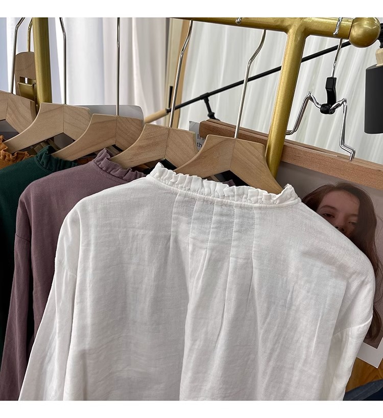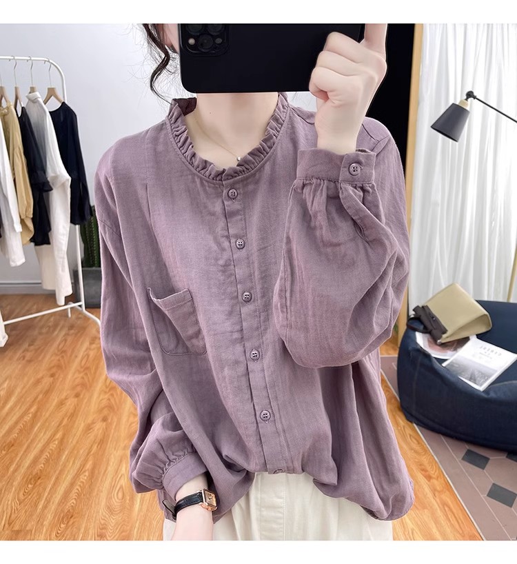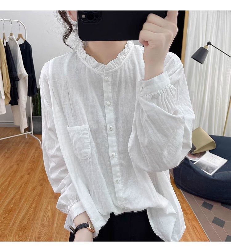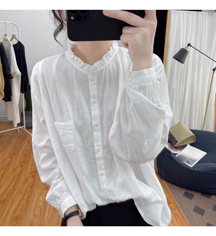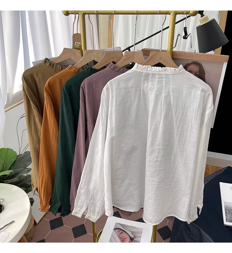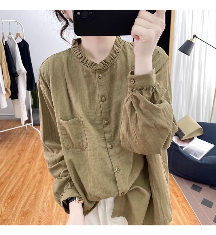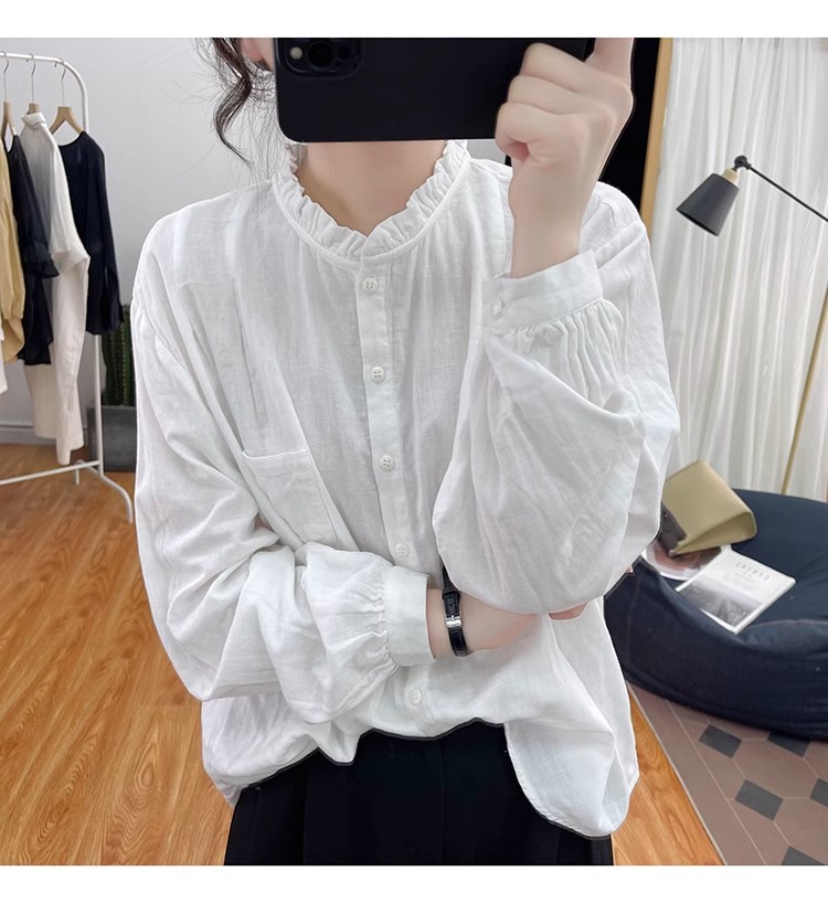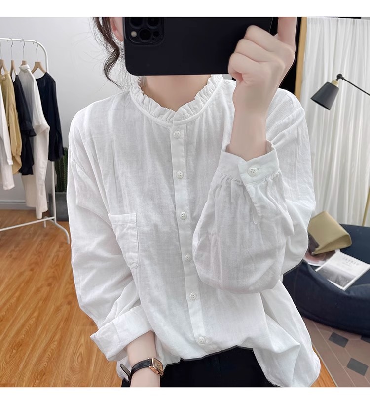 【长袖棉麻衬衣】春秋季宽松减龄上衣 复古荷叶领打底衫衬衫外穿