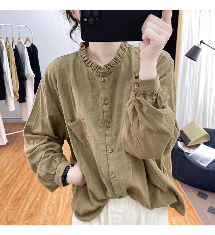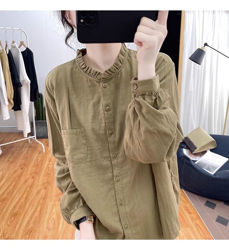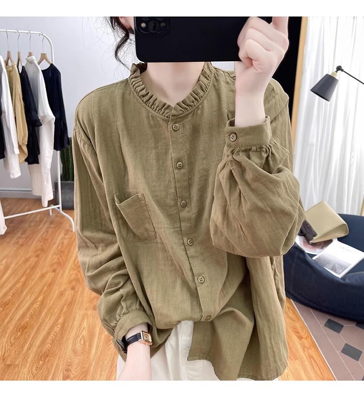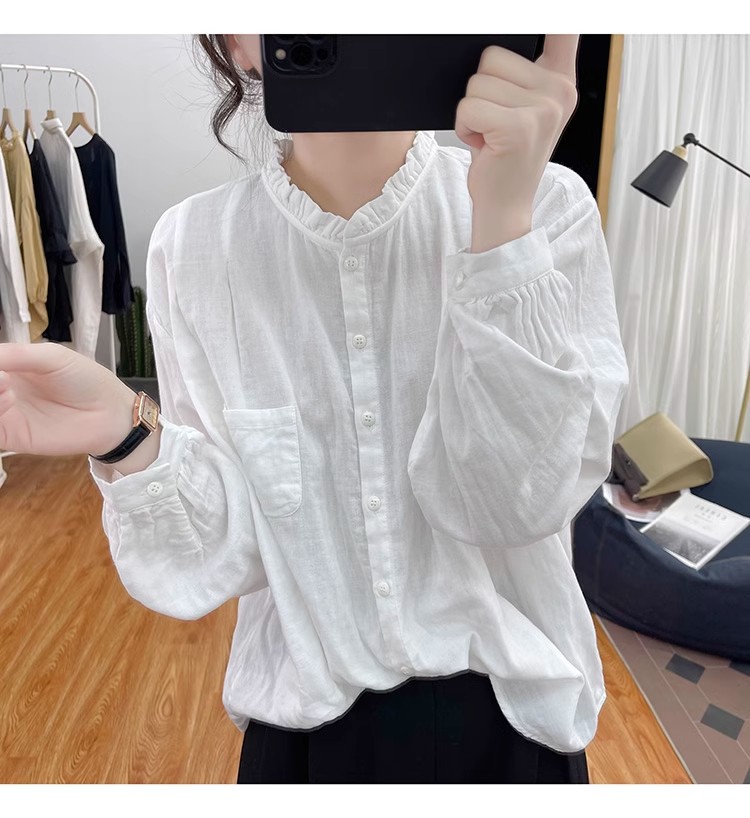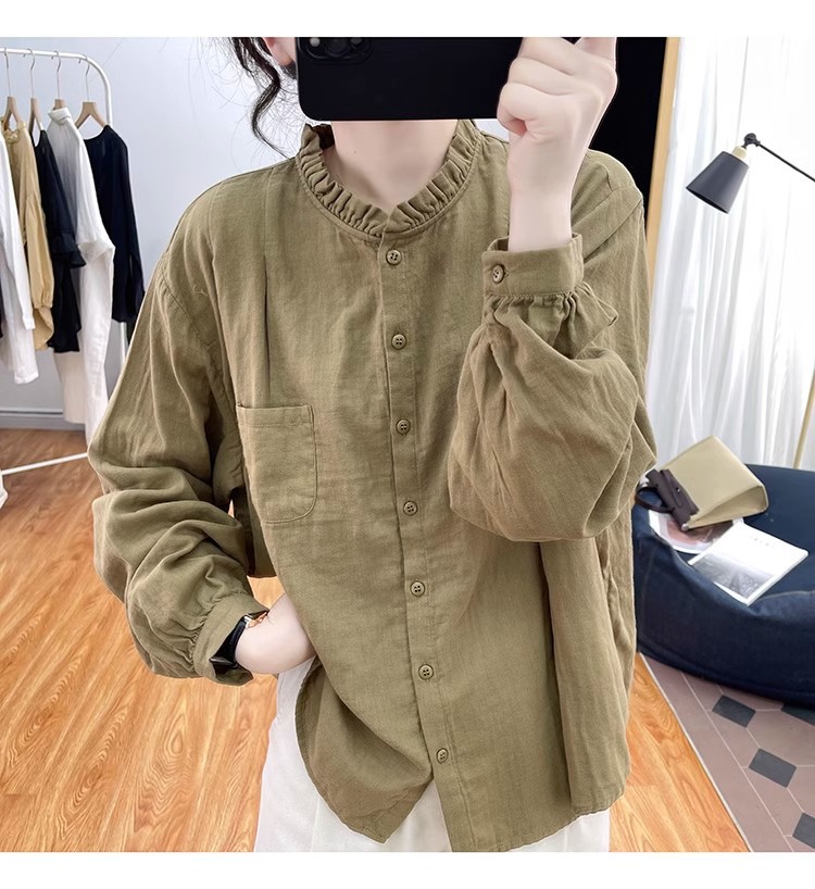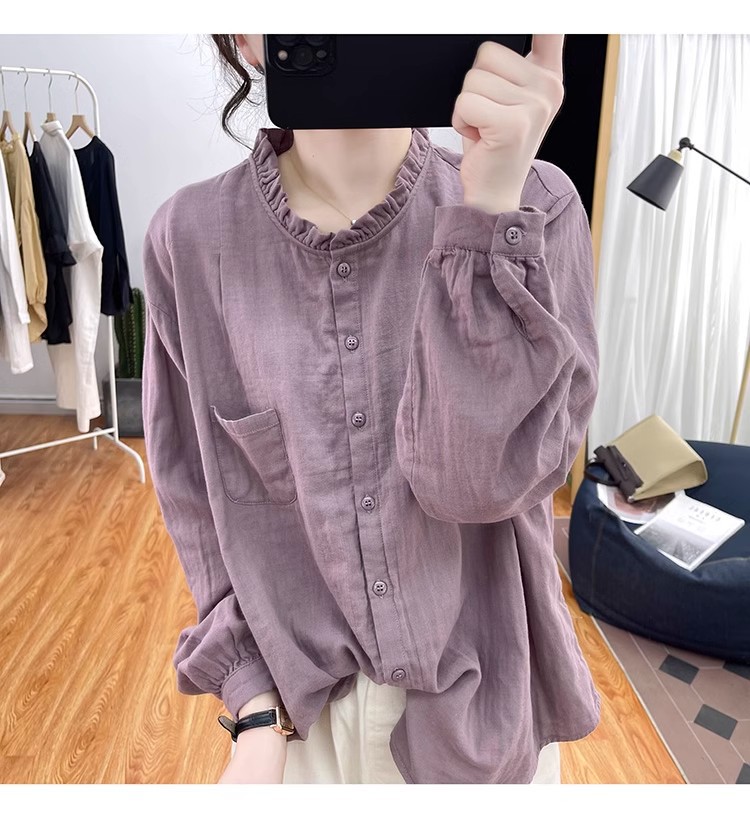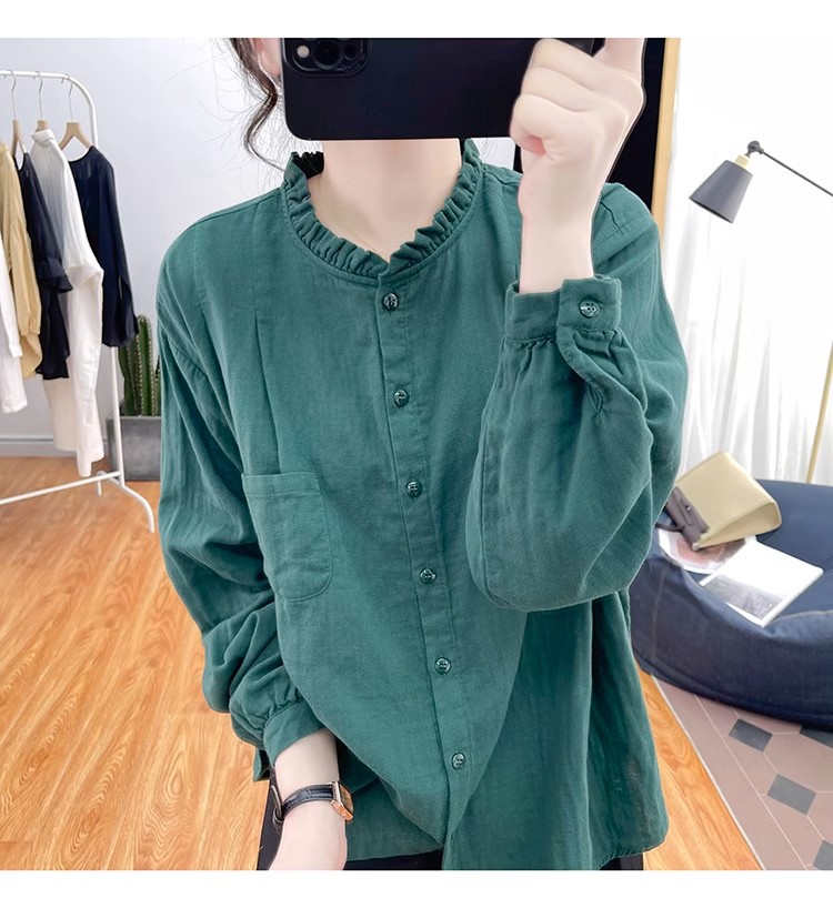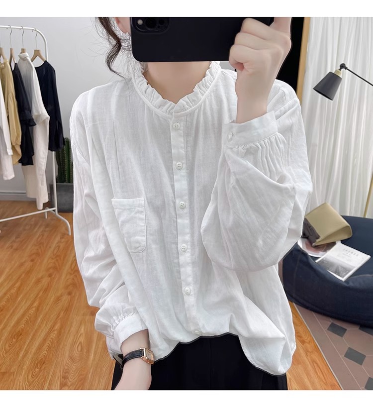 【长袖棉麻衬衣】春秋季宽松减龄上衣 复古荷叶领打底衫衬衫外穿