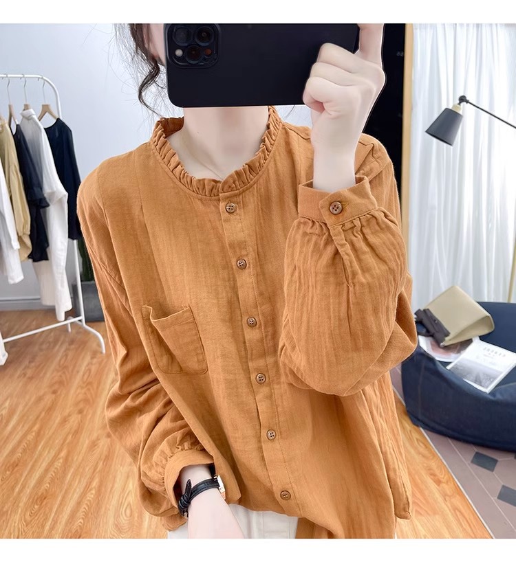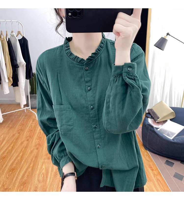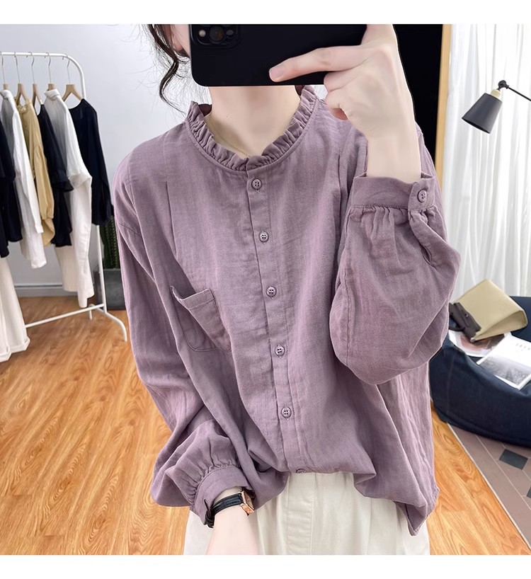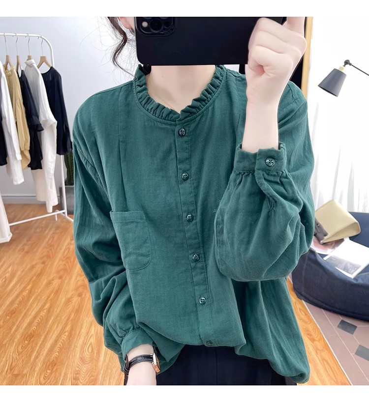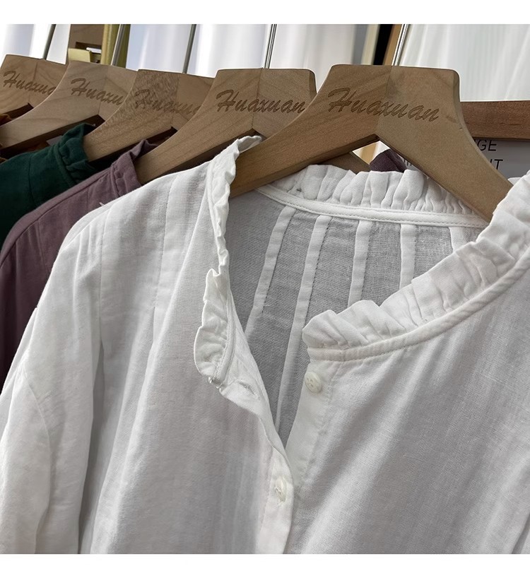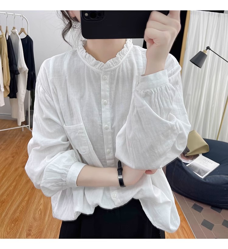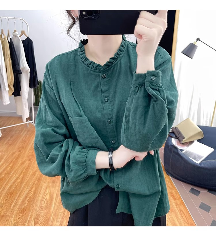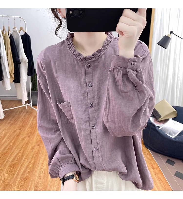 【长袖棉麻衬衣】春秋季宽松减龄上衣 复古荷叶领打底衫衬衫外穿