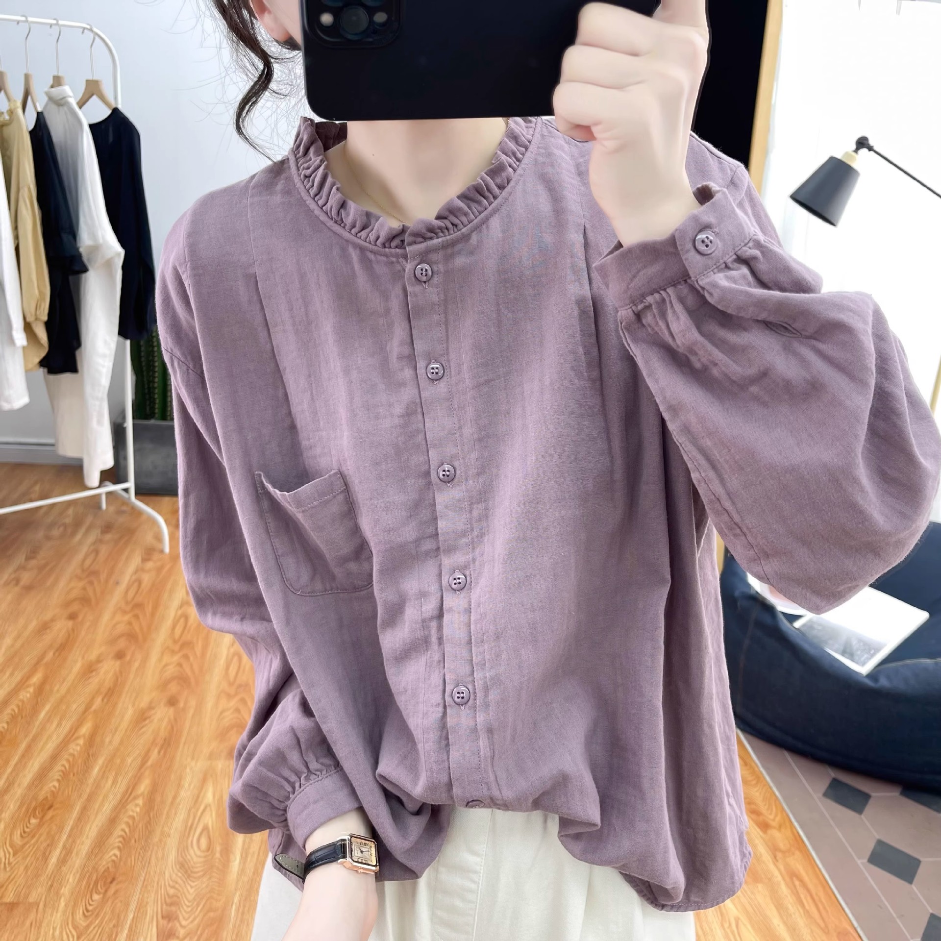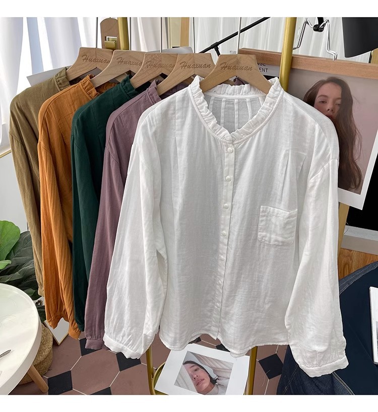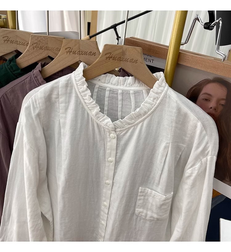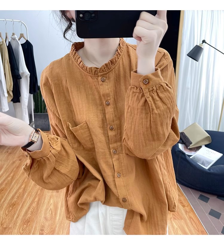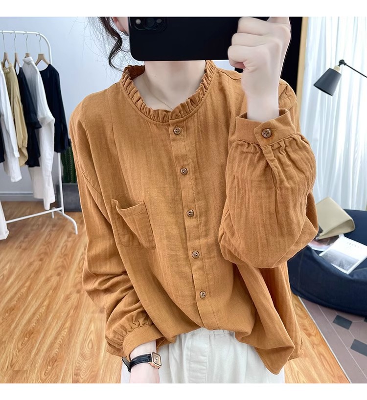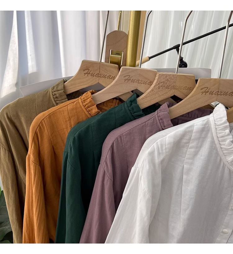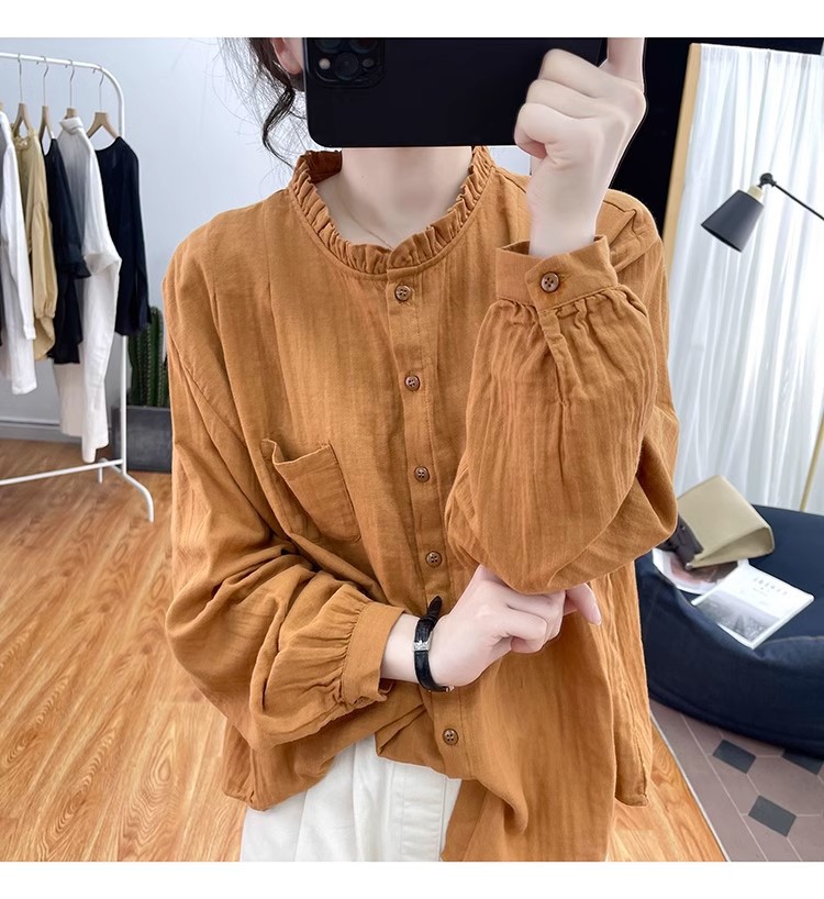【长袖棉麻衬衣】春秋季宽松减龄上衣 复古荷叶领打底衫衬衫外穿
