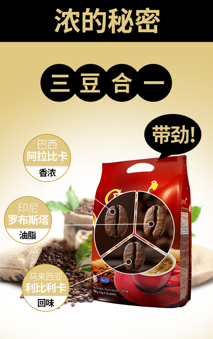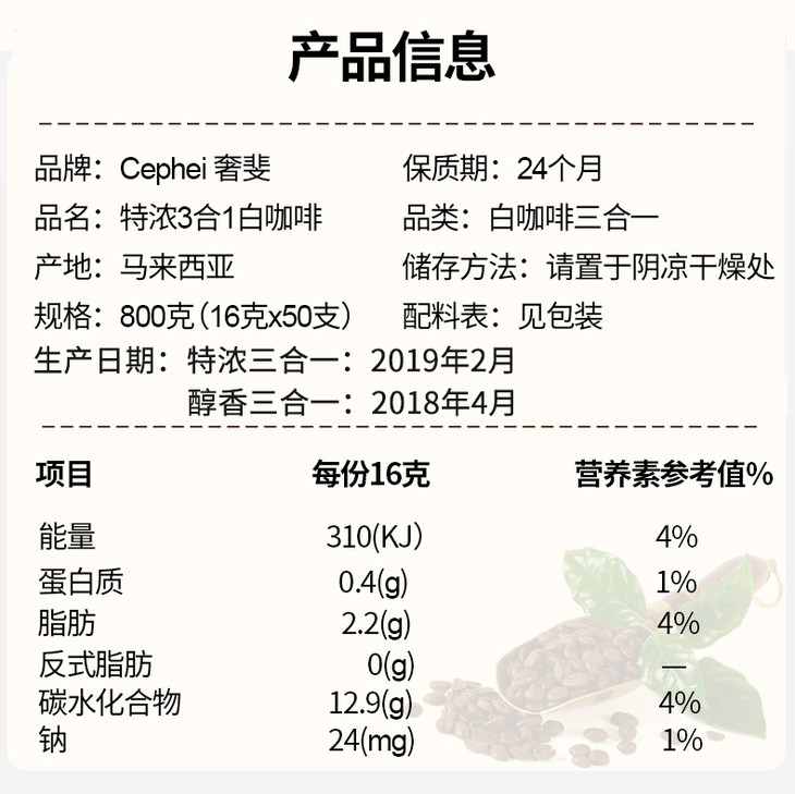 CEPHEI奢斐奢啡马来西亚进口白咖啡粉特浓三合一原味提神速溶咖啡条装 特浓咖啡800g50杯