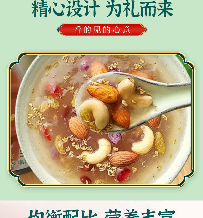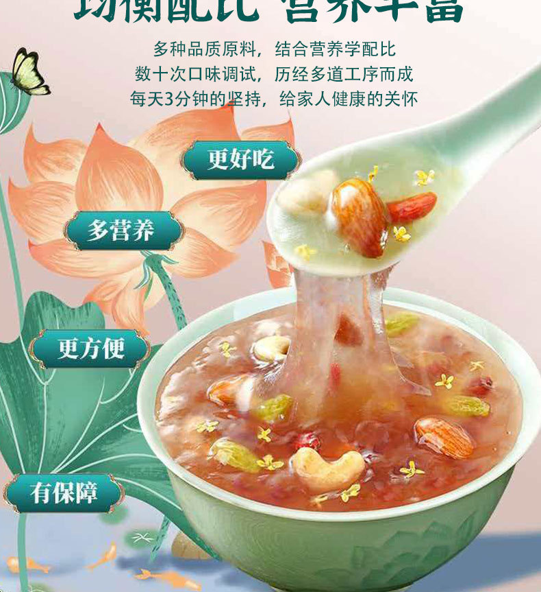 【配料】速浴藕粉(食用葡萄糖、木薯淀粉、麦芽糖精、藕粉、红枣粉)、葡萄干、蔓越莓干(蔓越莓、白砂葵花籽油)、腰果仁、巴旦木、红枣圈、枸杞 桂花