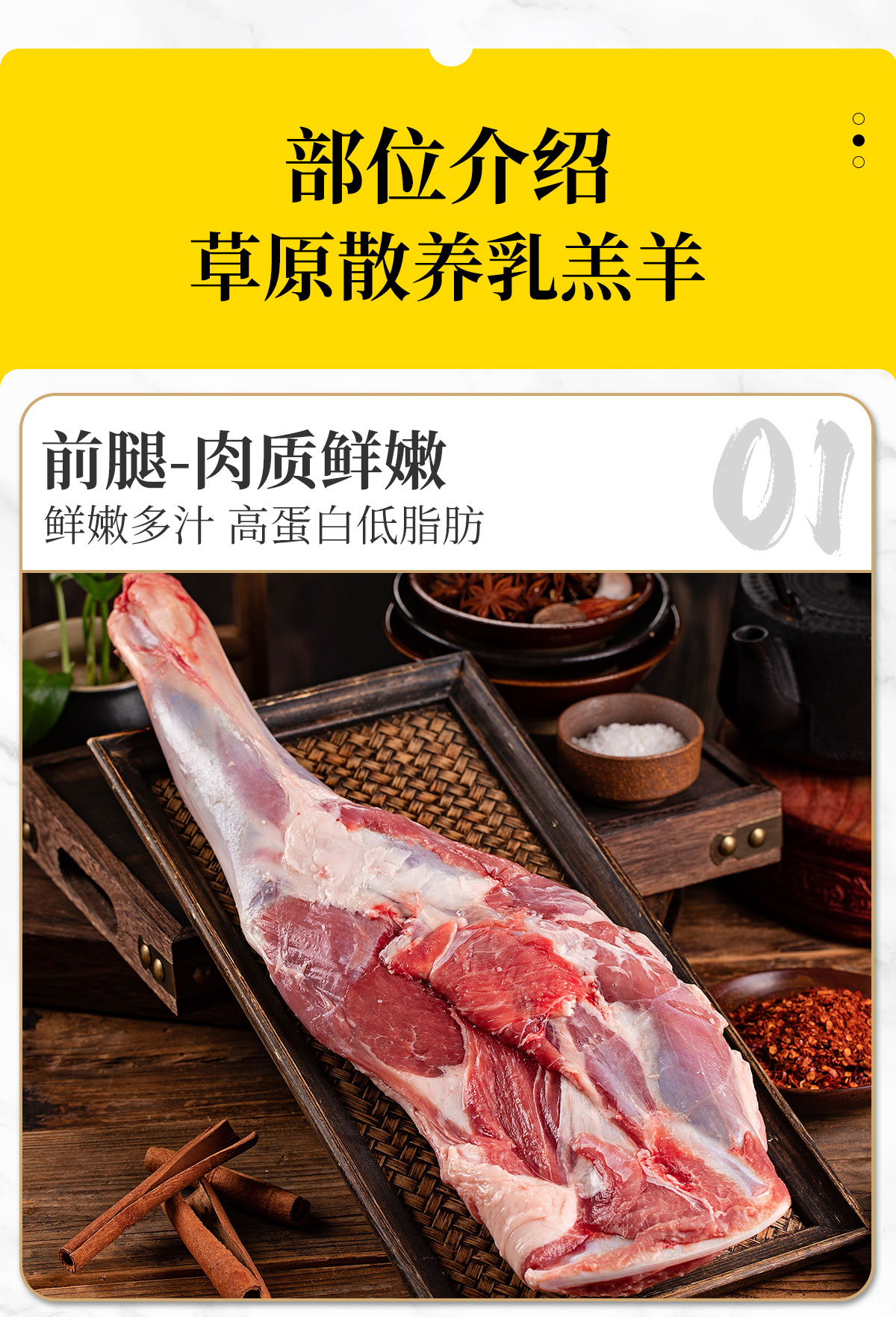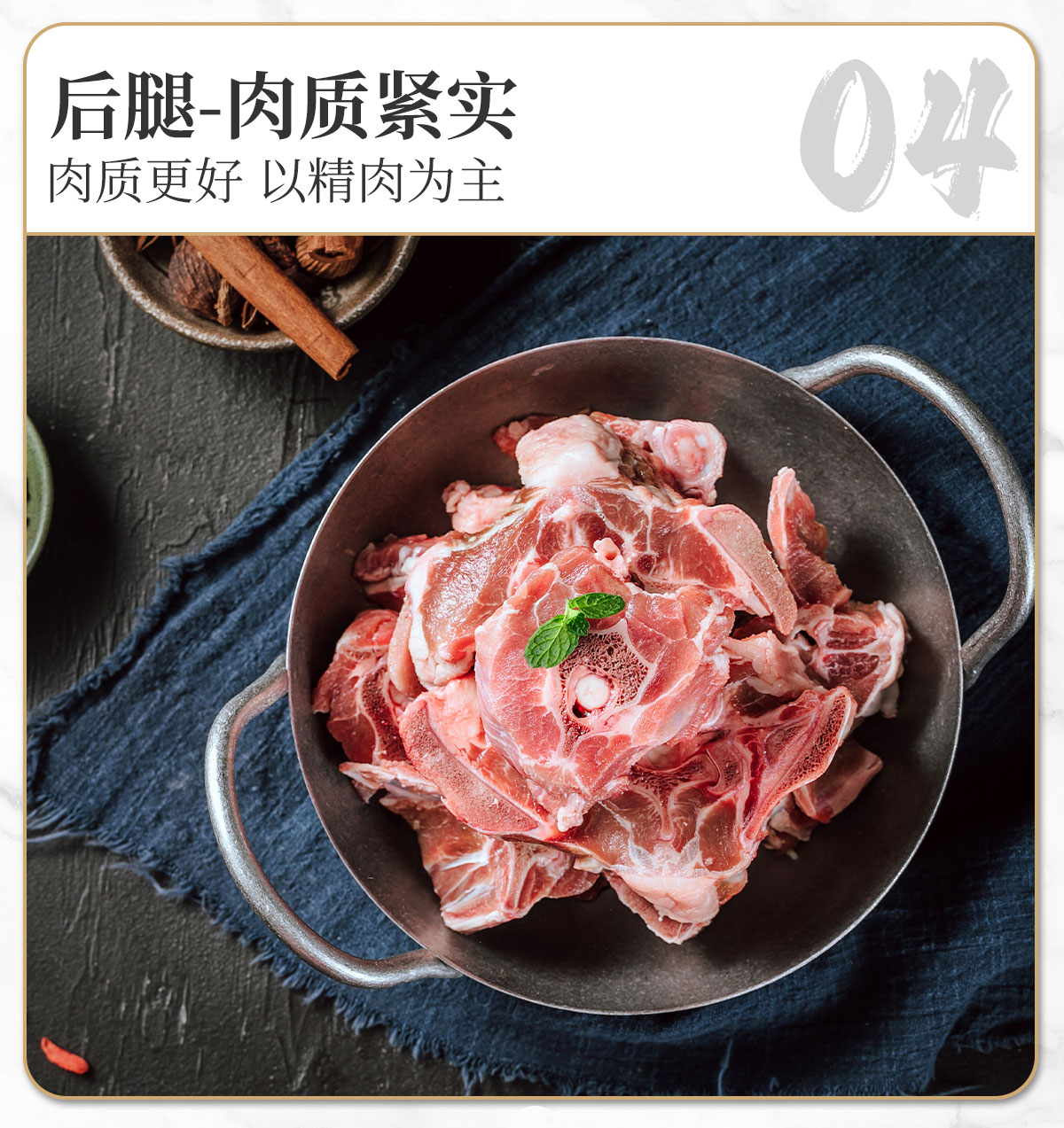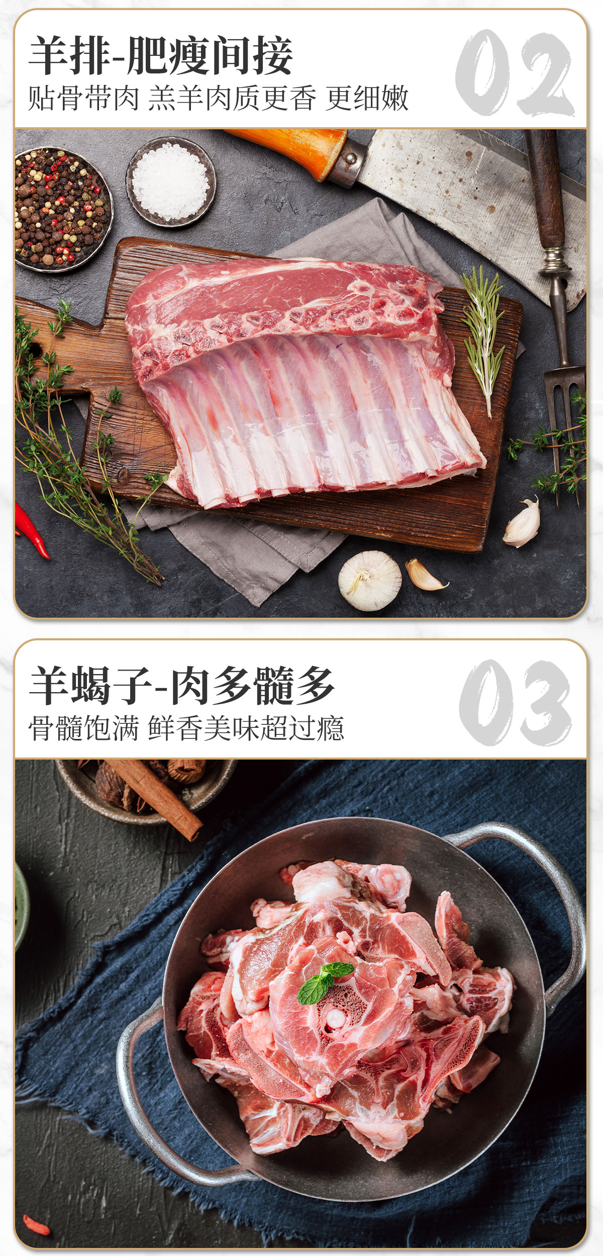 羊排块2.5斤,羊前腿块2.5斤,羊后腿块3斤,羊蝎子2斤