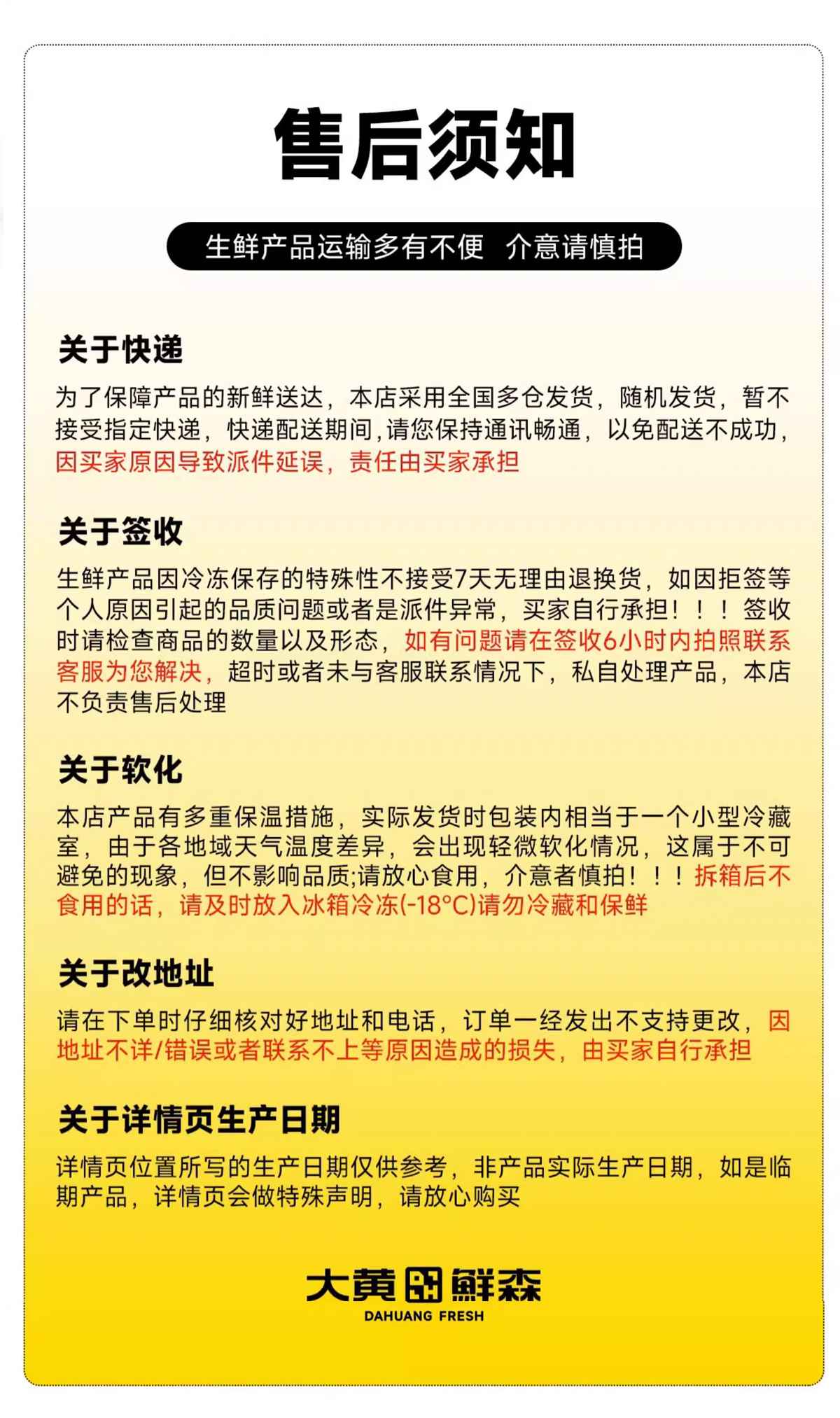 四、退换货及售后政策:生鲜产品不支持 7 天无理由退换货,不支持拦截拒收和改地址,产品签收后有问题6小时内联系客服处理