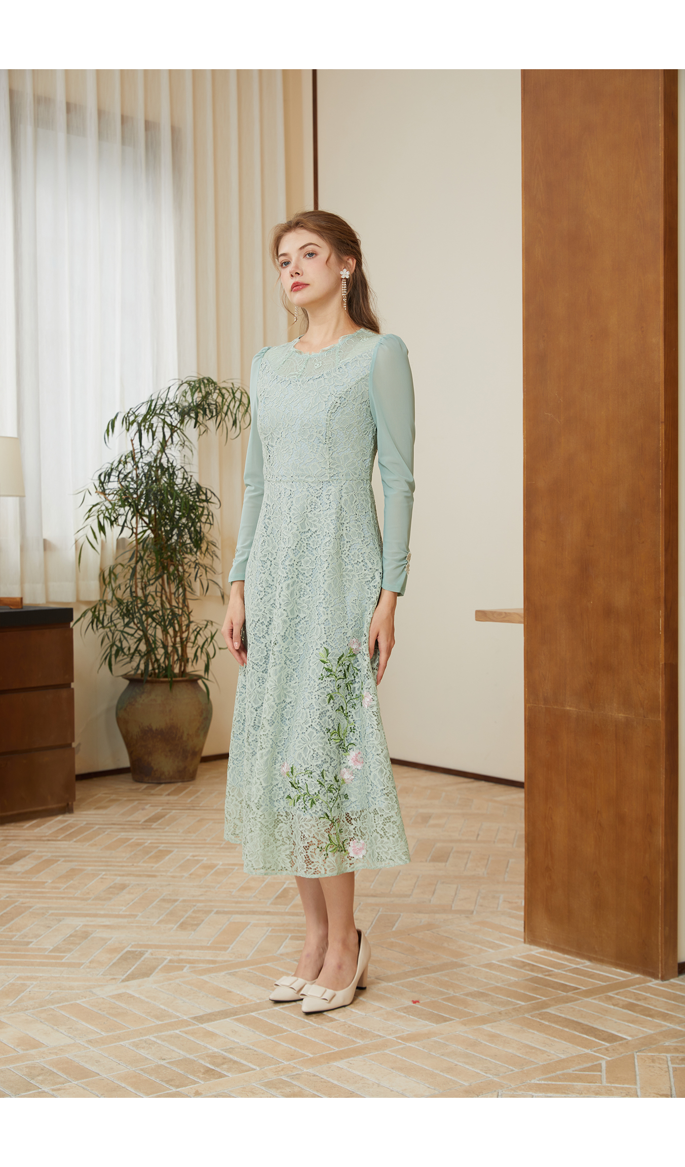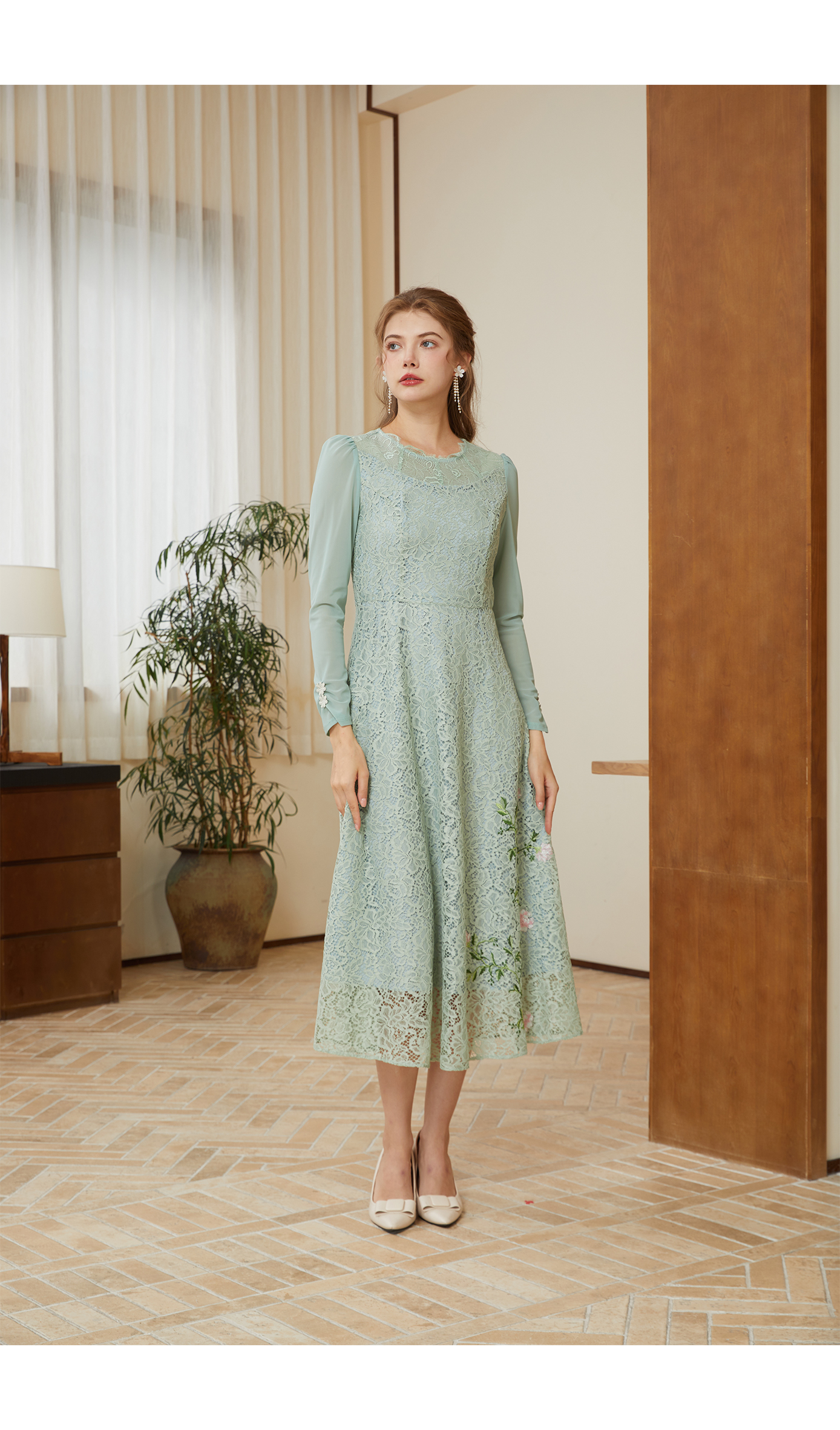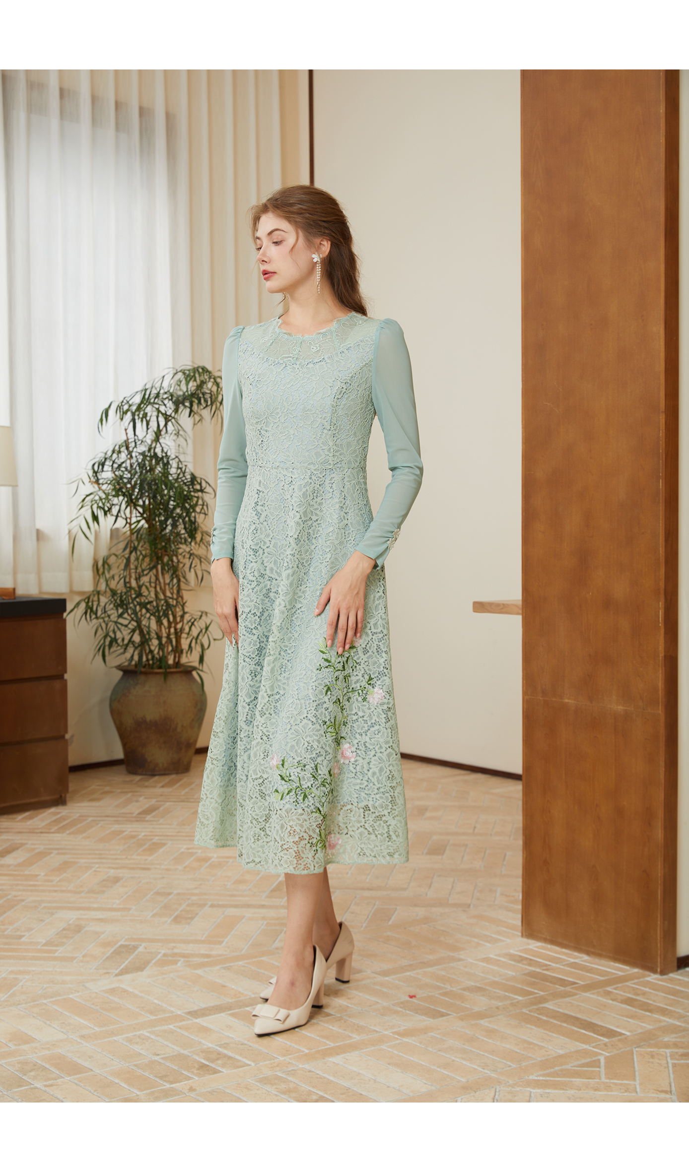 司歌蕾丝长袖连衣裙刺绣中长裙春秋A901095X