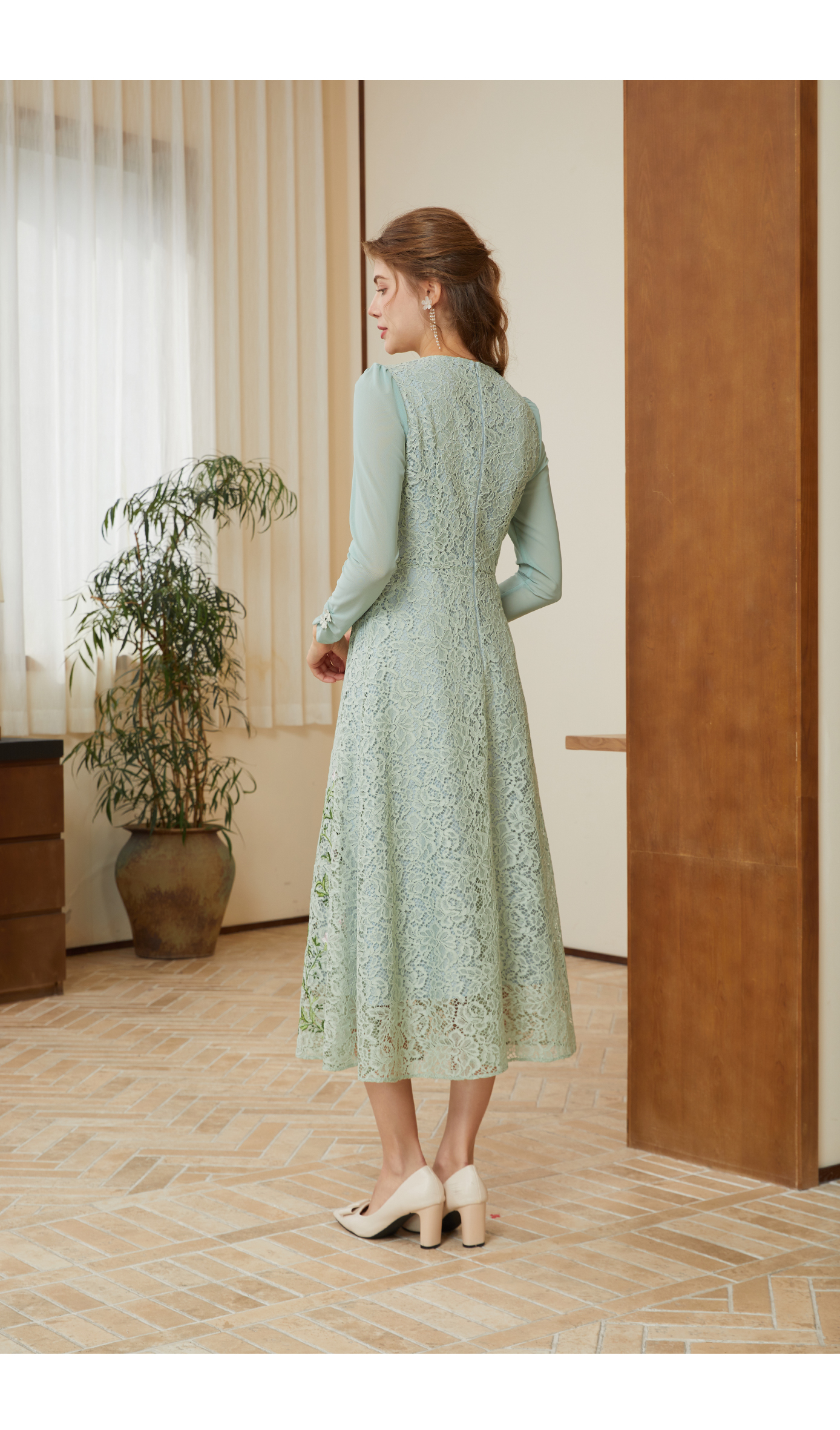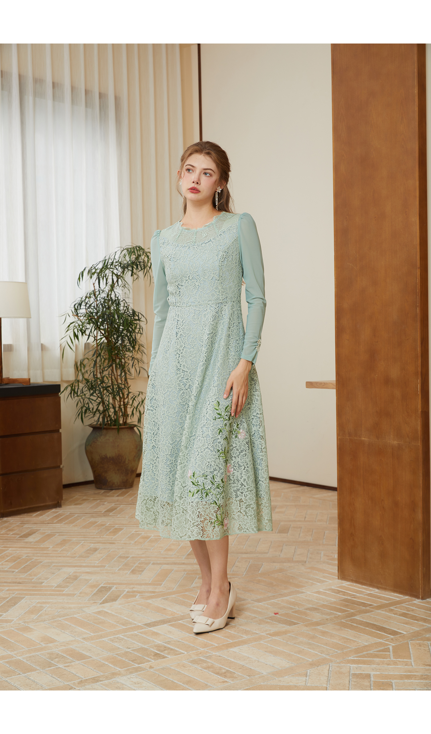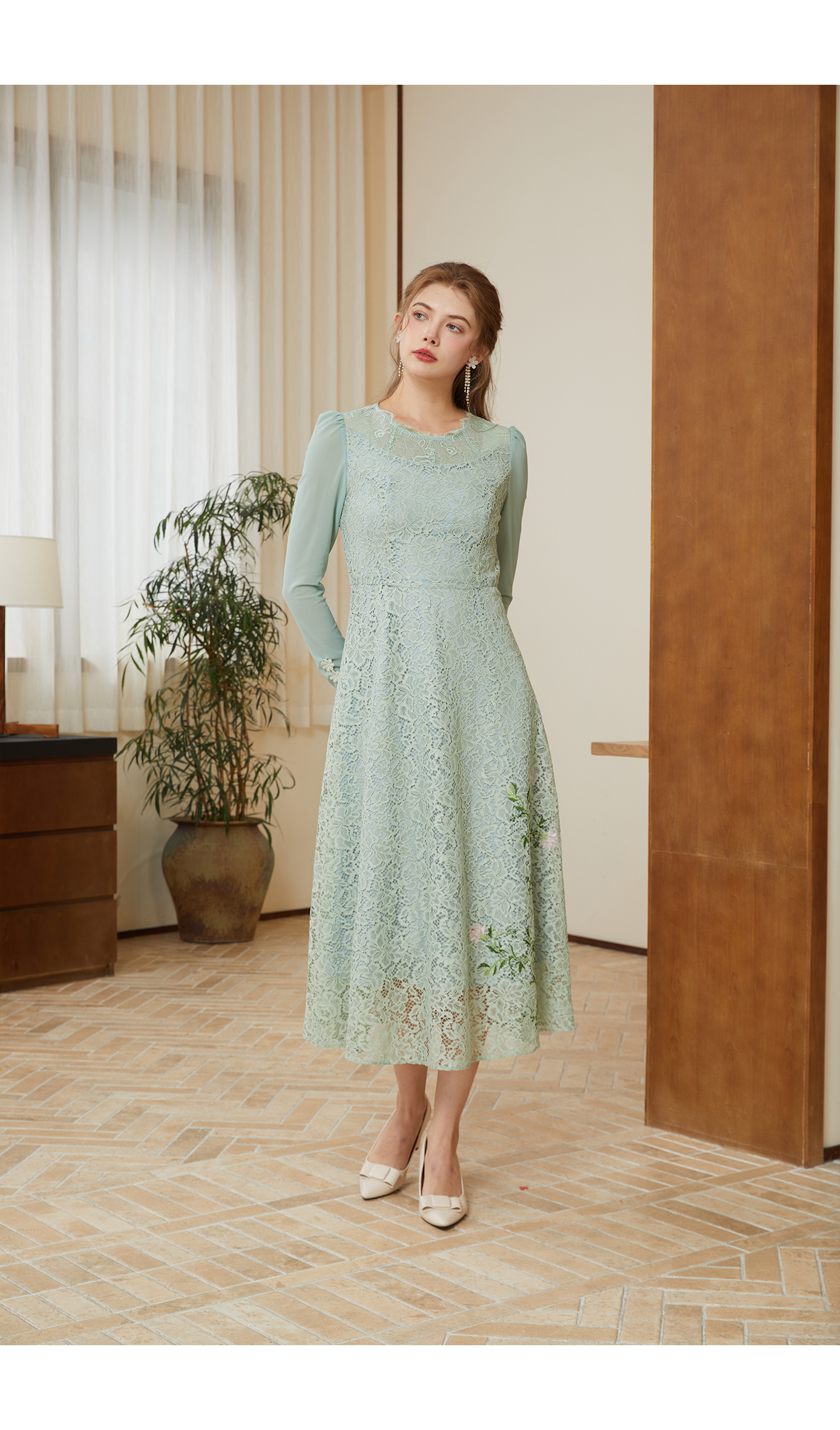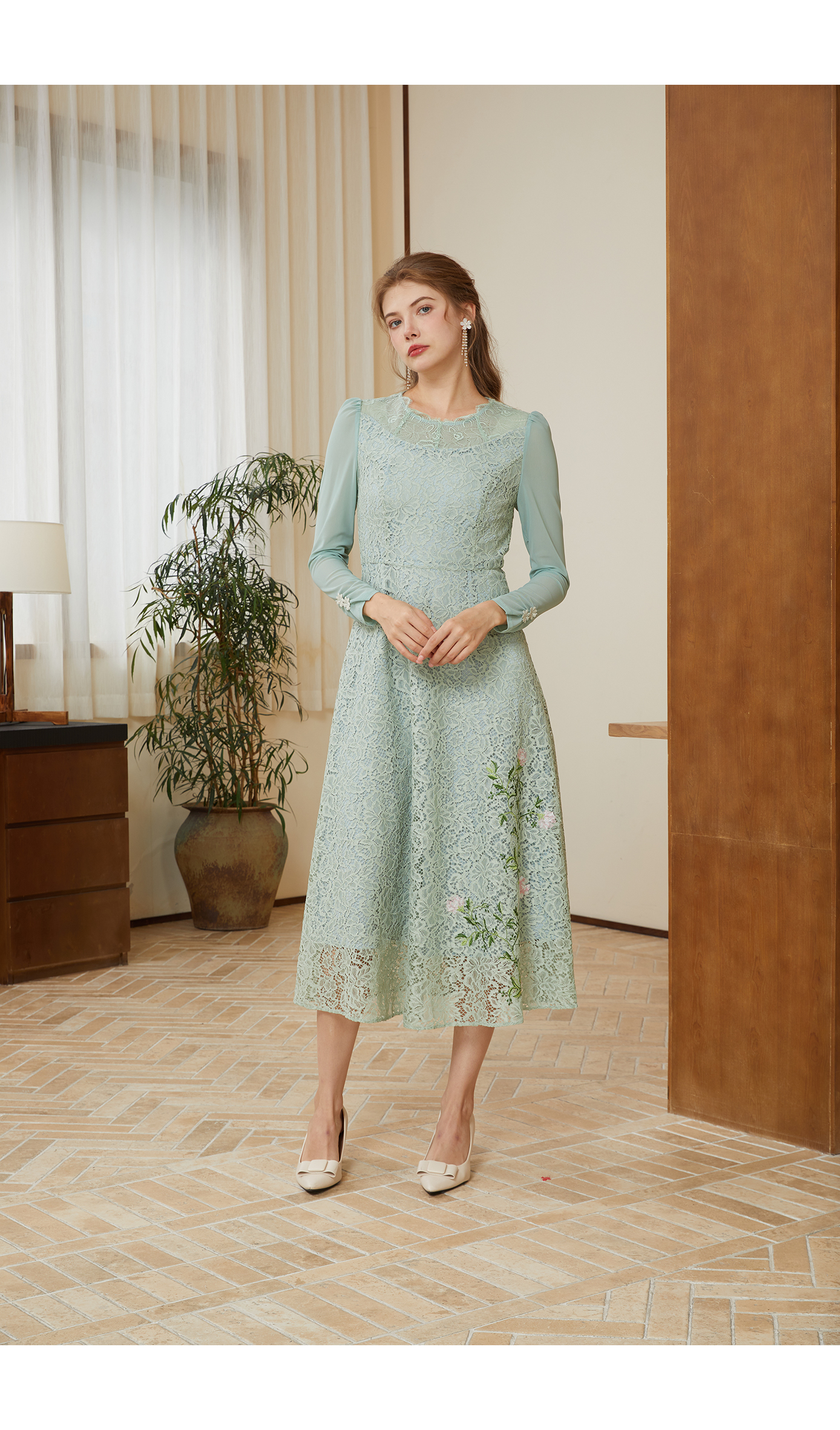 司歌蕾丝长袖连衣裙刺绣中长裙春秋A901095X