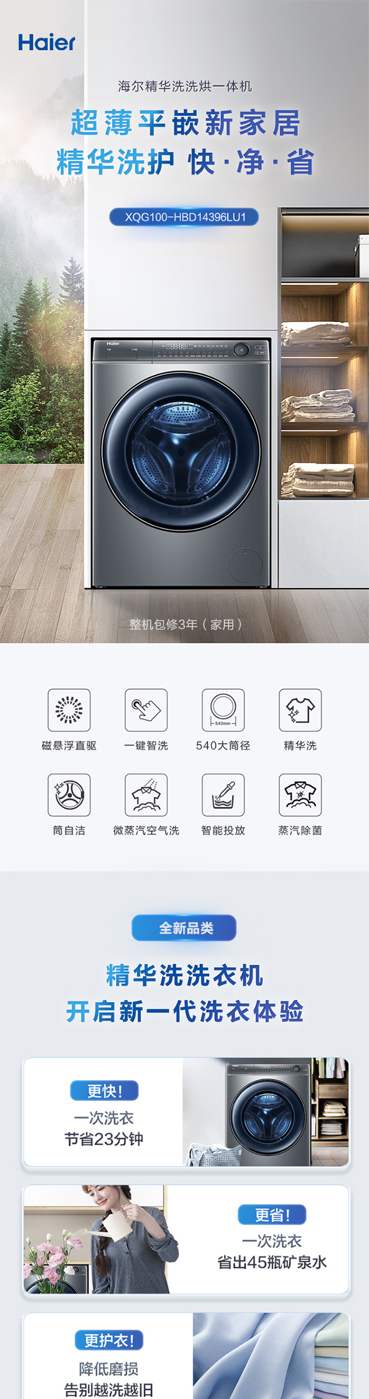 海尔精华洗洗衣机 10公斤洗烘一体机 超薄540超大筒径滚筒洗衣机XQG100-HBD14396LU1