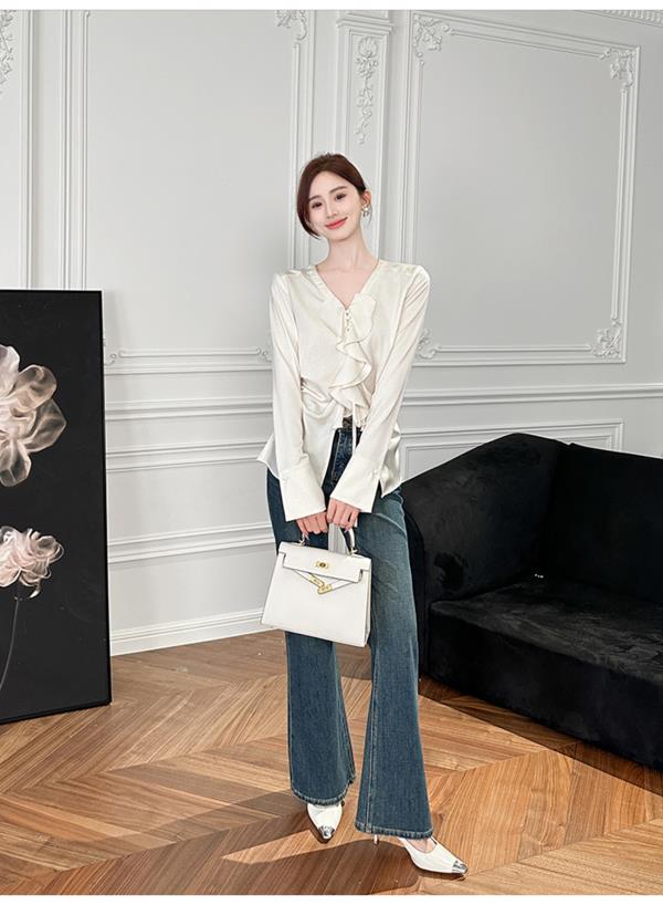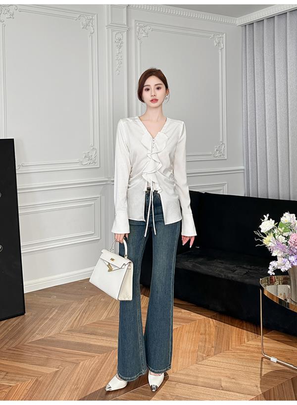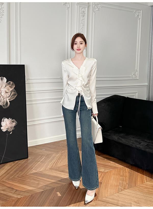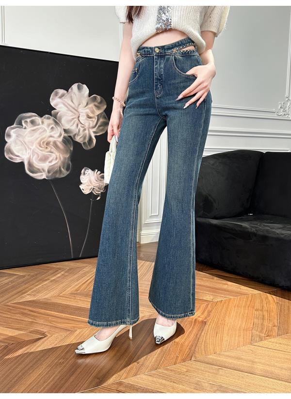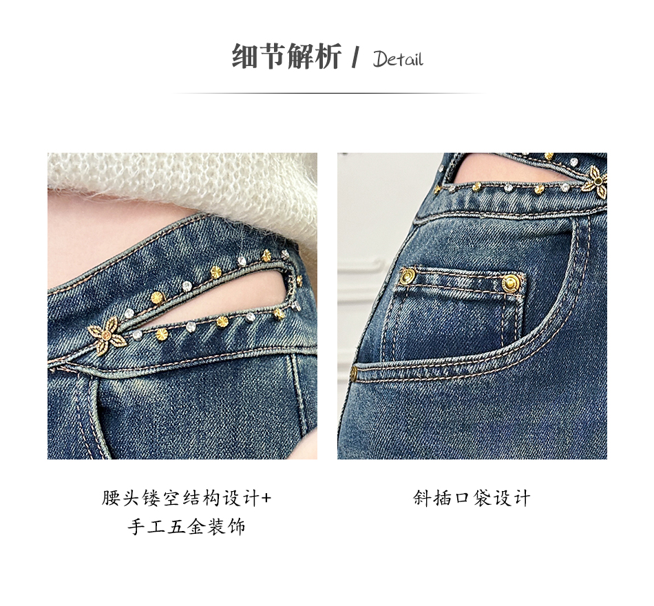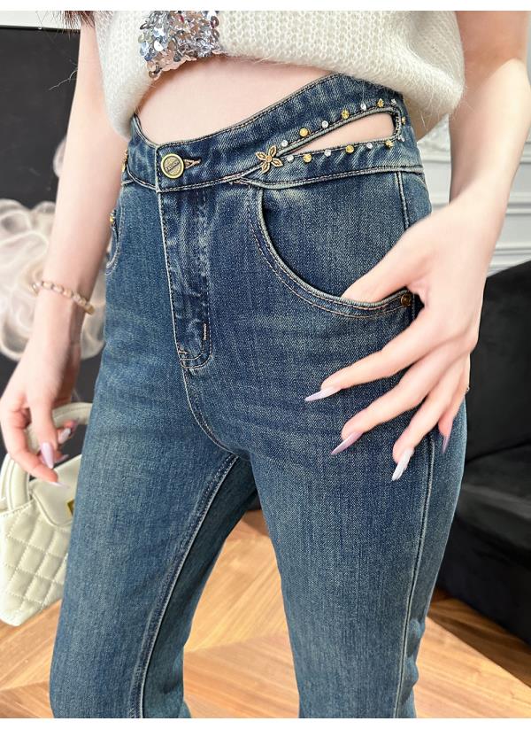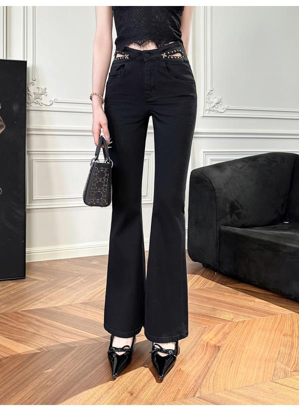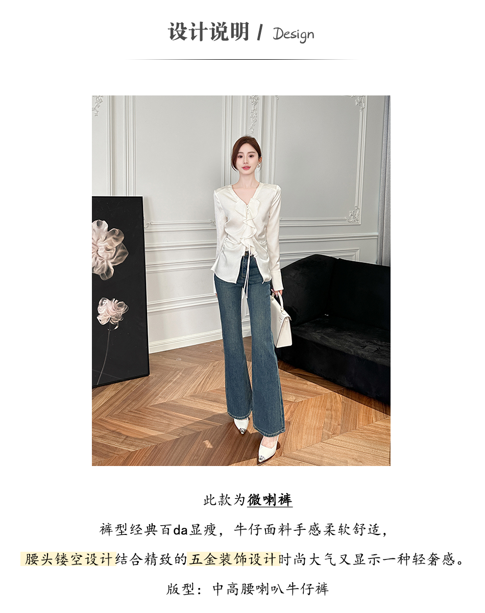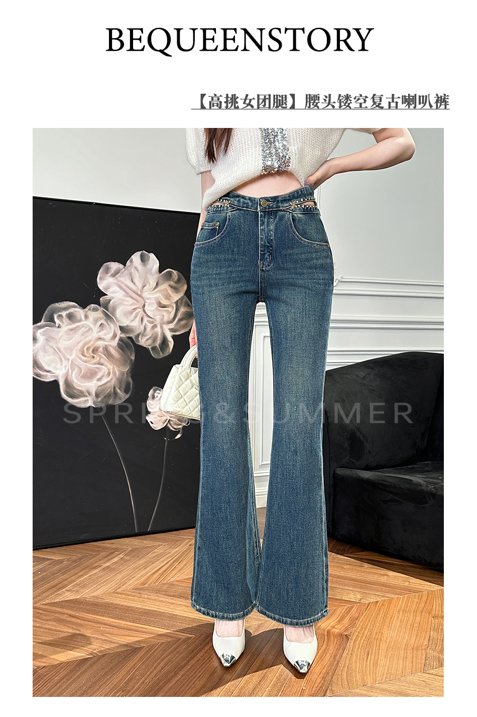 BeQueenStory【高挑女团腿】时尚腰头镂空复古中高腰喇叭裤牛仔裤