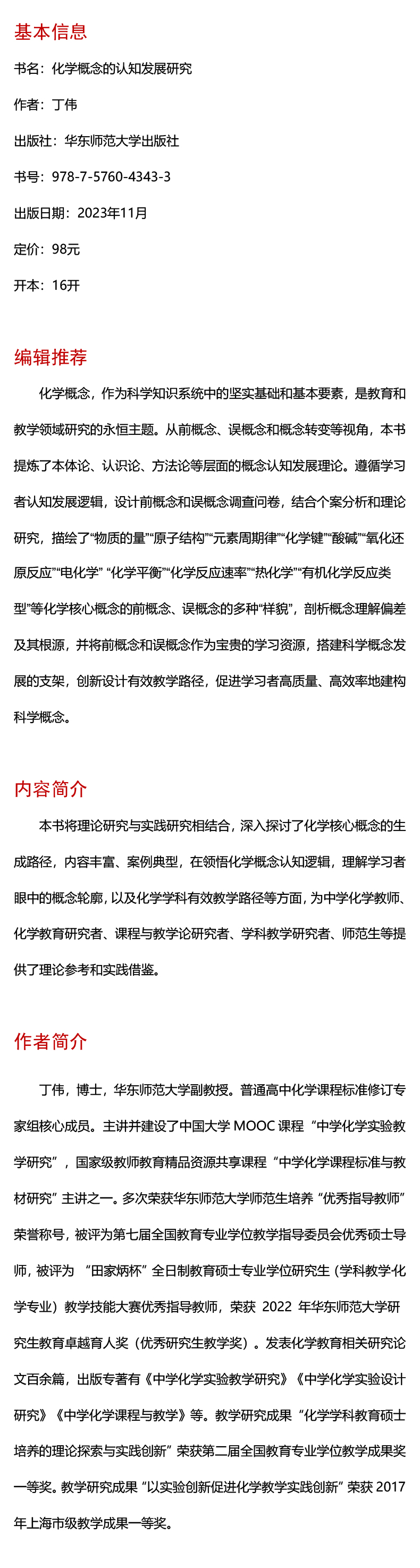 聚焦化学领域大概念展开认知研究,通过创新设计调查工具,透视出了学习者头脑中前概念和误概念的精细轮廓;创新设计了以前概念和误概念为认知支架的大概念教学路径,显著提升了学习者转化生成科学概念的学习效率。本书聚焦于中学化学课程核心概念,遵循学习者认知发展逻辑,创新设计调查问卷,结合个案分析、文献理论研究,探查透视出学习者个人头脑中的化学前概念和误概念的各种“面貌”;立足于科学大概念的思想范式,从一般认识论、领域知识论的视角,据此概念轮廓为认知支架,创新设计多种有效教学路径,帮助学习者高效率高质量地建构科学概念。