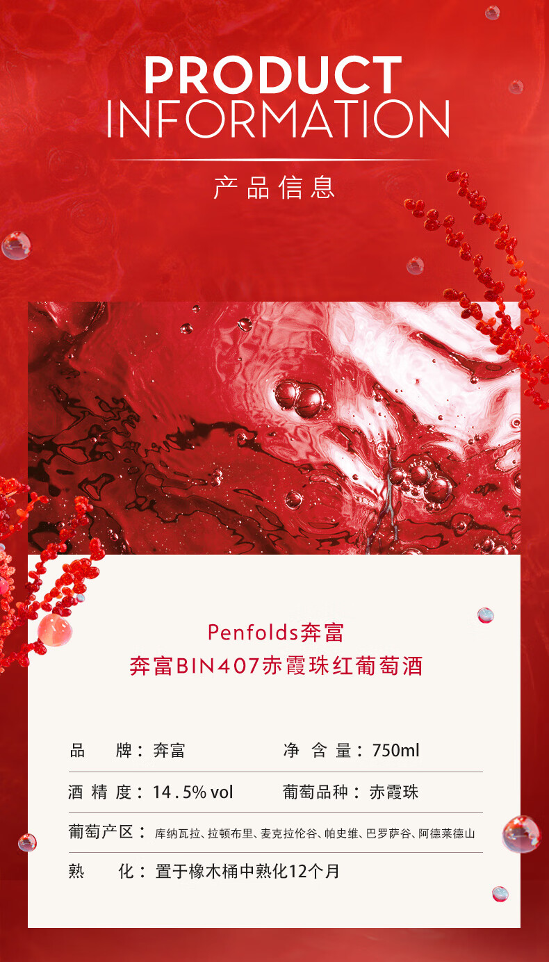 奔富Bin407赤霞珠葡萄酒750ml/010938 口感平易近人带有淡淡的黑巧克力苦味