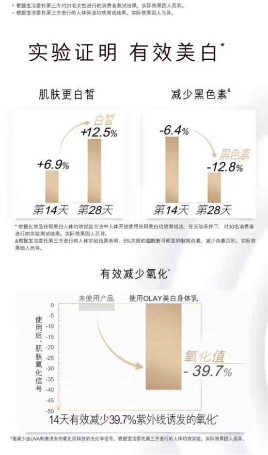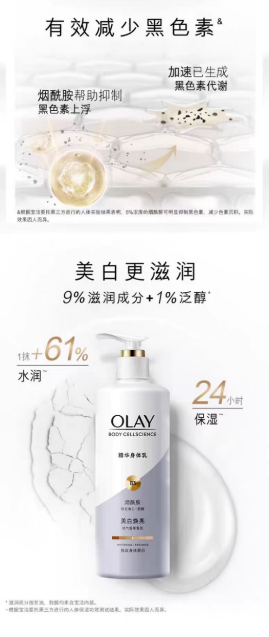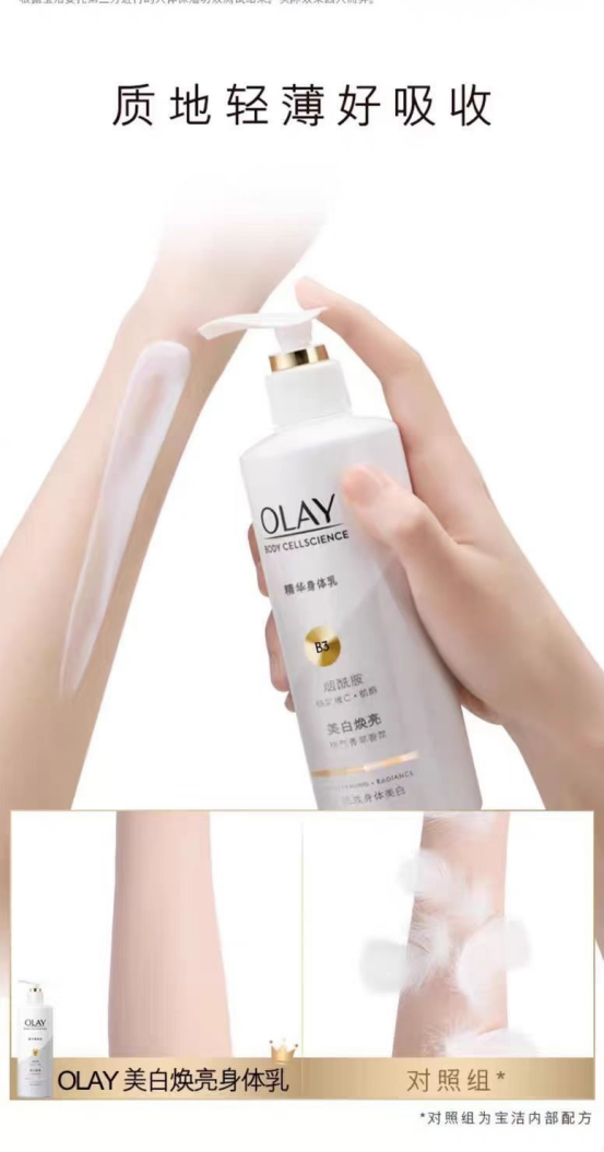 每天勤勤恳恳给脸部护肤,捯饬的精致透亮 忽略了黑不溜秋的身体! 从脖子开始就是明暗交界线... 夏天穿吊带膝盖、胳膊时的暗沉更是无处可藏 olay美白全家桶速速用起来啊啊啊!! 从去年开始我一瓶接着一瓶回购用到现在 不夸张...全身起码亮了有一个度!!!!
