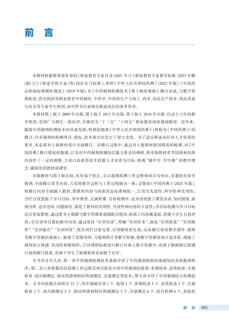 本次修订的重点:一是内容上要传承创新,同时根据新出台的国家政策法规、《中国药典》等对教材进行更新,并解决职业教育聚焦的新问题,以保证教材内容的先进性;二是继续坚持“三基”“五性”“三特定”的原则,进一步优化主体框架设计,做到固基础,打破升学“天花板”,强实践,传承技术技能,培养大国工匠;三是丰富栏目模块,切实做到课证融合;四是体现理实一体,提高学生实践能力;五是优化版式设计,兼容不同学时需求,可以尝试活页式教材编写;同时将思想政治教育润物细无声地融入教材,激发学生的爱国主义情怀以及大国工匠精神。 在提高可读性方面采取以下措施:一是根据各门课程的特点,采用案例导入、问题引领等编写方式,使教材更加生动且更贴合岗位实际,增加学生的学习兴趣;二是多配图表,形象直观,便于教师讲授与学生理解;三是采用纸质教材为载体的融合教材形式,运用二维码技术将教学需要的补充内容做成数字资源,形成线上线下的多维学习模式。