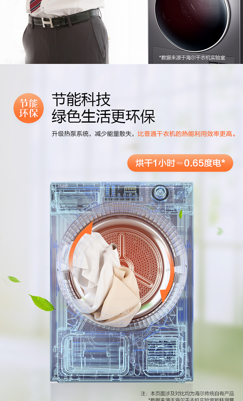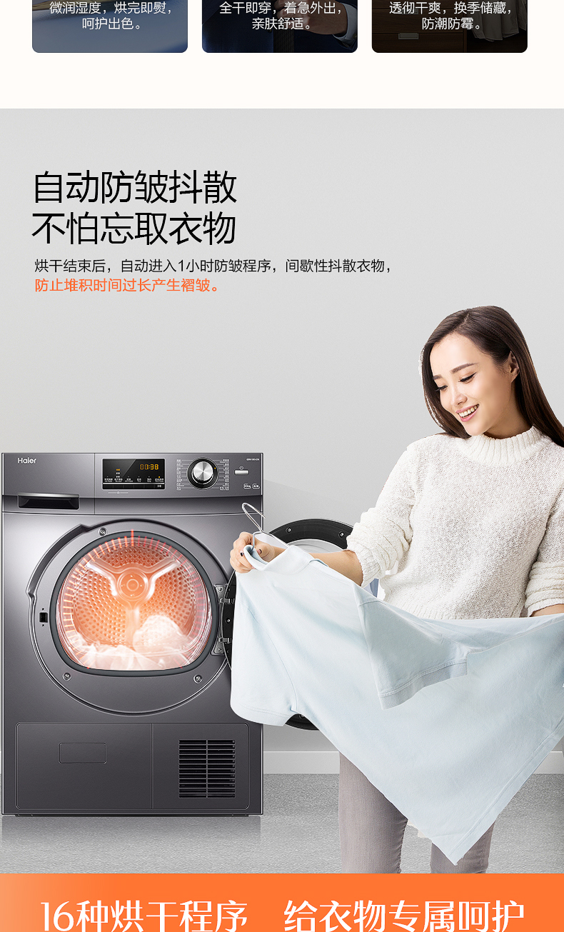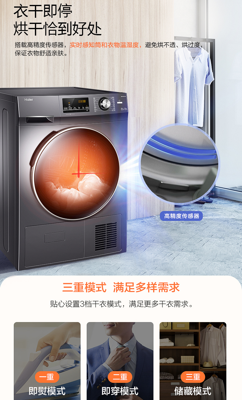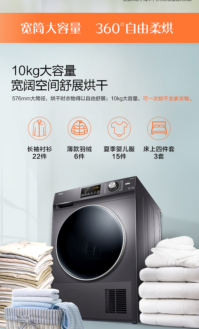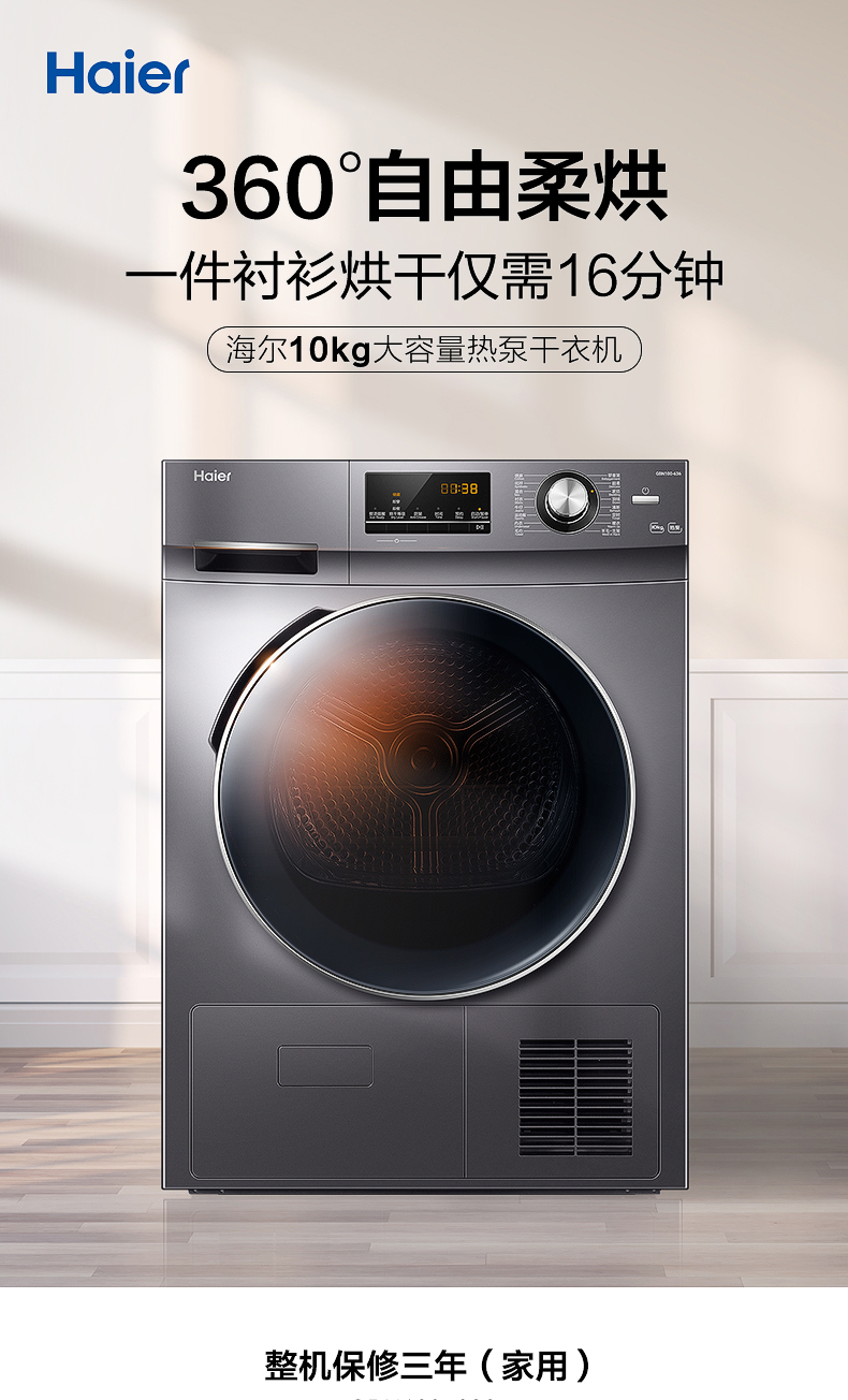 海尔热泵式烘干机 10KG大容量 家用干衣机热泵衣物护理机 除菌 节能 衣干即停 GBN100-636