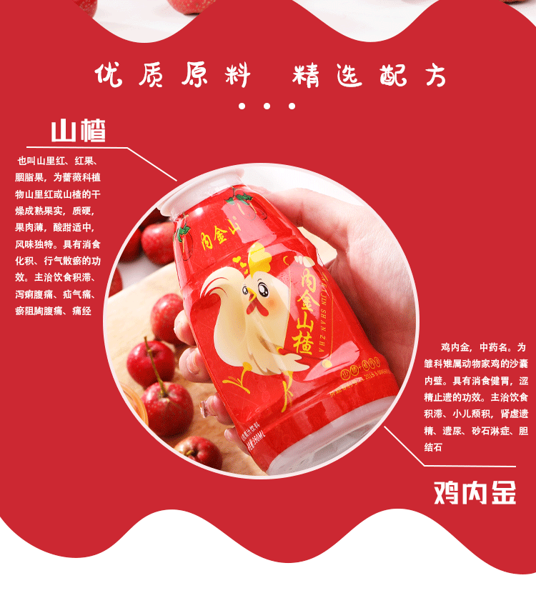 1.臻选山东临沂优质山楂,人工采摘,特别添加中药·鸡内金,与山楂完美融合,药食同源,双重呵护人体健康。