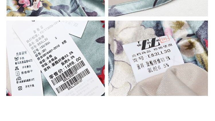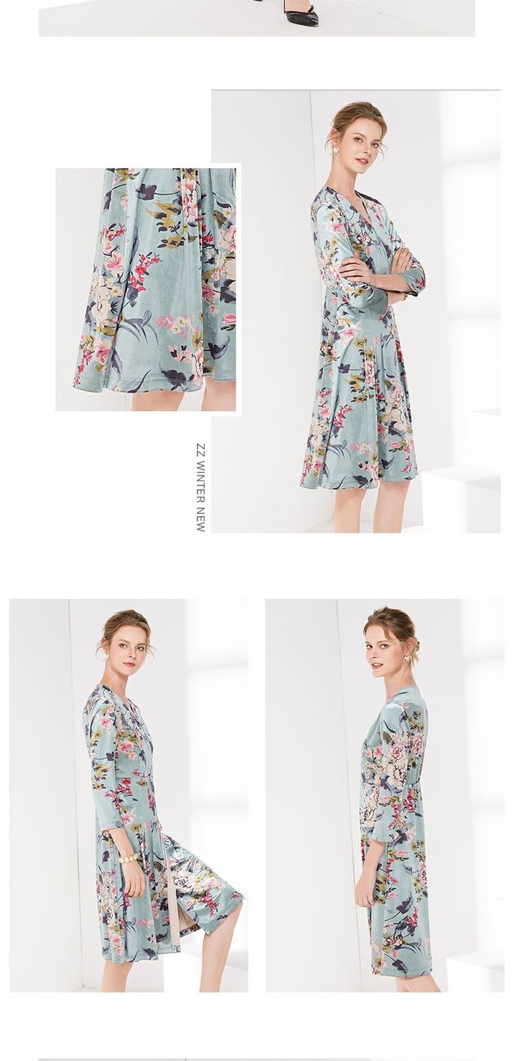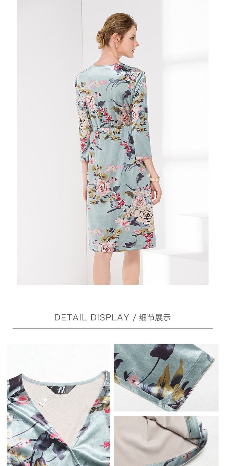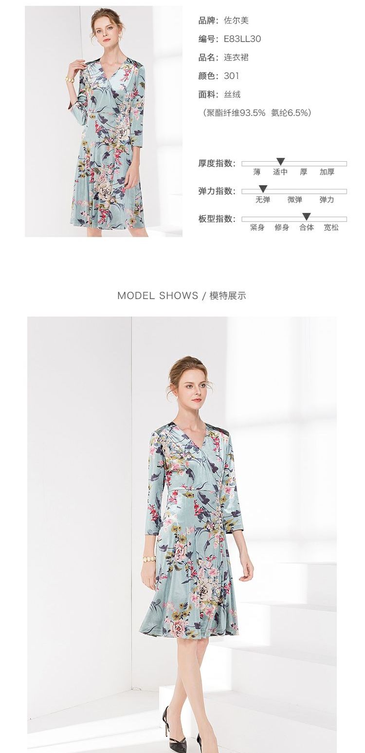 佐尔美新品秋季新品女士印花丝绒中长袖修身显瘦连衣裙E83LL30