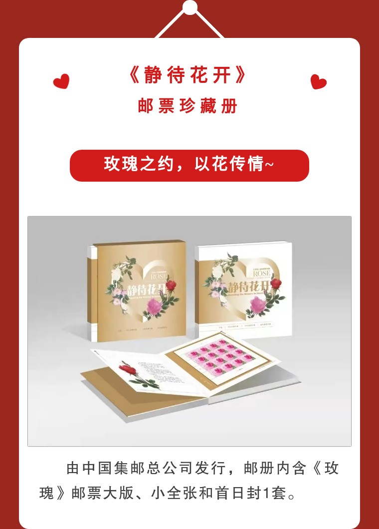 邮册设计上,以象征爱情的心形为基础,将玫瑰围绕在心形图案之上,突出玫瑰主题,暖暖的黄色调也彰显了玫瑰的温暖、爱情的美好。