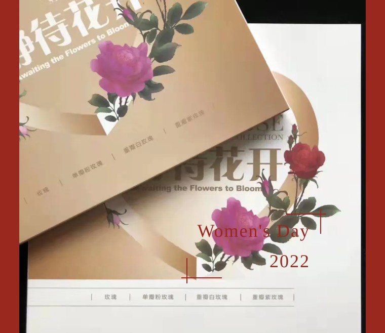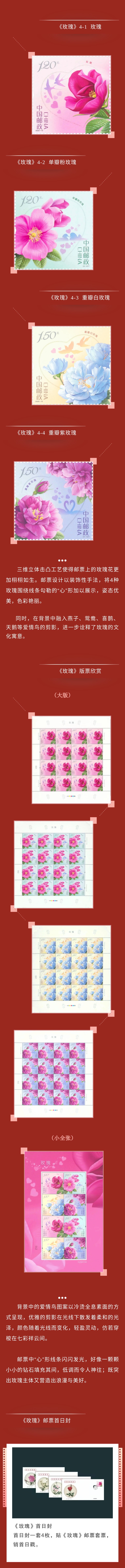 邮册内《玫瑰》邮票图案分别由:玫瑰、单瓣粉玫瑰、重瓣白玫瑰、重瓣紫玫瑰组成。