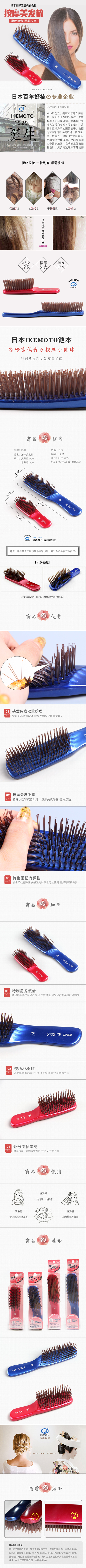 日本进口品牌池本按摩梳按摩头皮发梳大号便携式按摩梳子 WHJC