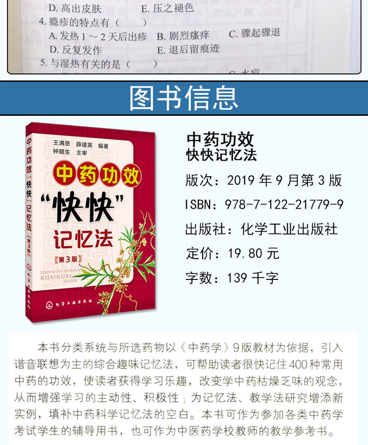 《中医诊断快快记忆法》以新版《中医诊断学》教材为依据,引入谐音联想为主的综合趣味记忆法,可帮助读者很快记住中医诊断学内容,使读者获得学习乐趣,改变学中医诊断学枯燥乏味的观念,从而增强学习的主动性、积极性;为记忆法、教学法研究增添新实例,填补中医诊断学记忆法的空白。《中医诊断快快记忆法》可作为参加各类中医学考试学生的辅导用书,也可作为各类中医药学校教师的教学参考书。