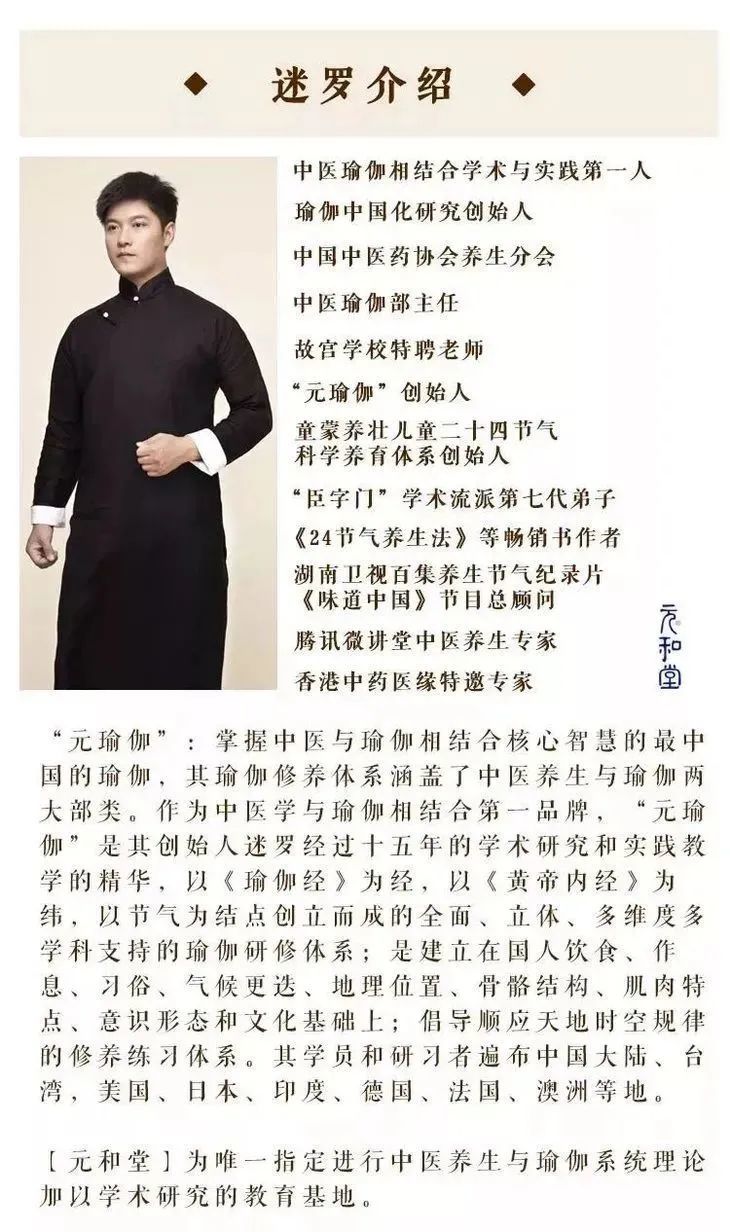 “迷罗老师是中国第一位研究中医养生和瑜伽相结合并且用于实践教学与指导生活的人,虽然年轻却是瑜伽中国化道路上的领航者。做了大量研究,也做了很多踏踏实实的工作,反复研磨终成体系,很了不起。我的观众们都很喜欢迷罗老师,我们都深深的感受到元瑜伽是全面、立体、多维度的瑜伽养生网络体系,非常契合中国人的所有生命状态和我们的民族文化。”