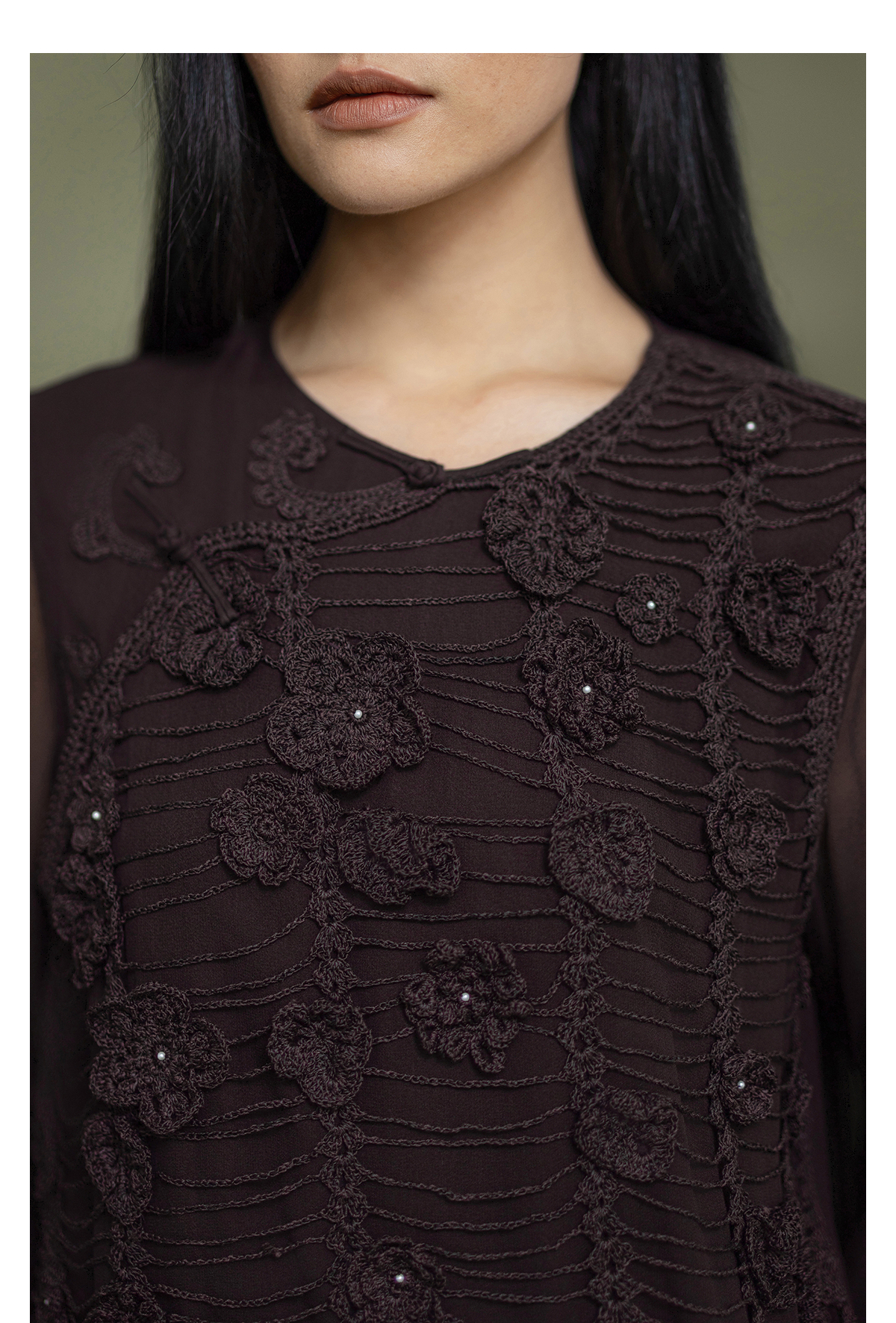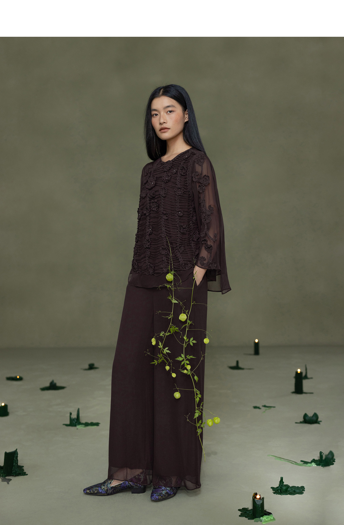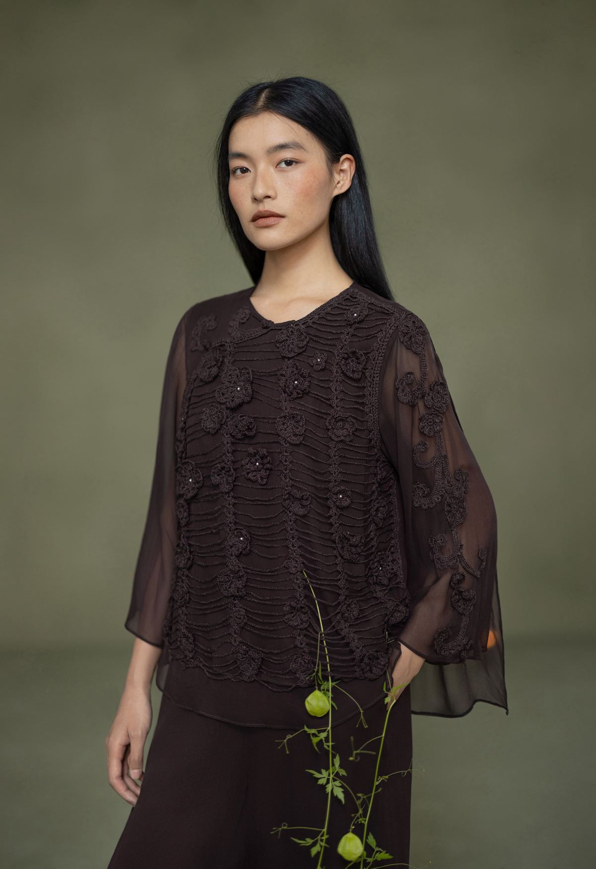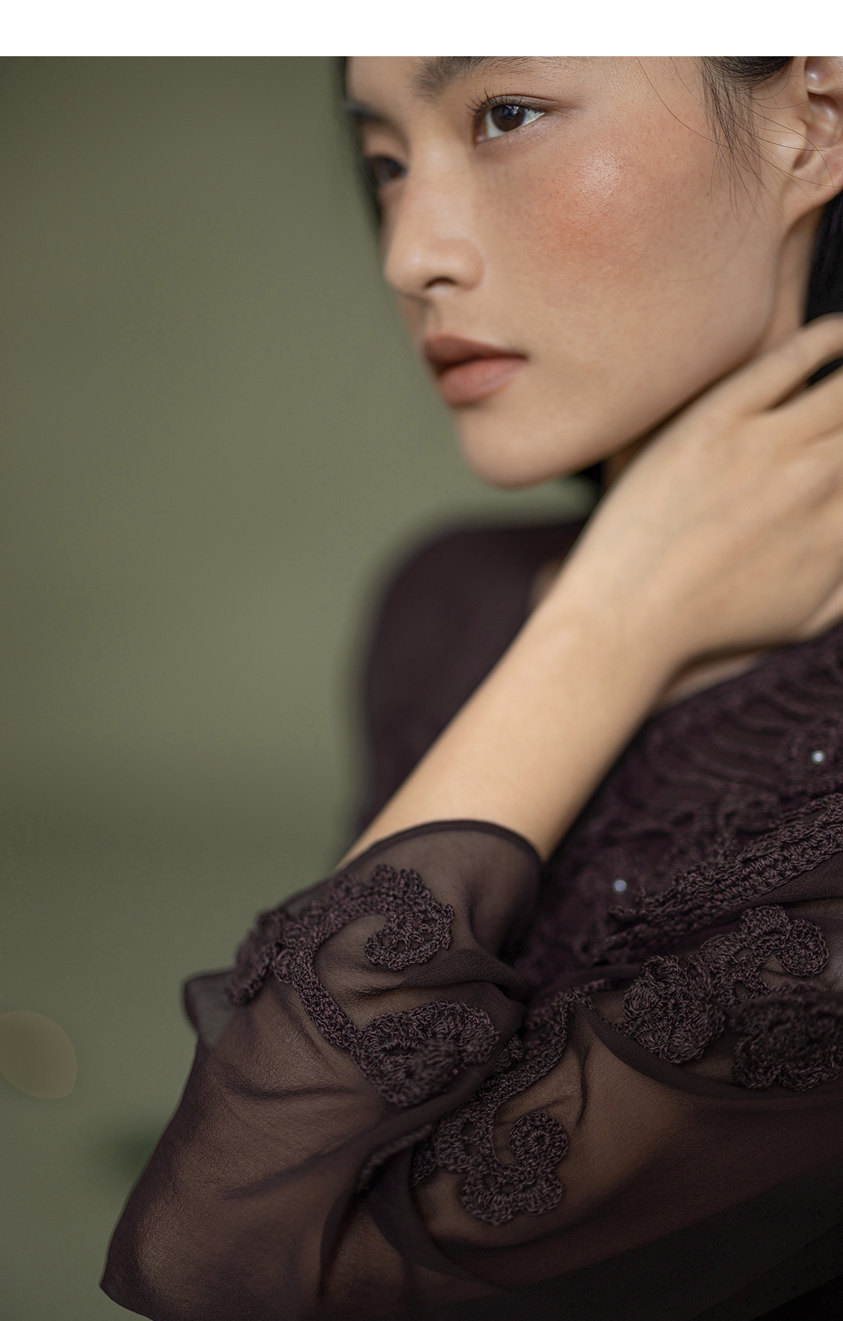 【林栖设计小店】手工钩花|鎏光溯影流木紫桑蚕丝拼飞片飘逸2026春新款国风真丝衫1961016