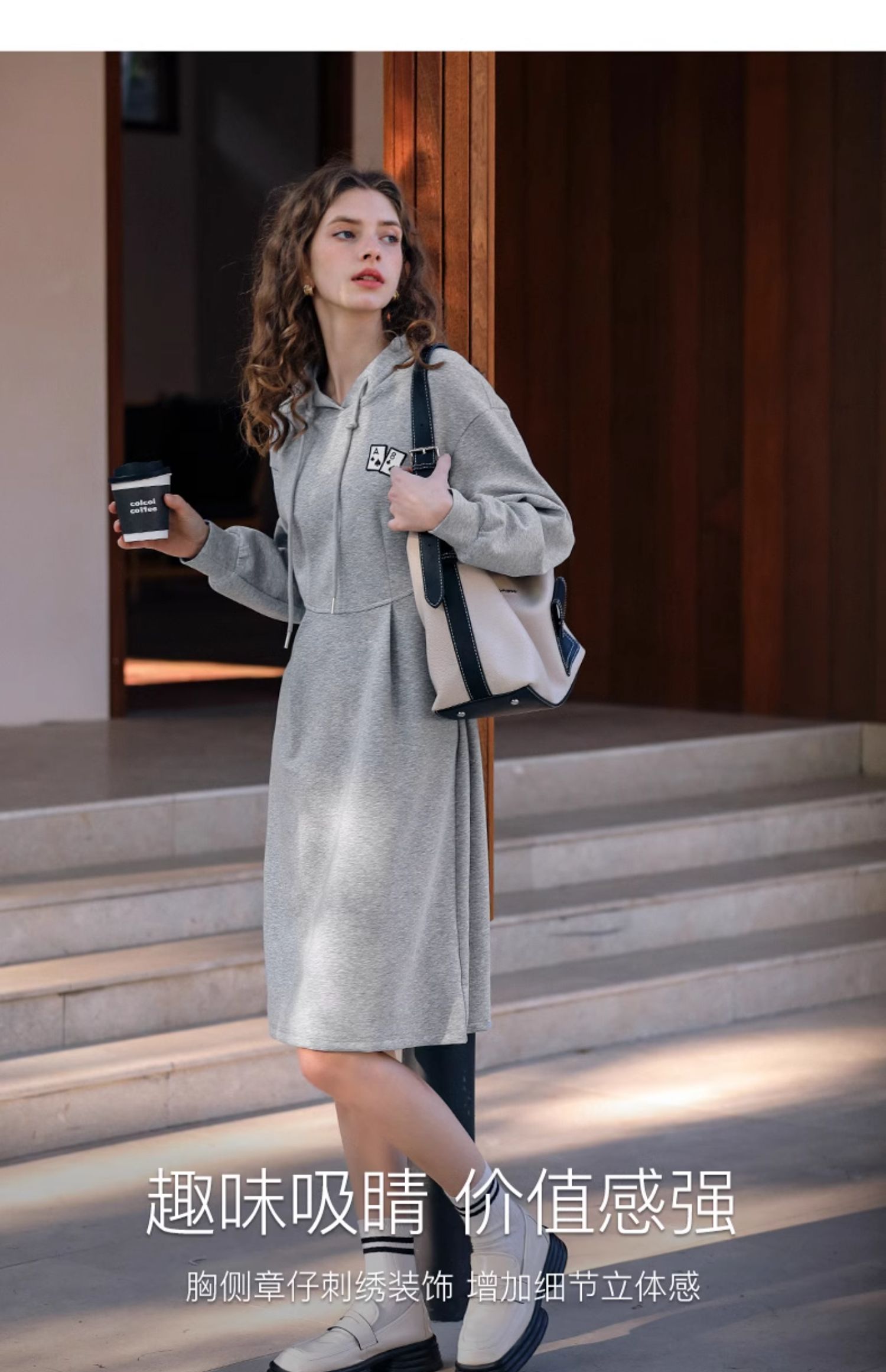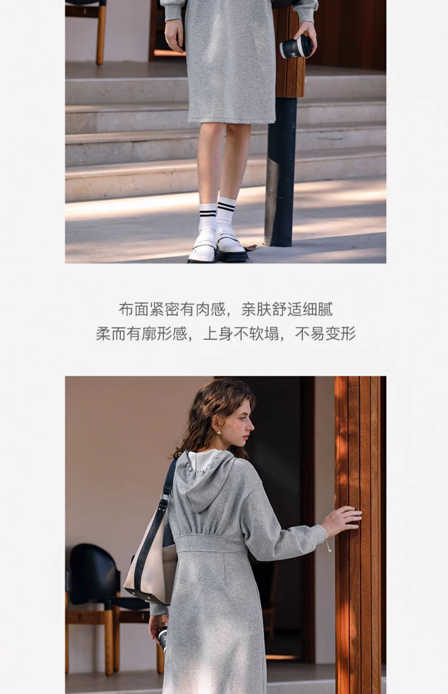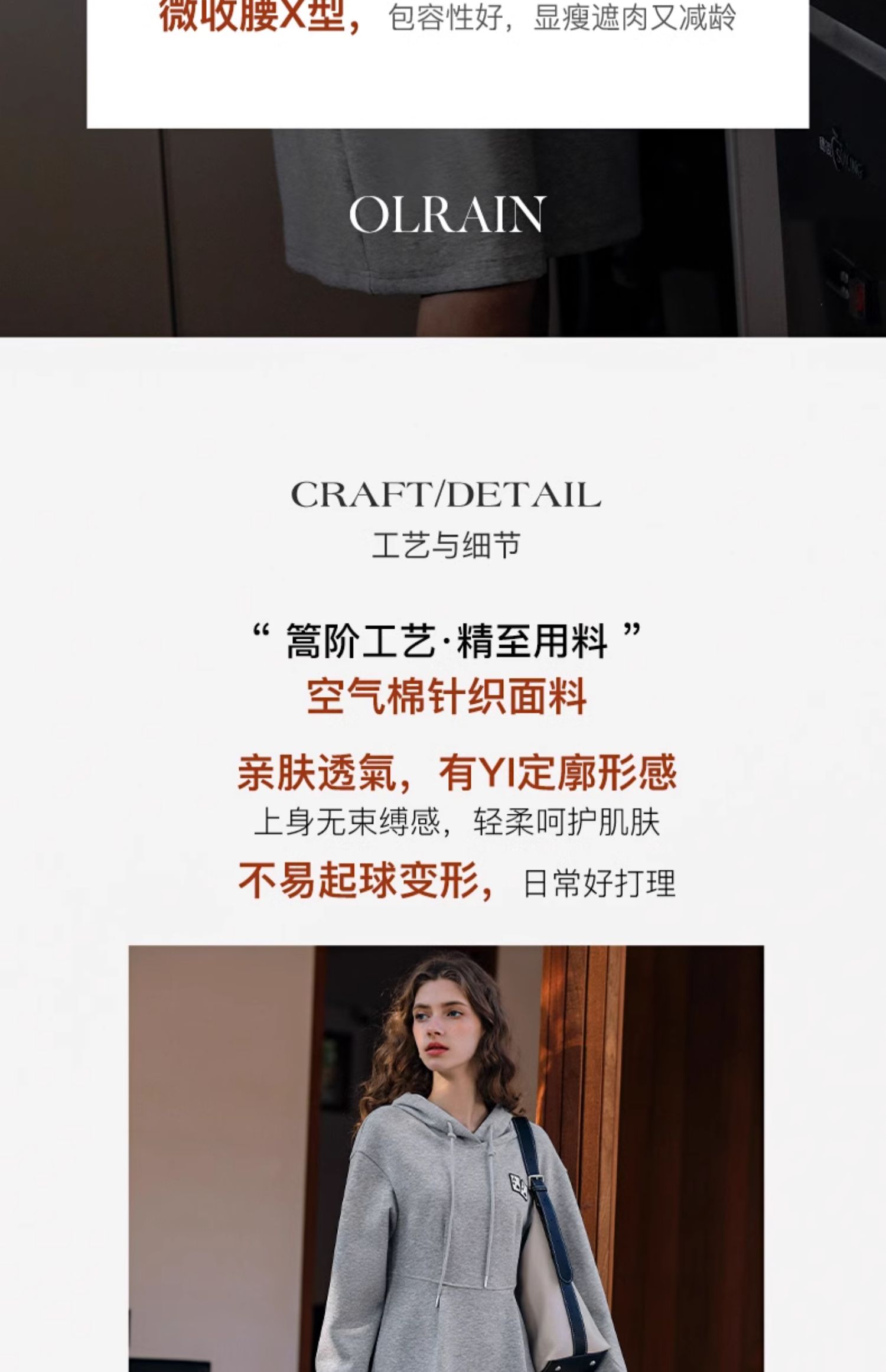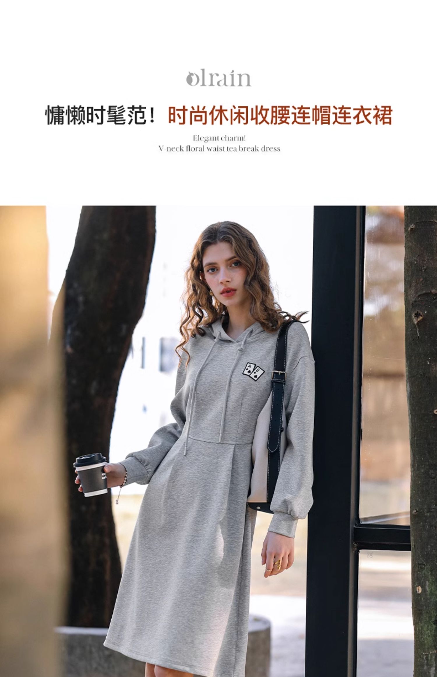 OLrain欧芮儿浅灰色休闲连衣裙女春季2024年新款收腰连帽针织裙