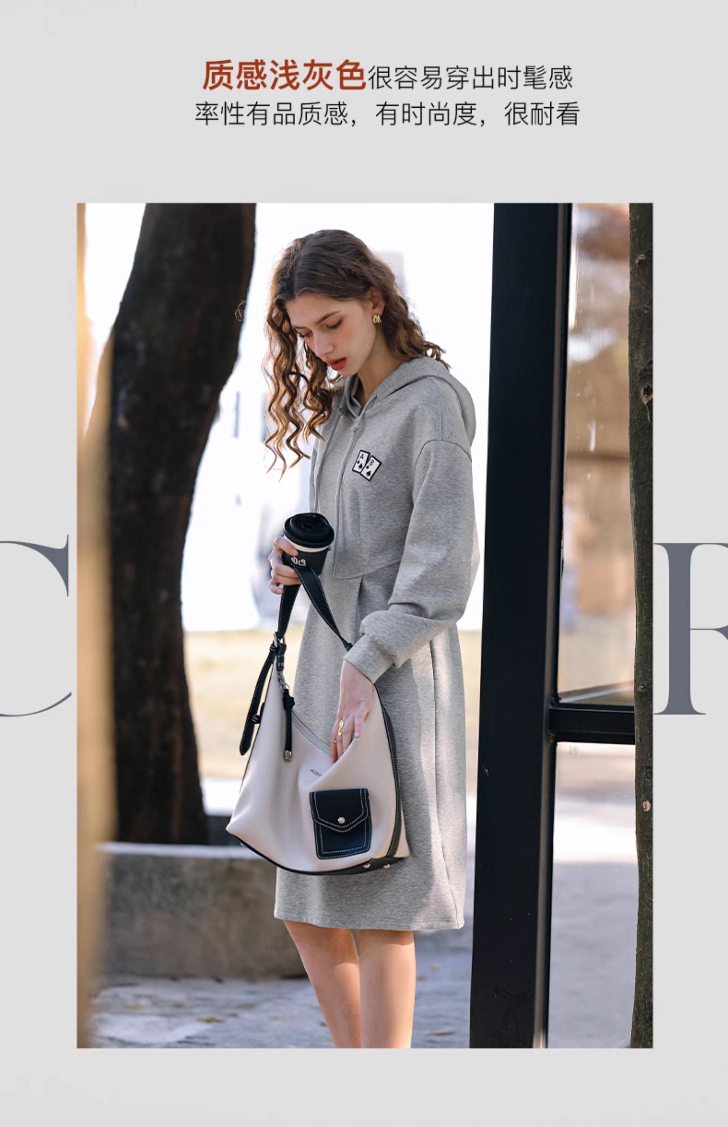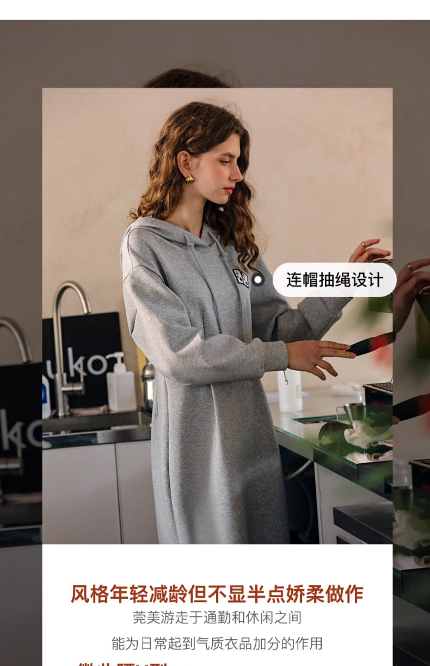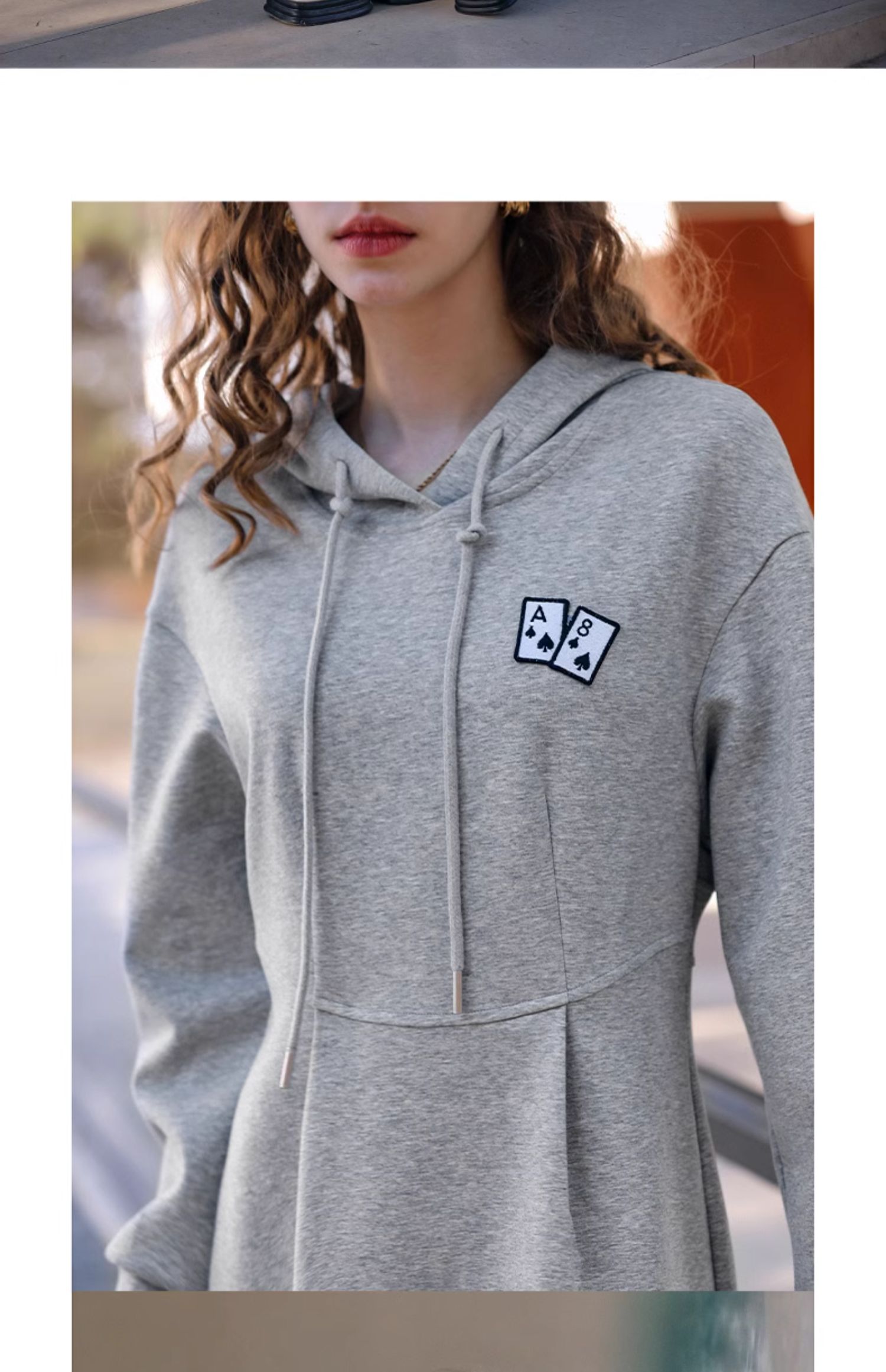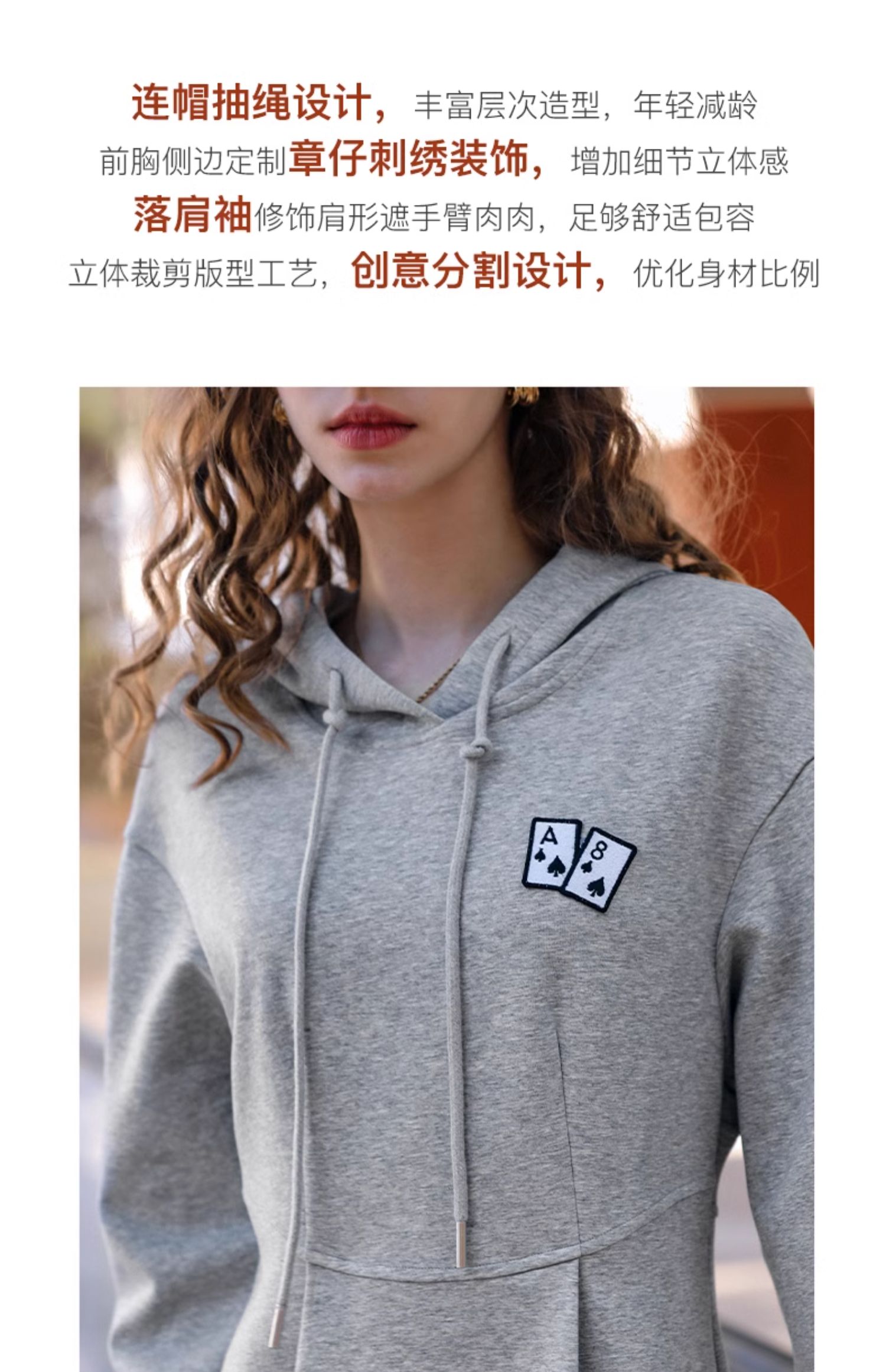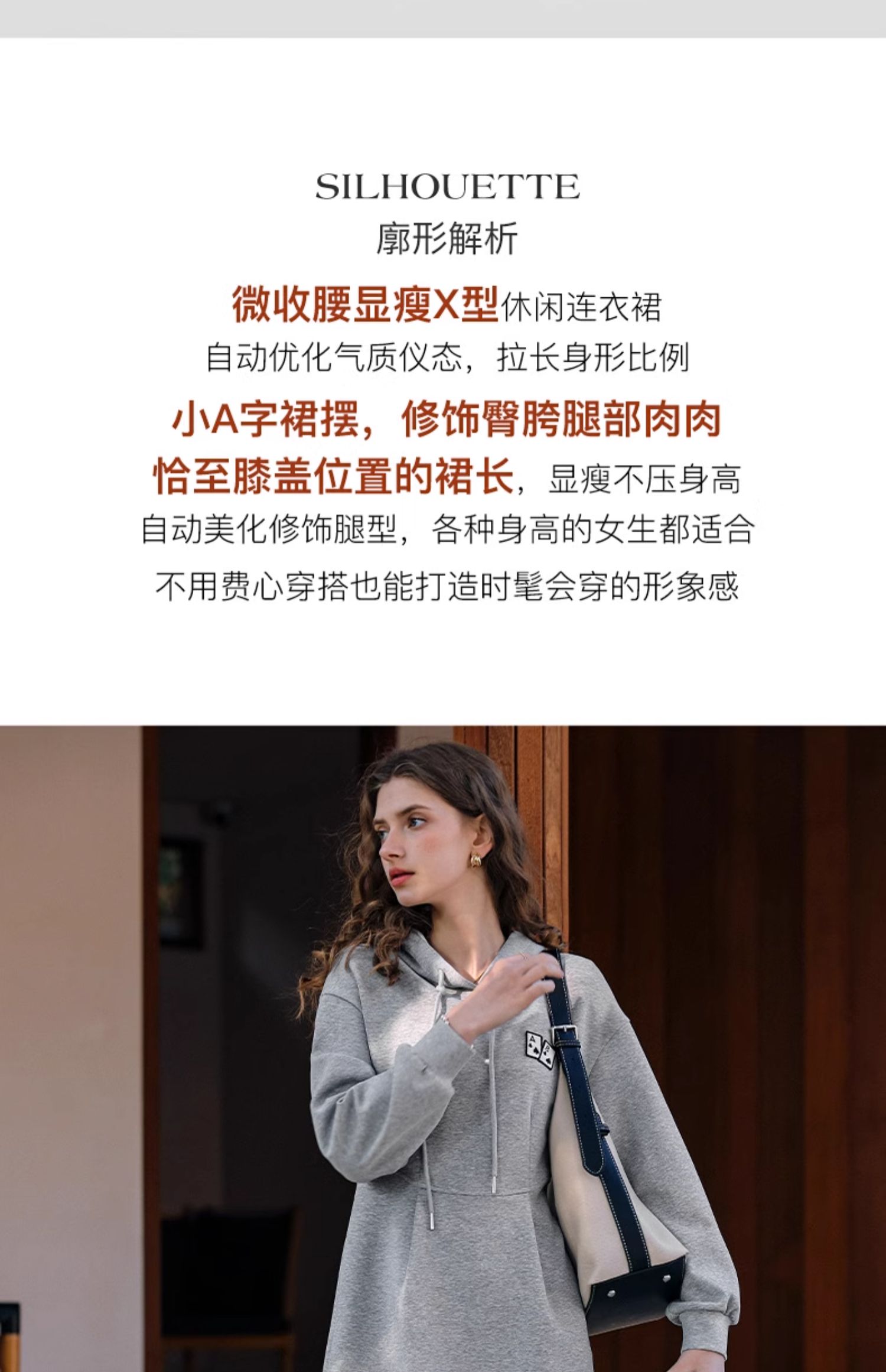 OLrain欧芮儿浅灰色休闲连衣裙女春季2024年新款收腰连帽针织裙
