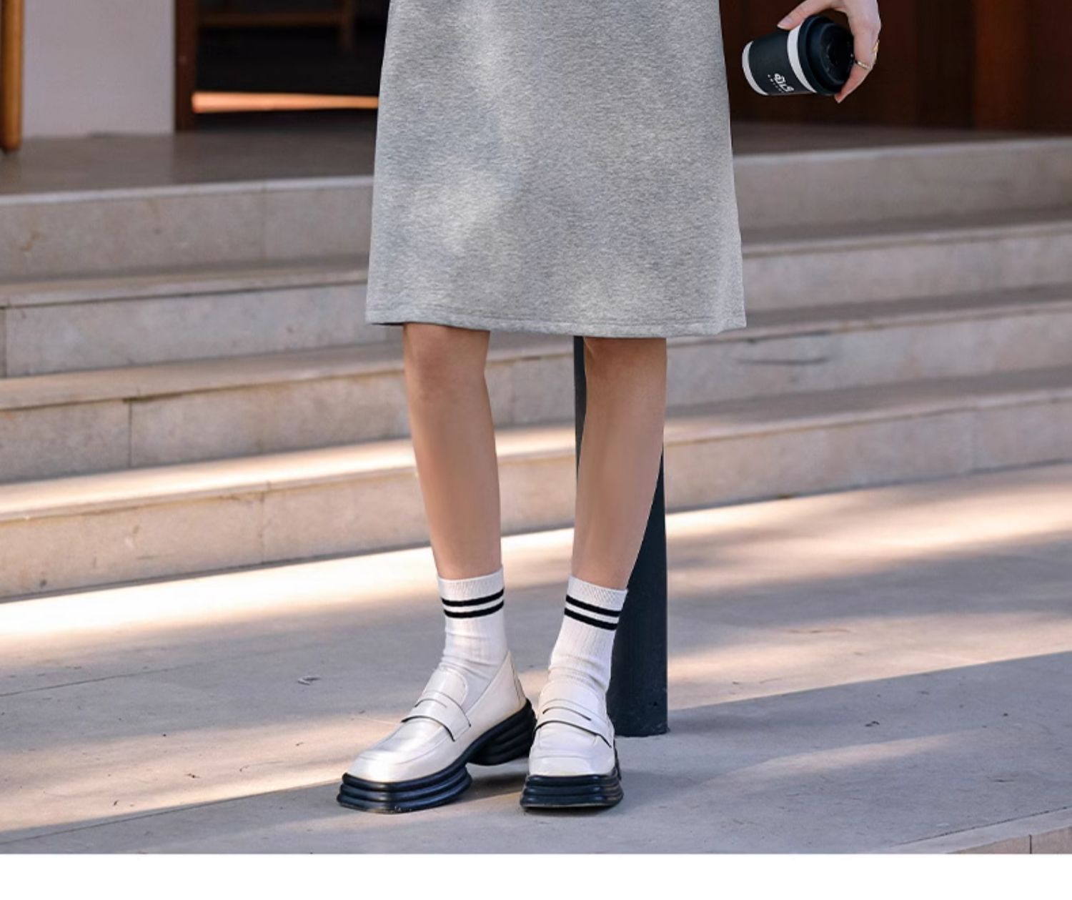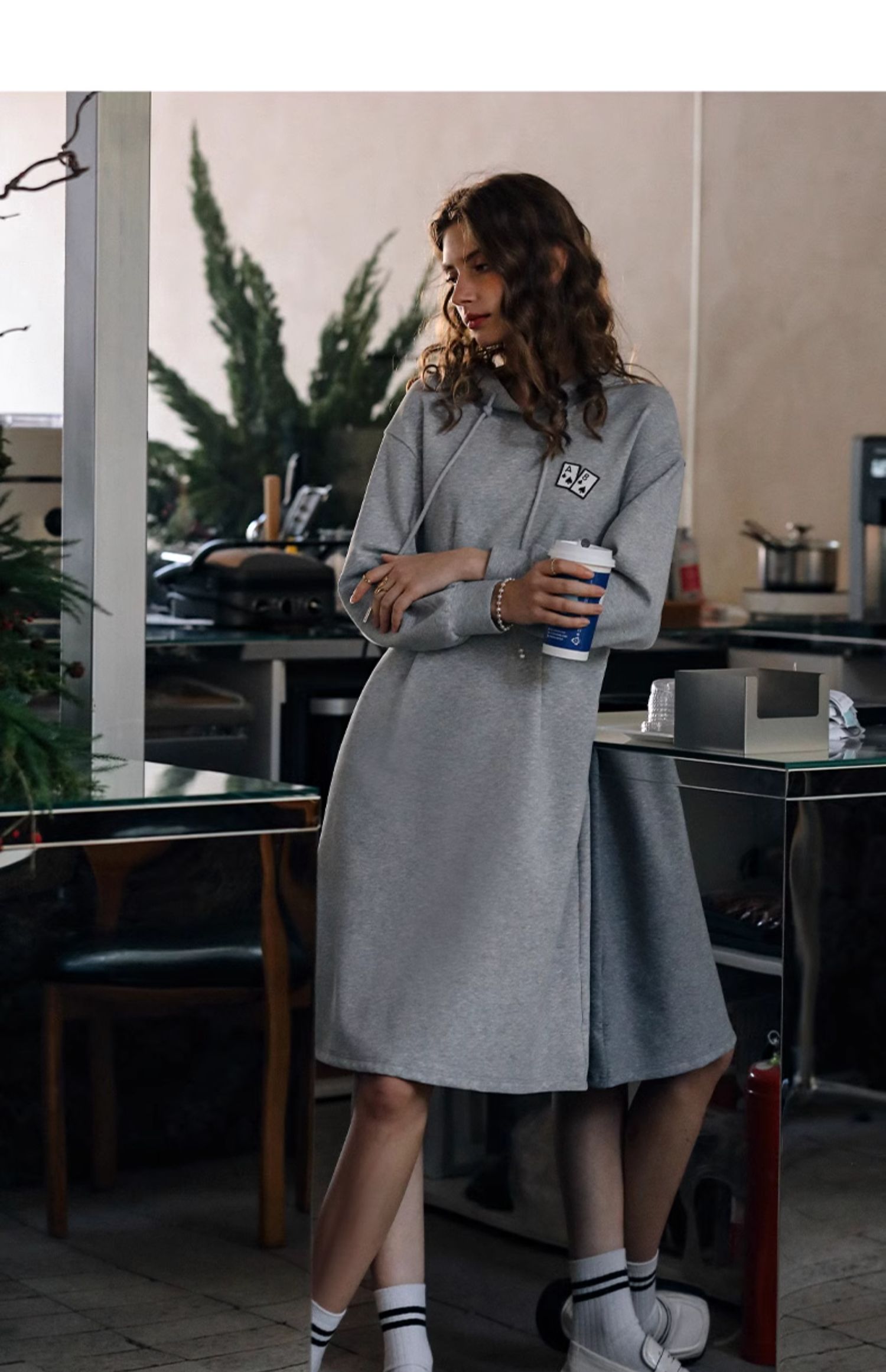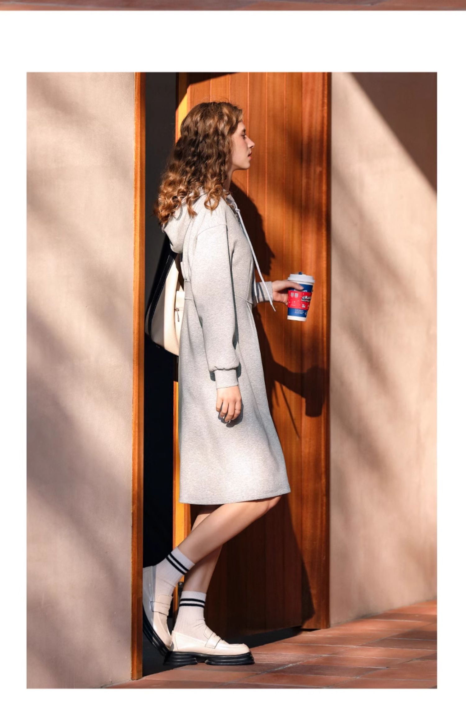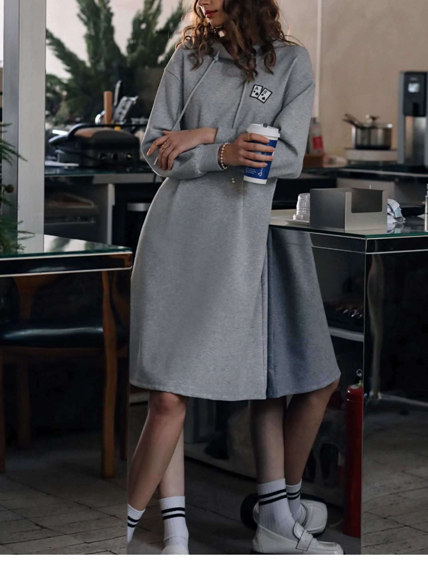 OLrain欧芮儿浅灰色休闲连衣裙女春季2024年新款收腰连帽针织裙