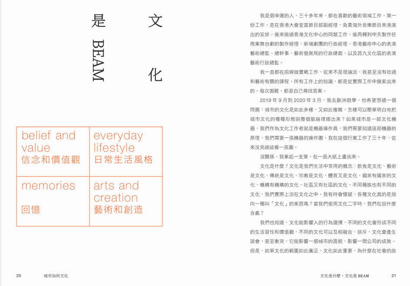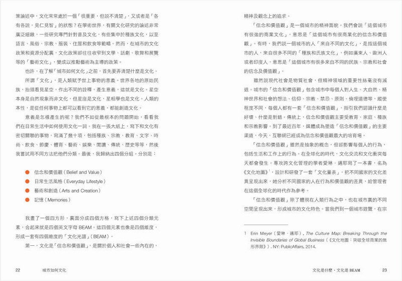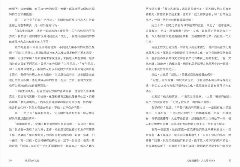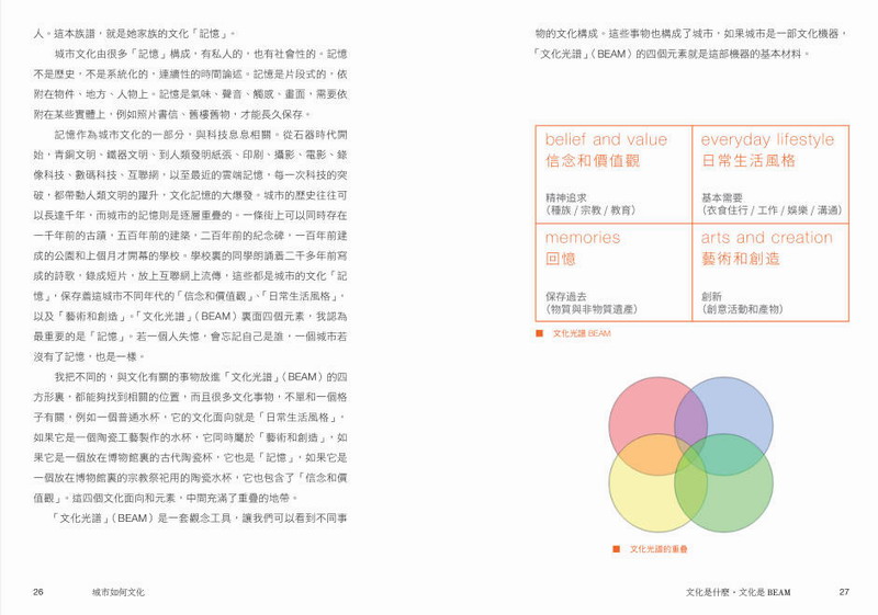 本書探討城市文化,提出「文化系統」、「文化指數」、「文化地圖」及「文化空間」等概念,解構城市文化的各種要素。作者選取了十四個著名城市,深度考察它們怎樣成為獨特的文化都市。最後,作者走訪香港各區,探索各自的文化特質,對香港未來的城市文化發展規劃提出建議。香港如何「文化」?讀者可以透過本書,與作者共同思考未來香港的城市文化發展。