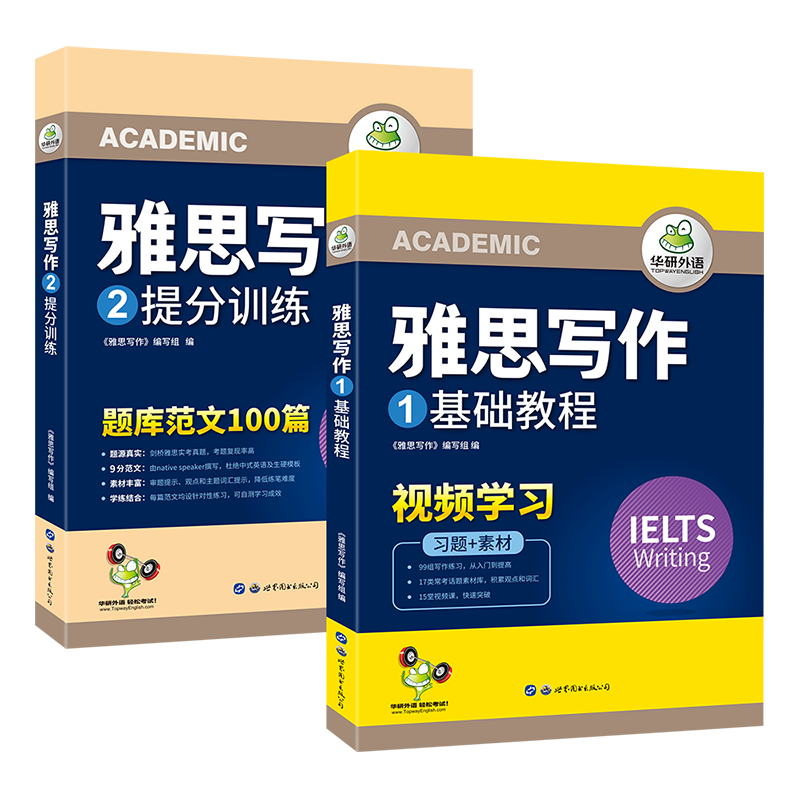 雅思写作,适用对象: 初次接触剑桥雅思考试学术类(A类,Academic类)的考生;英语写作基础薄弱的考生;不熟悉写作话题,缺乏写作素材的考生;需要扩展写作词汇、句型的考生;需要进行课堂教学或自测的雅思培训班师生。 推荐理由: 1. 两册装,上册为写作基础教程,掌握雅思写作要领,学习英文写作原则,学会英文造句及炼词。下册为题库范文,100篇雅思真题范文,以练带学。 2. 理论结合实际,从写作四大评分原则入手,以“知识点+范例分析+强化训练”的讲解模式,切实有效地提高写作能力,避免只看不写的误区。 3. 小作文图表写作详细指南,包括词汇、句型及写作要领。 4. 提供17类写作常考话题的素材库,包括观点(idea)及主题词汇(topic vocabulary),避免写作中无话可说。 5. 所有范文均出自native speaker之手,语言地道,简洁易懂,杜绝中式英语表达以及生硬的模板句型。 6. 每篇范文后都设有针对训练,以练带学,包括词汇搭配翻译、句子翻译及句型仿写练习。 7. 扫码在线免费观看视频课,快速掌握书中重点内容。