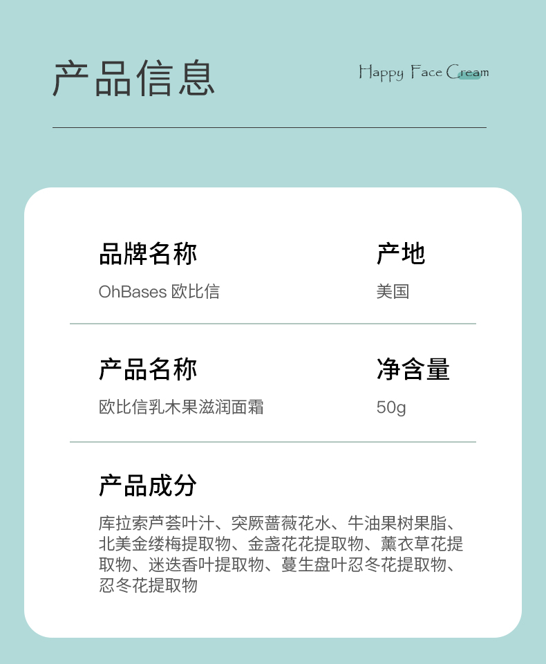 美国OhBases欧比信金盏花乳木果滋润面霜润肤乳 秋冬补水保湿 温和亲肤润养呵护