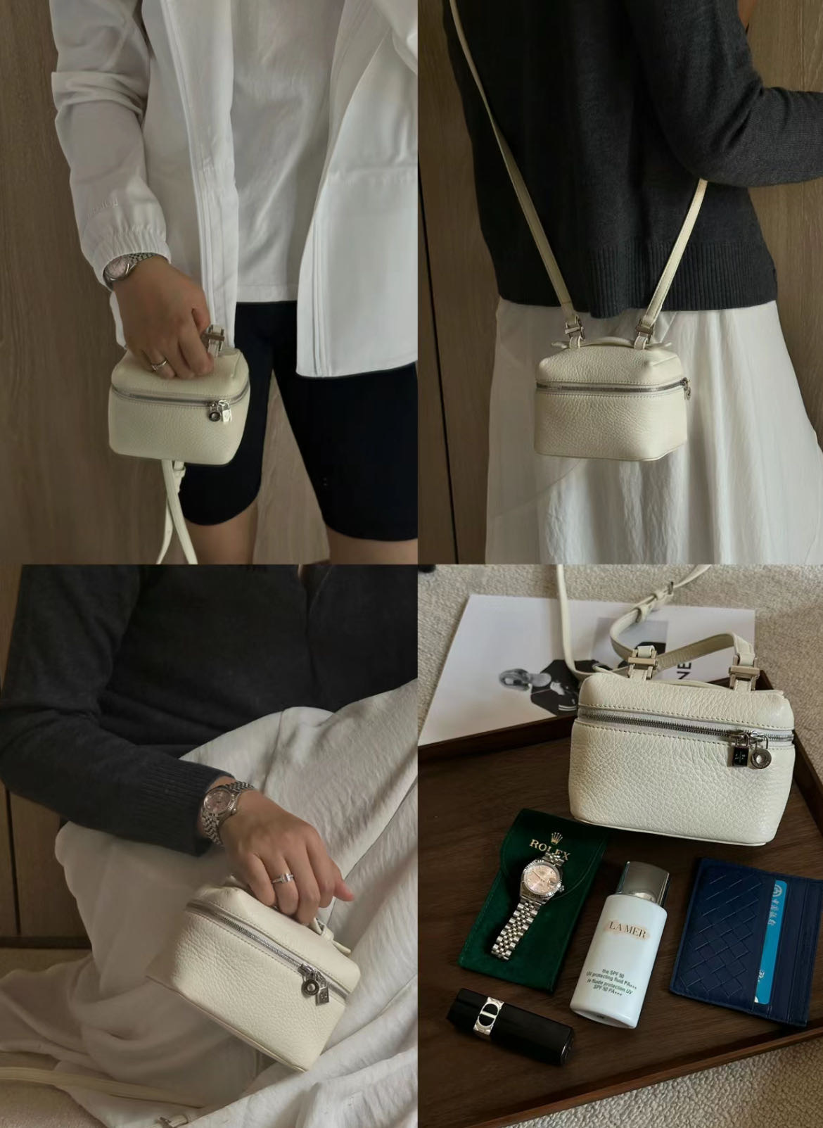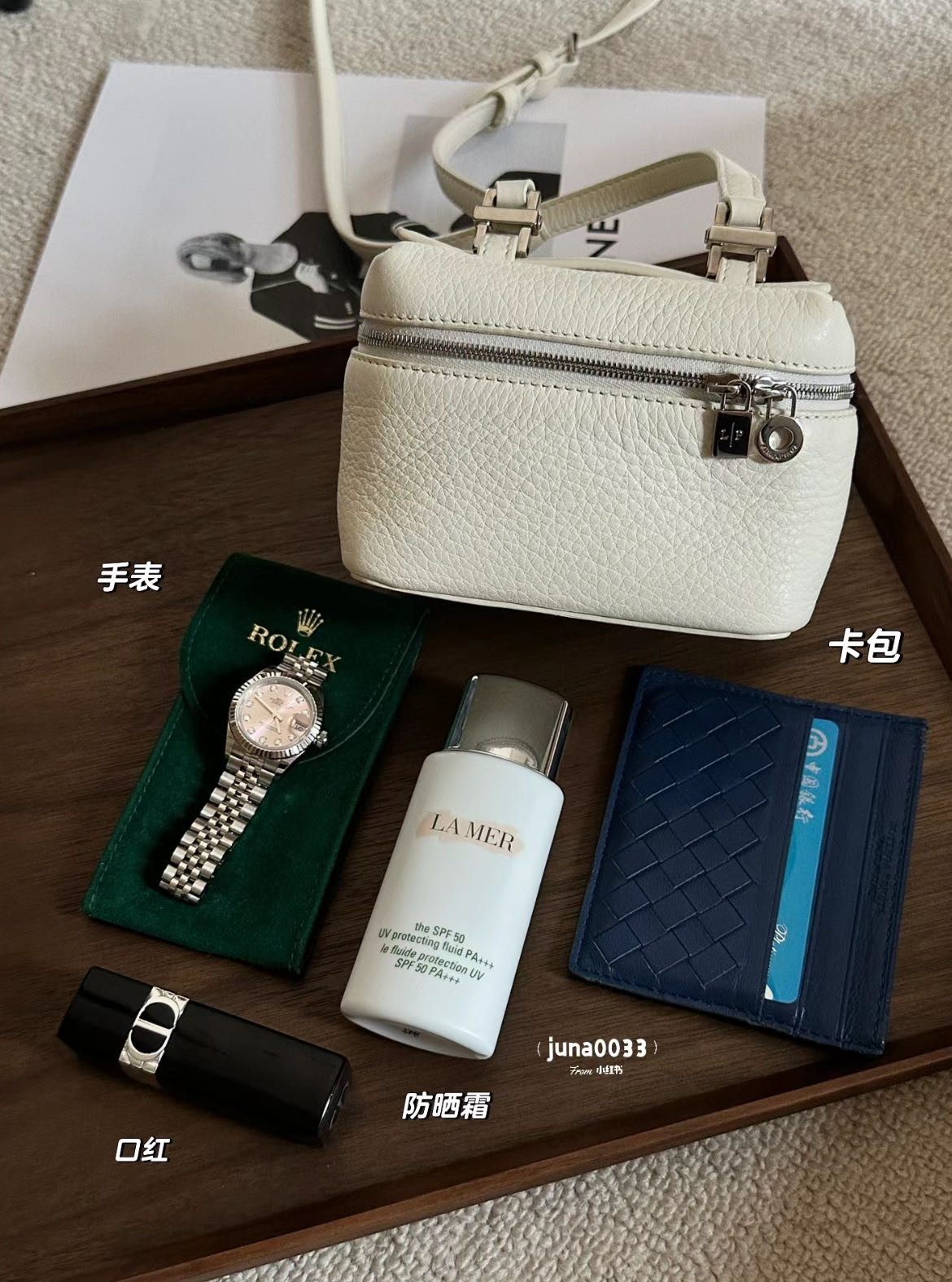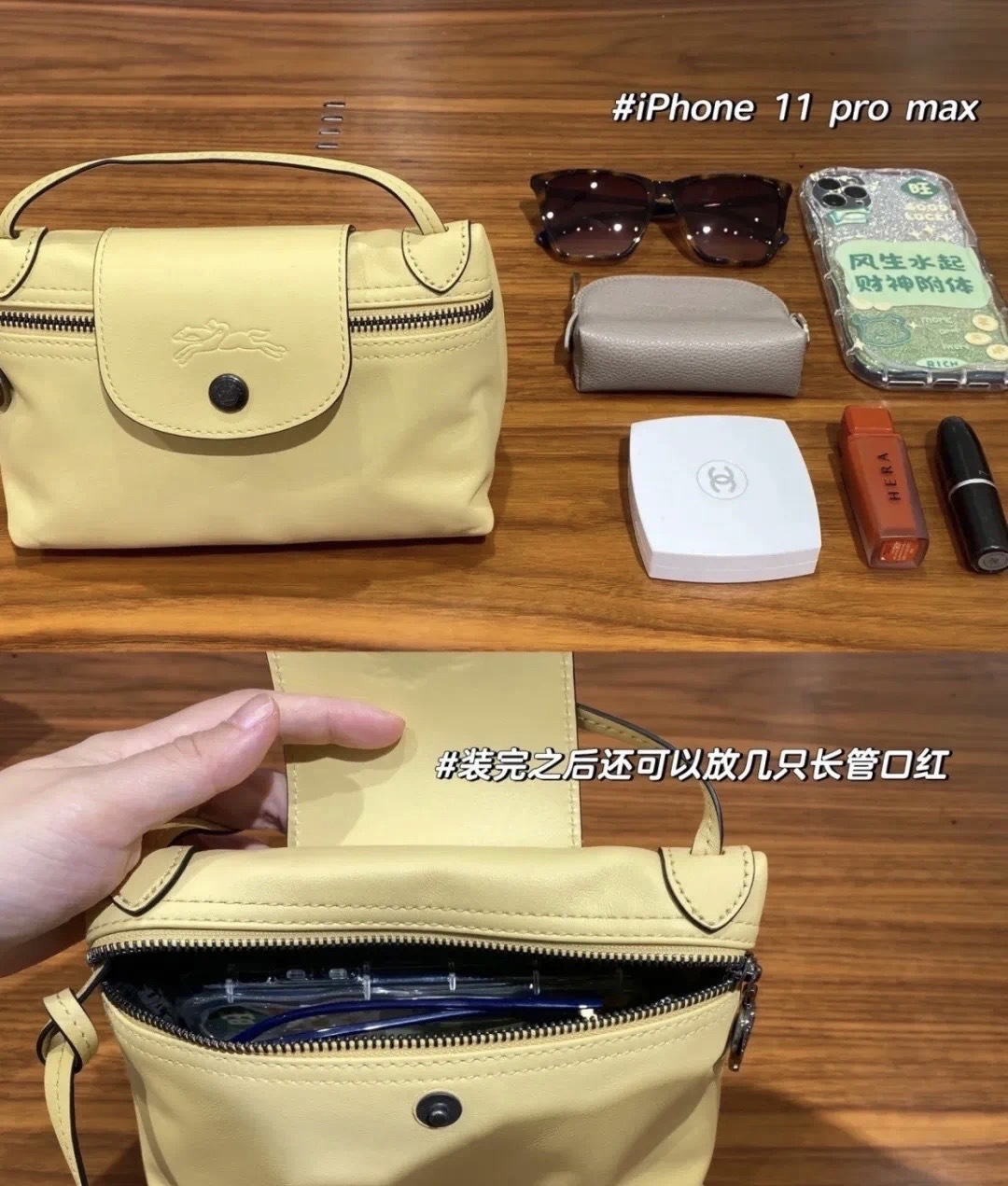 日常带出门的钥匙卡包、充电宝、防晒、补妆用的一些彩妆都没问题哦!