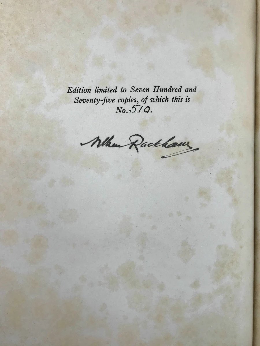 本书为仅发行775册的限量版图书,编号510,卷首有限量标示。以及鬼才画家拉克姆的亲笔签名!