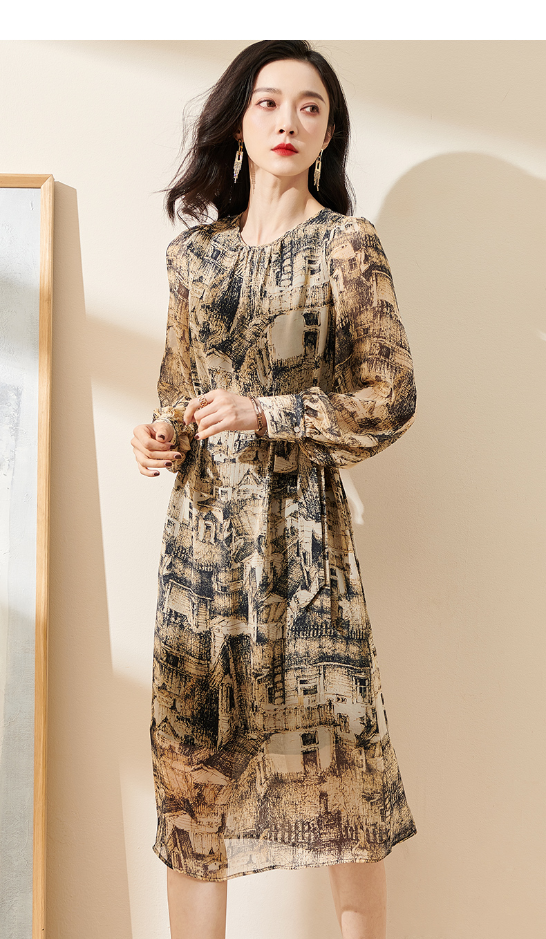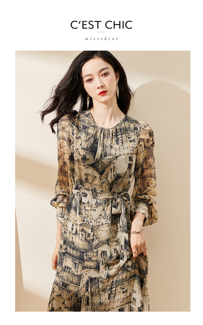 剩M 米思阳2024春季新款时尚气质印花宽松长袖系带收腰连衣裙0561
