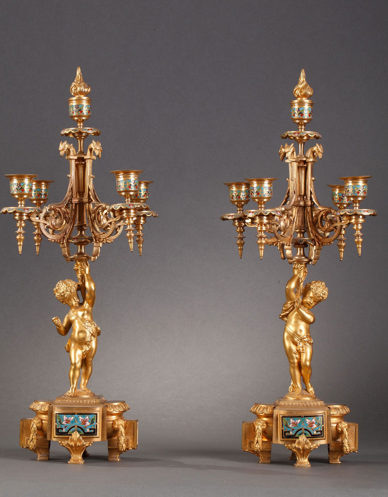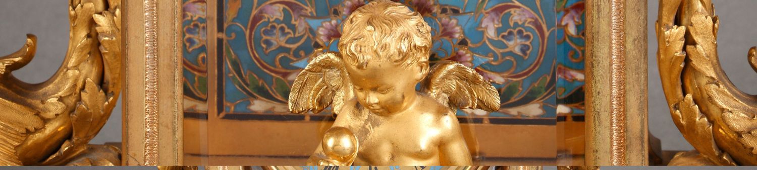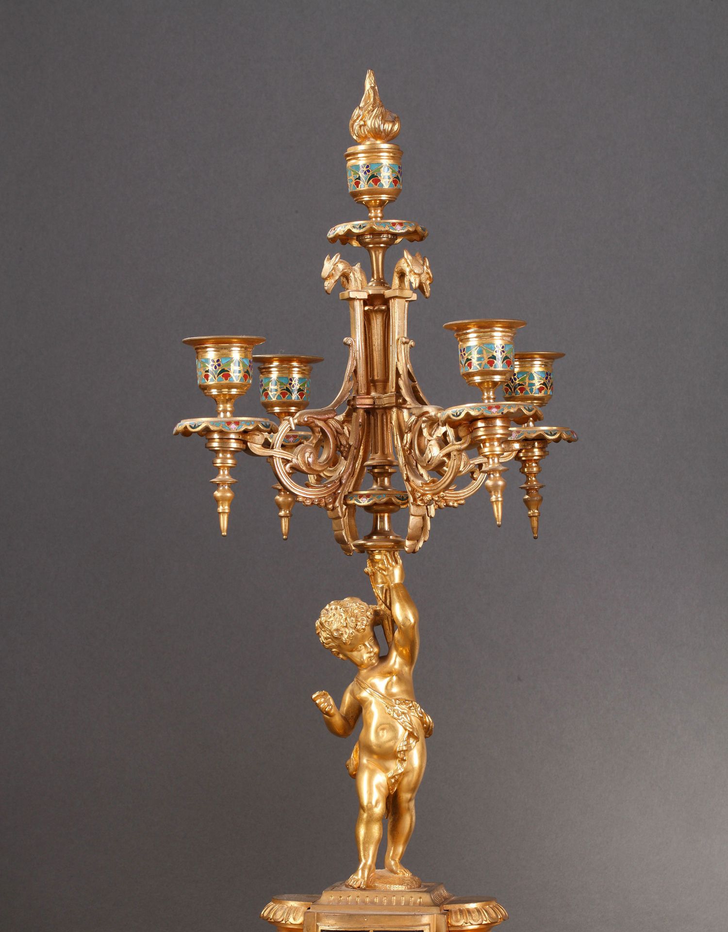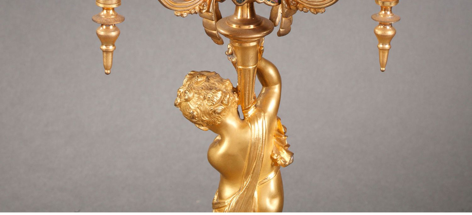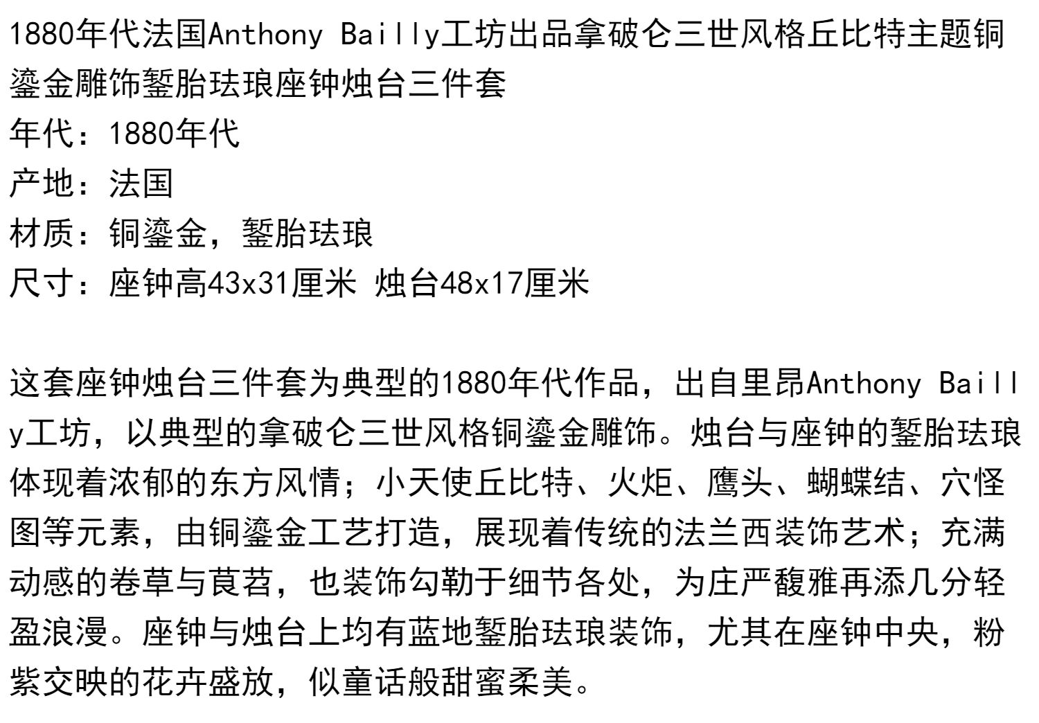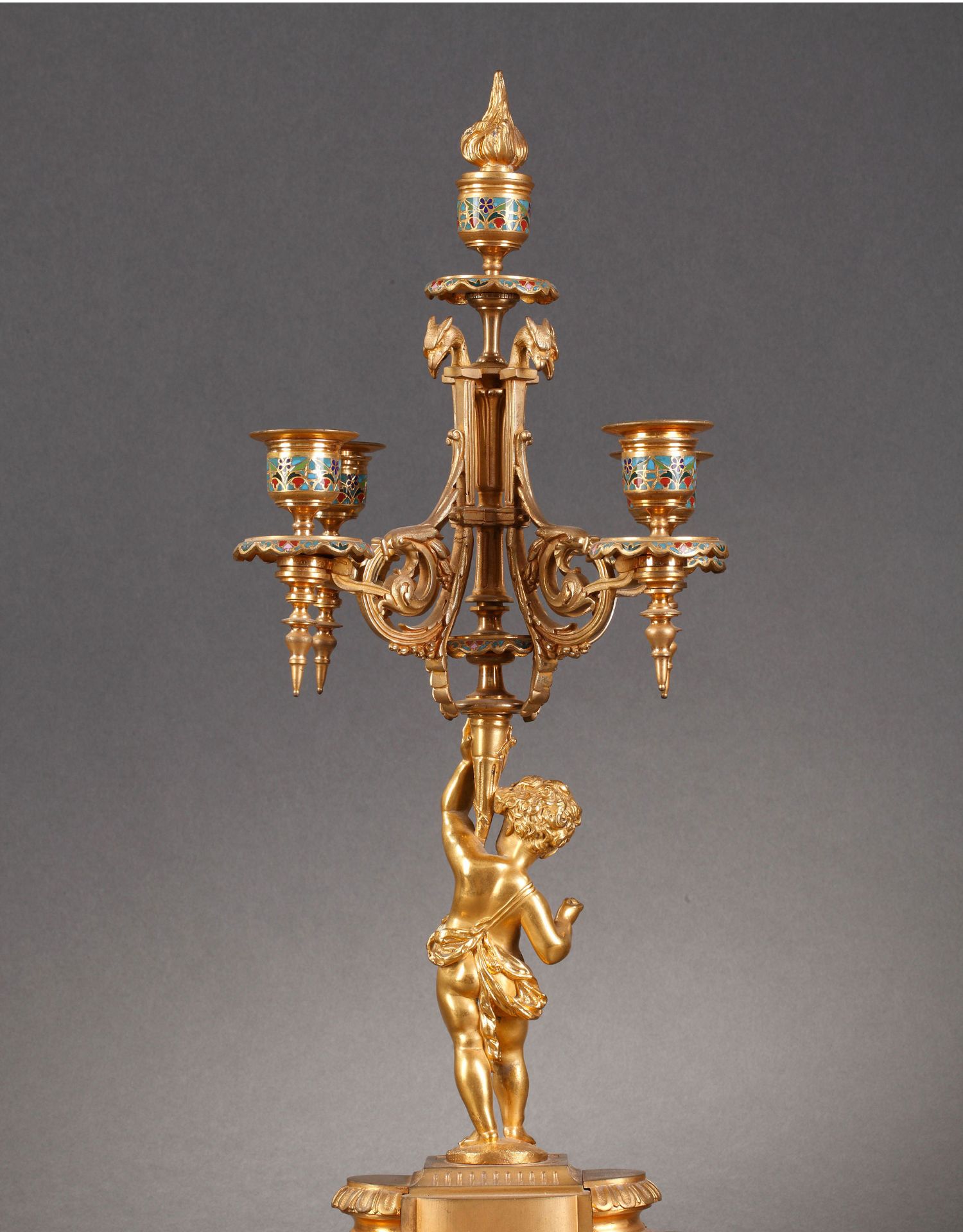 独角鹿西洋古董法国丘比特主题铜鎏金雕饰錾胎珐琅座钟烛台三件套