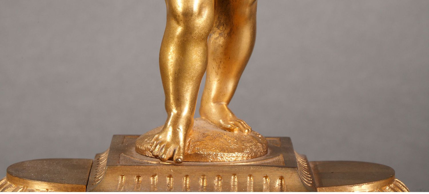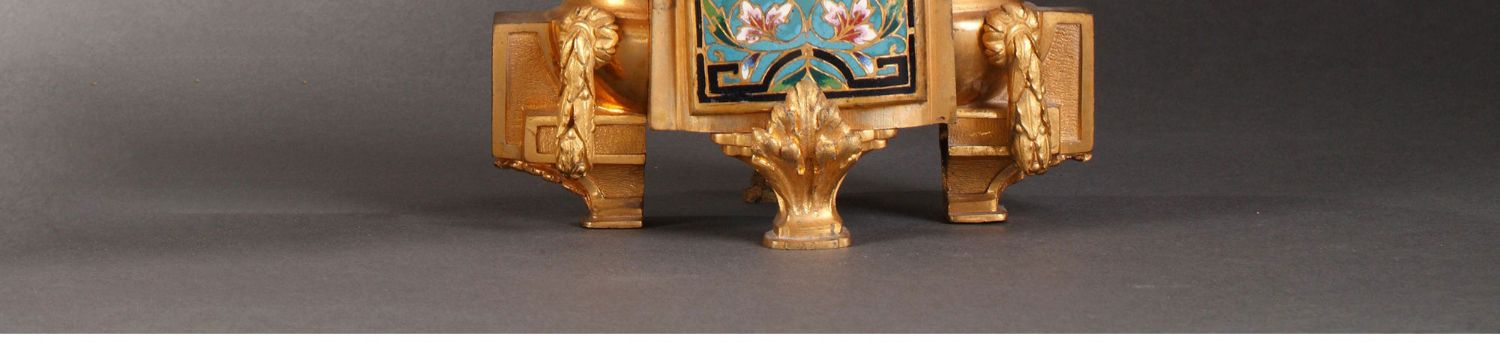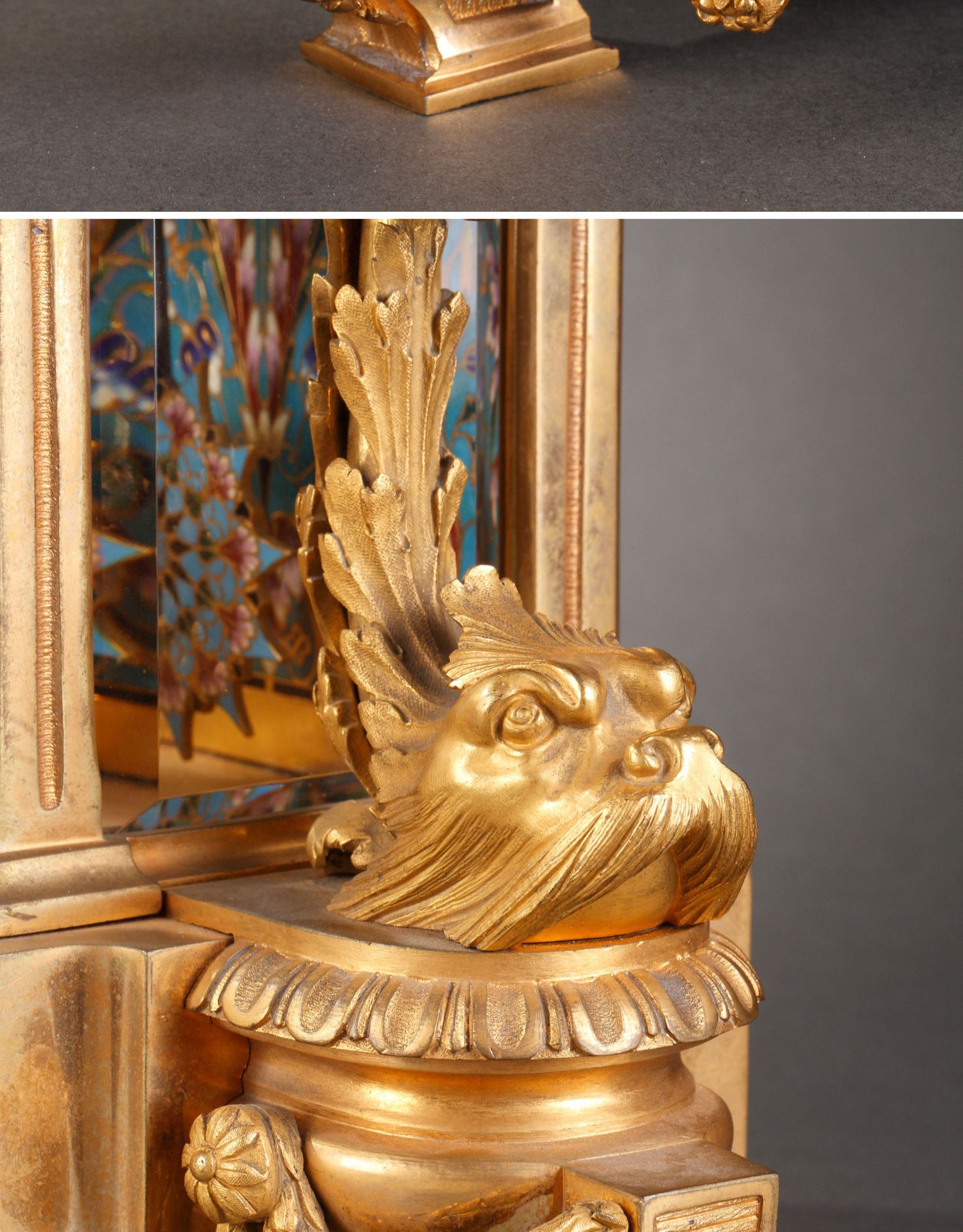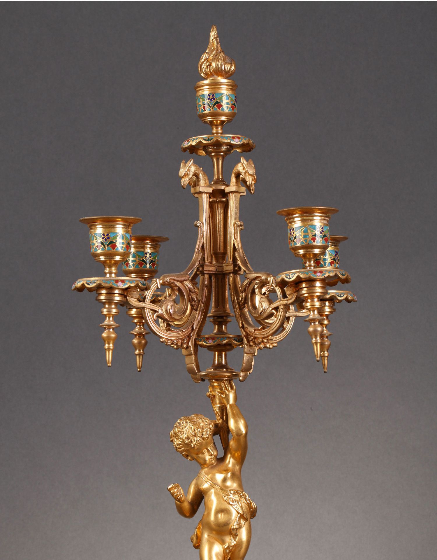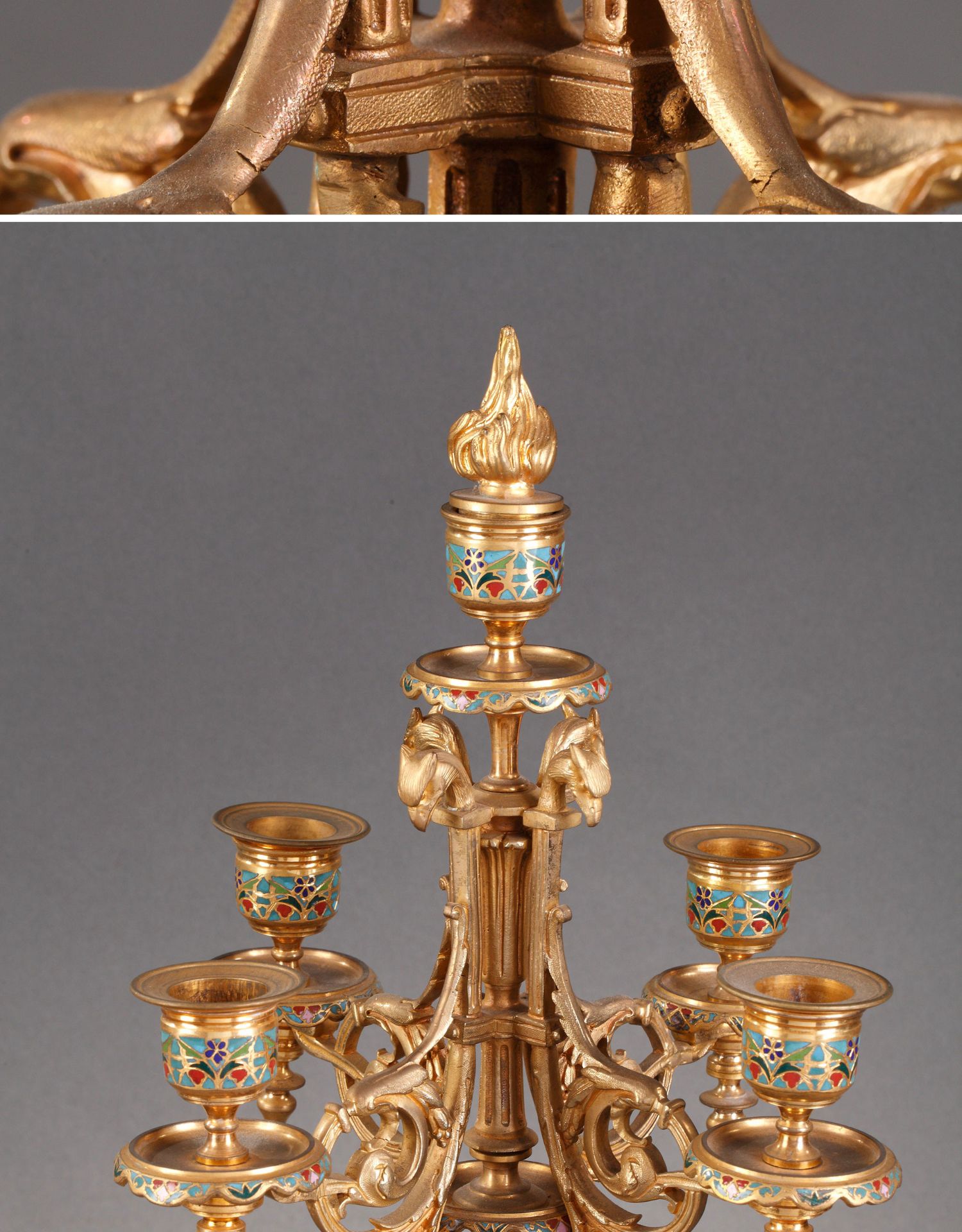 独角鹿西洋古董法国丘比特主题铜鎏金雕饰錾胎珐琅座钟烛台三件套
