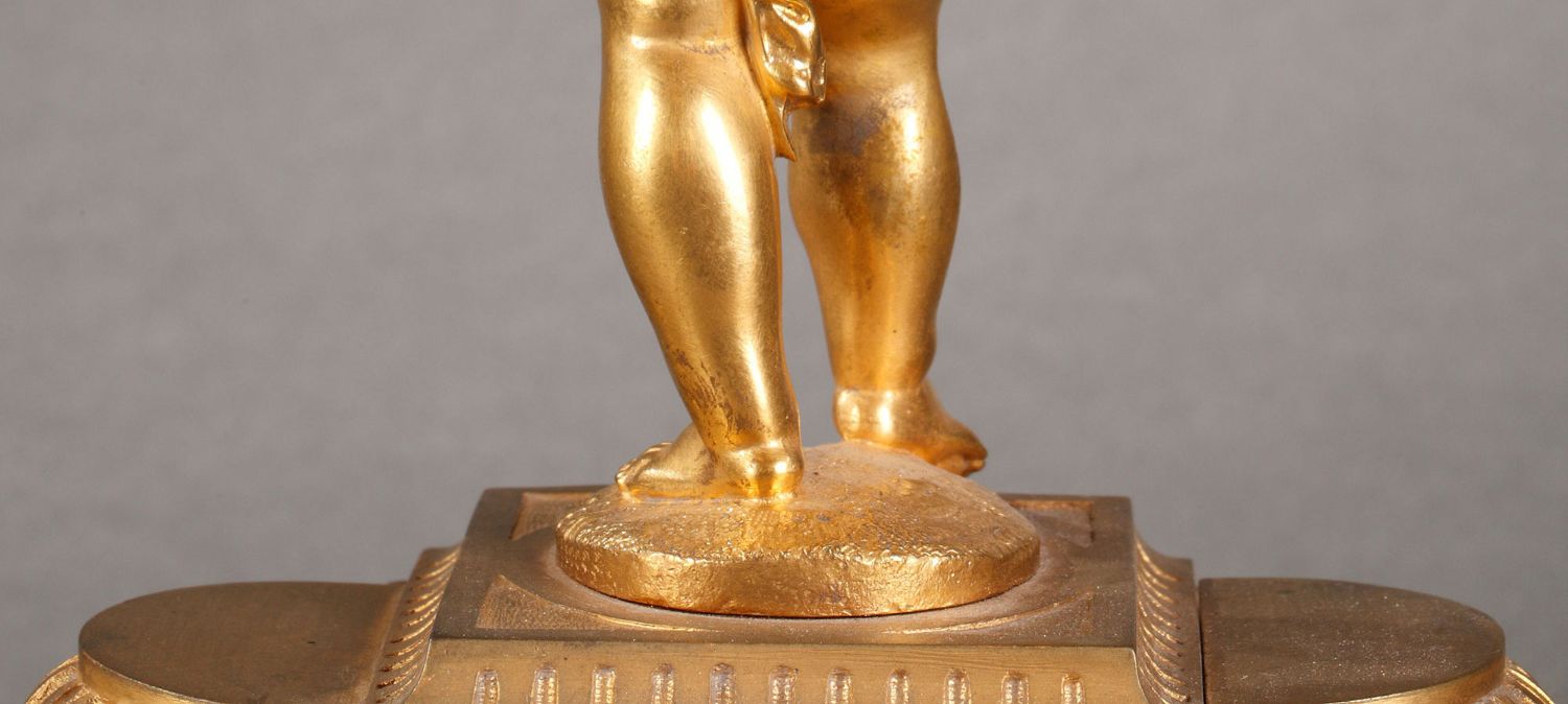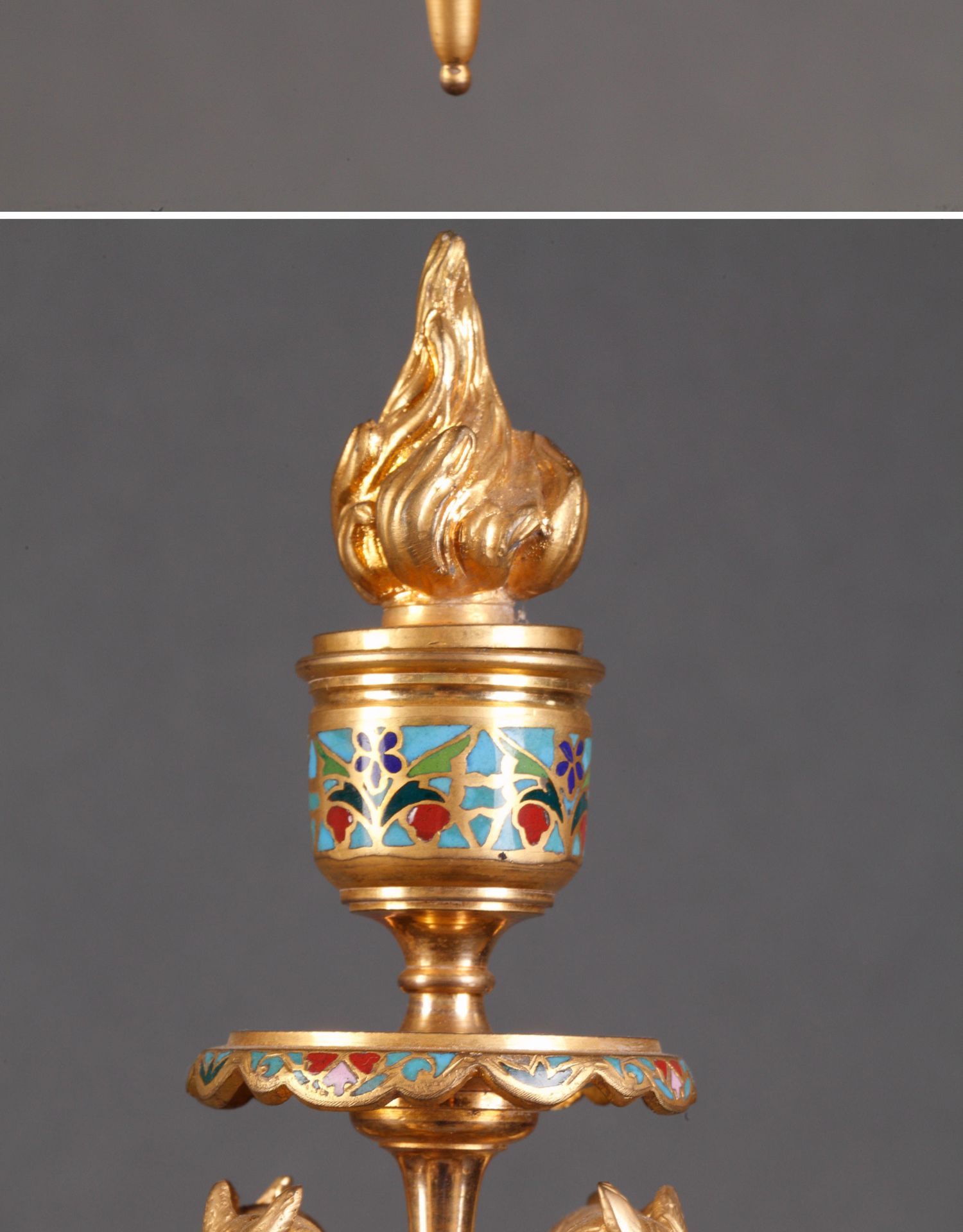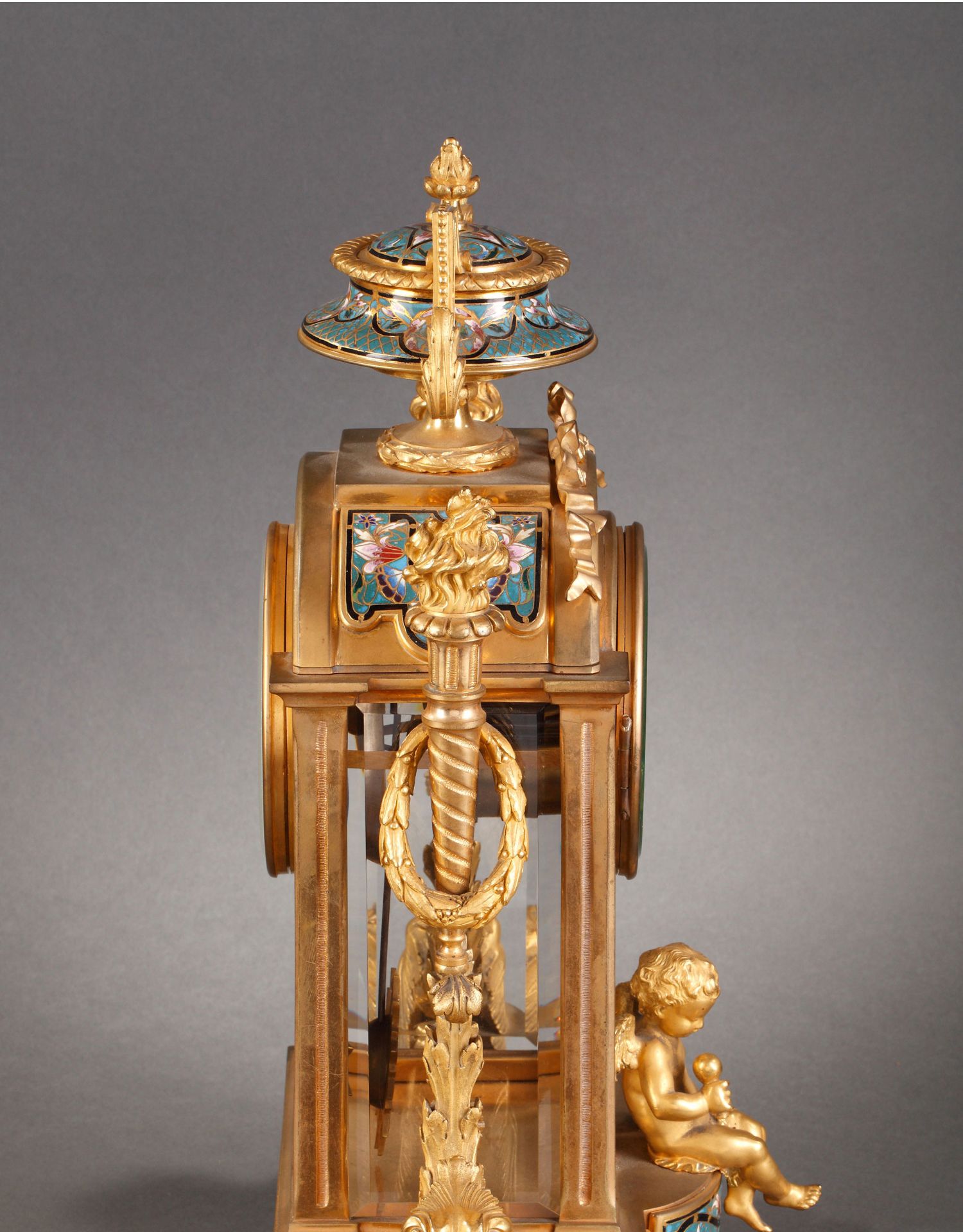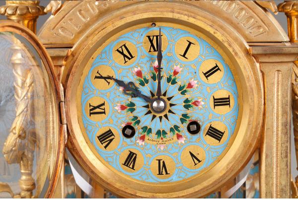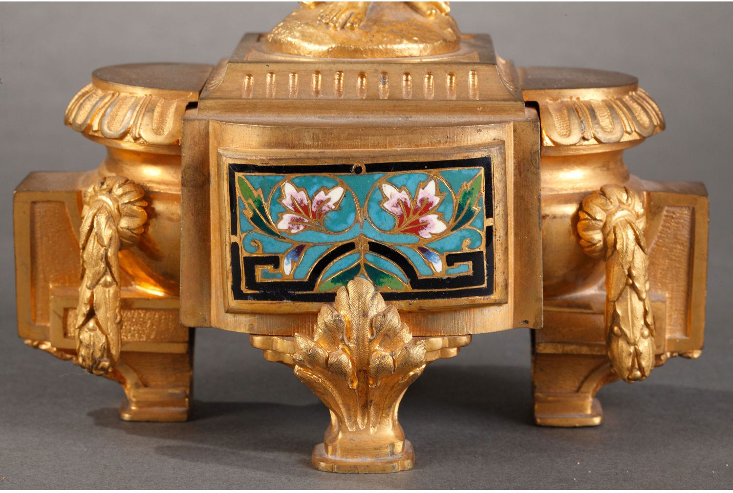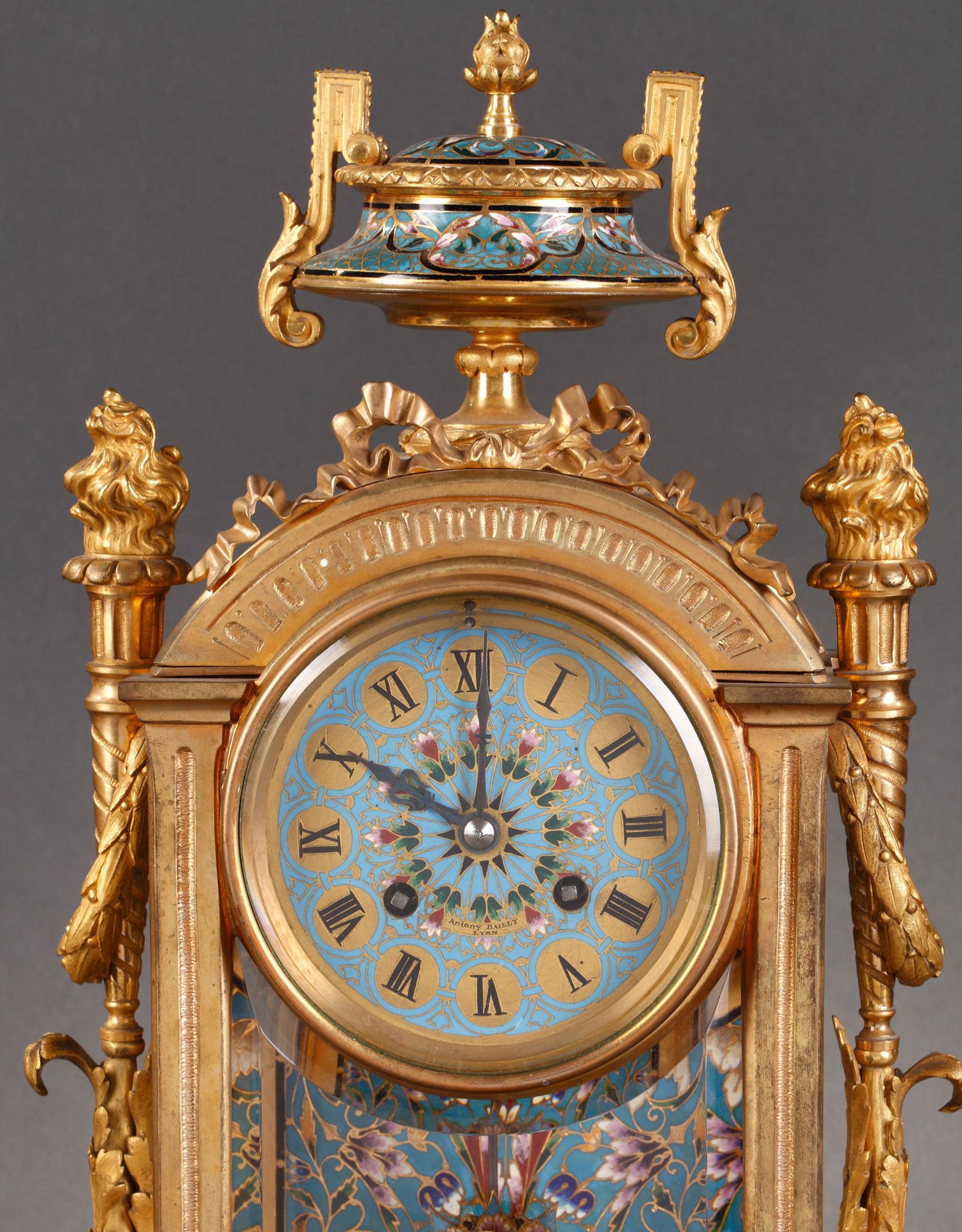 独角鹿西洋古董法国丘比特主题铜鎏金雕饰錾胎珐琅座钟烛台三件套