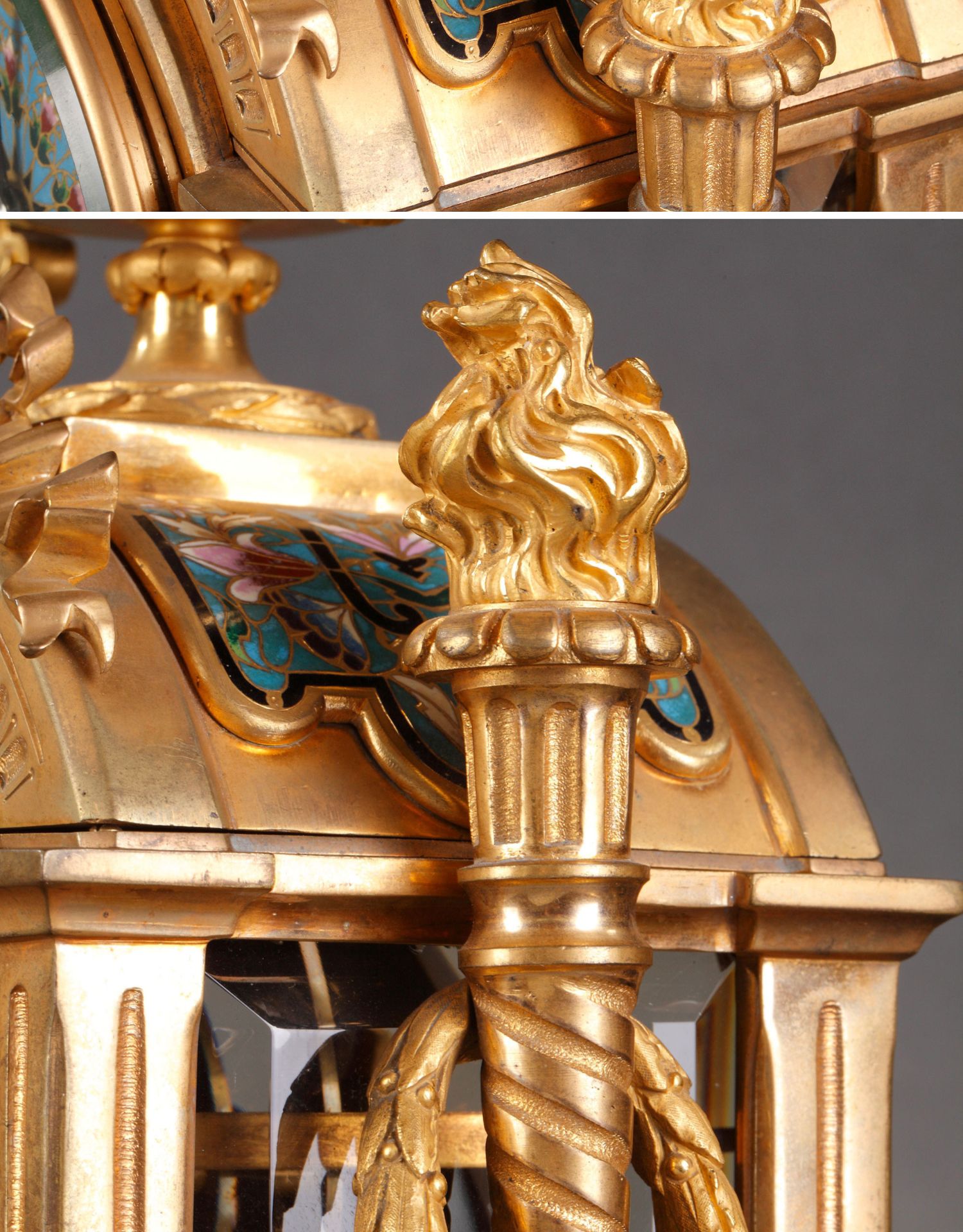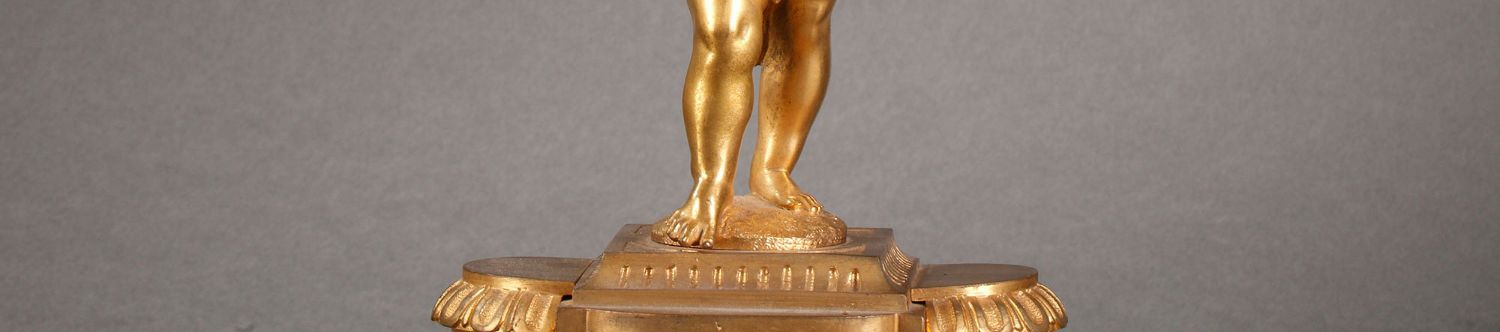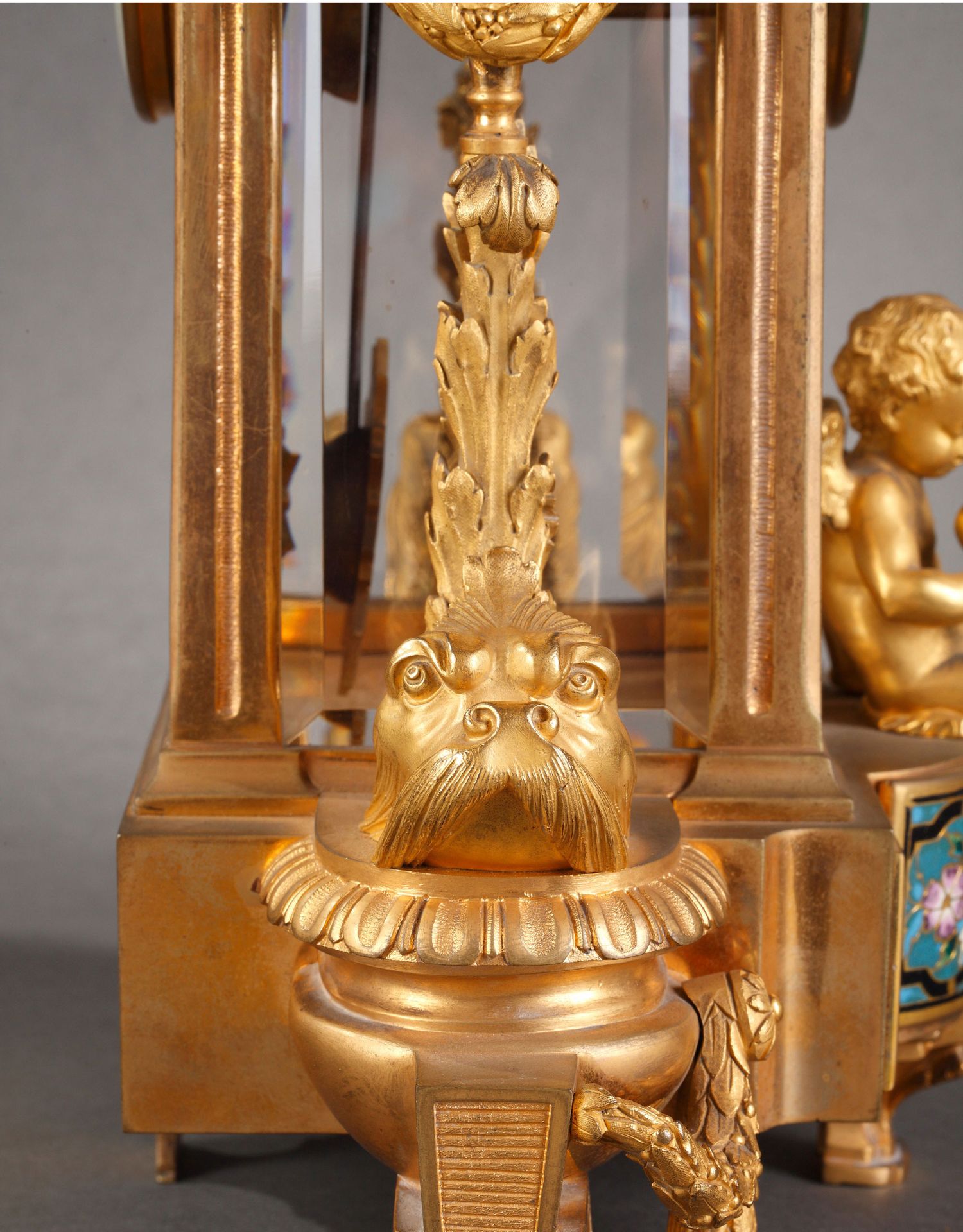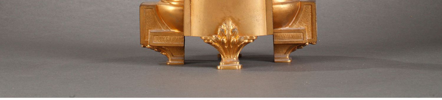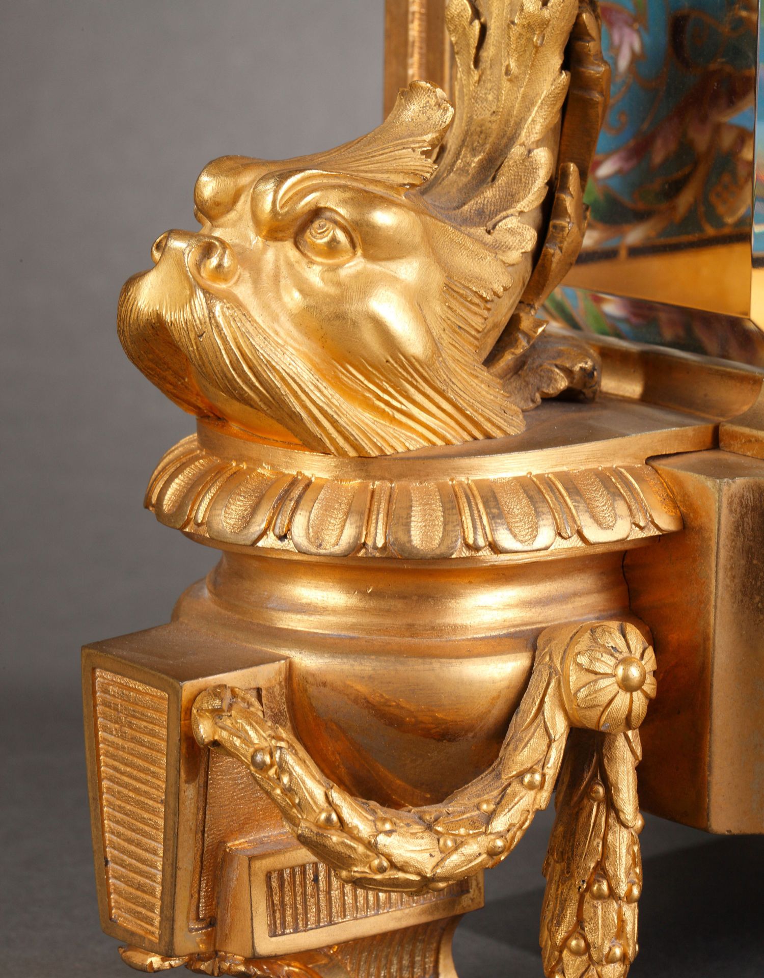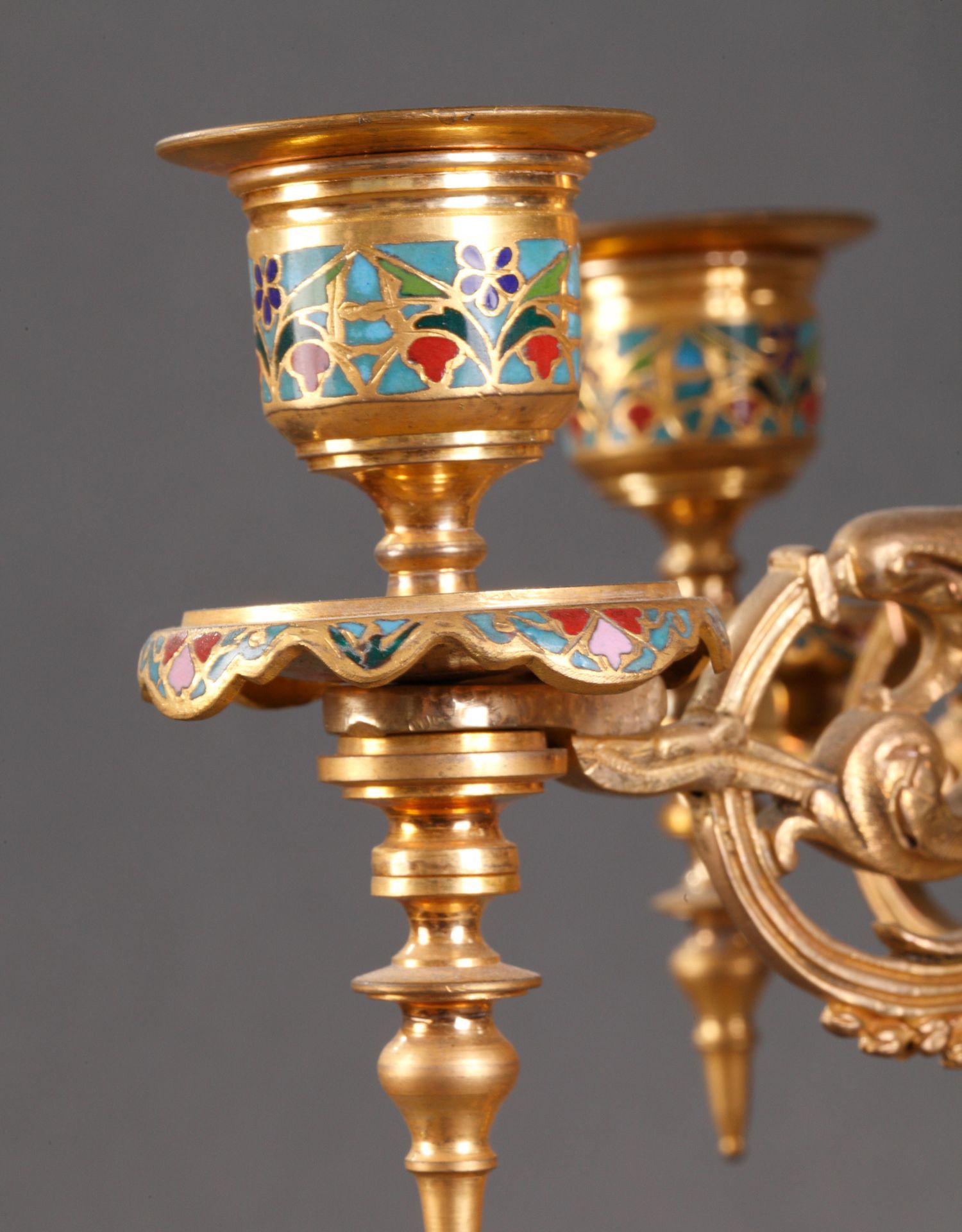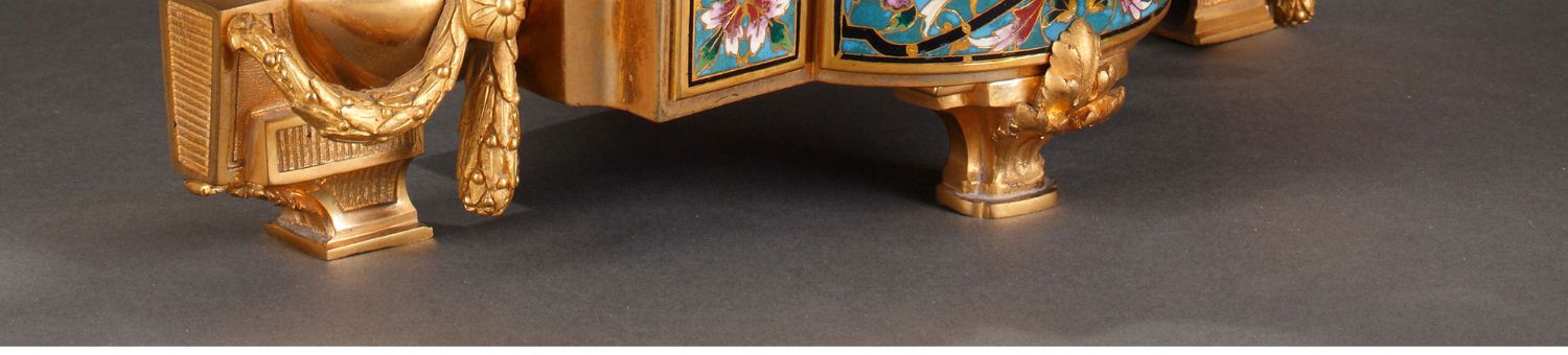 独角鹿西洋古董法国丘比特主题铜鎏金雕饰錾胎珐琅座钟烛台三件套