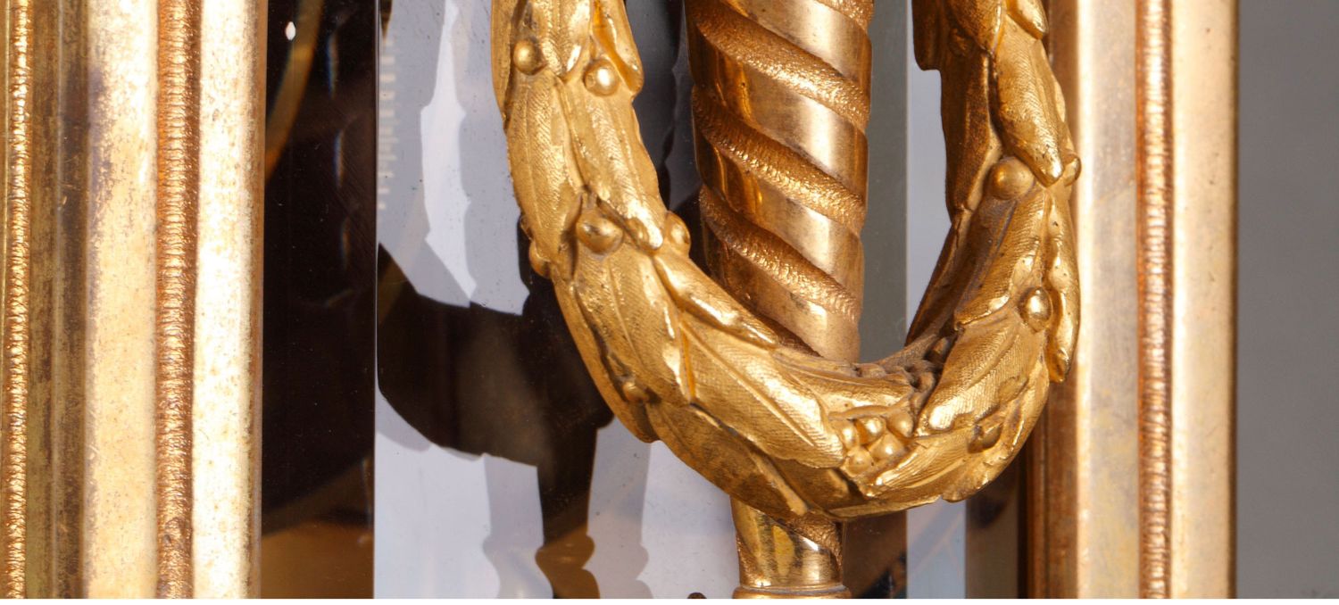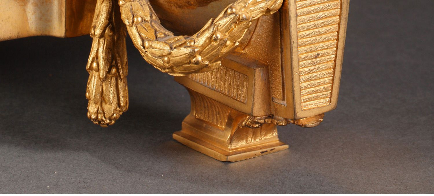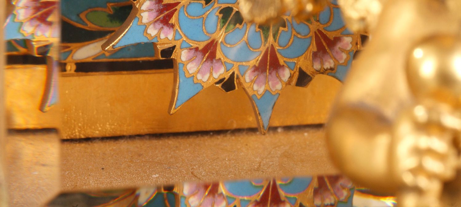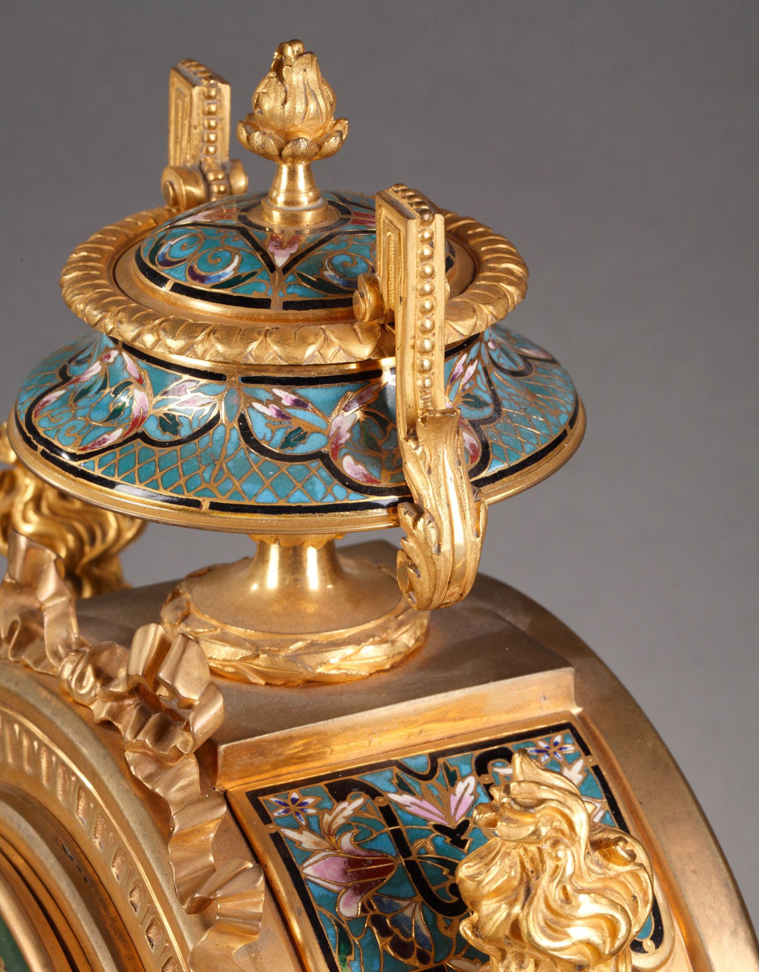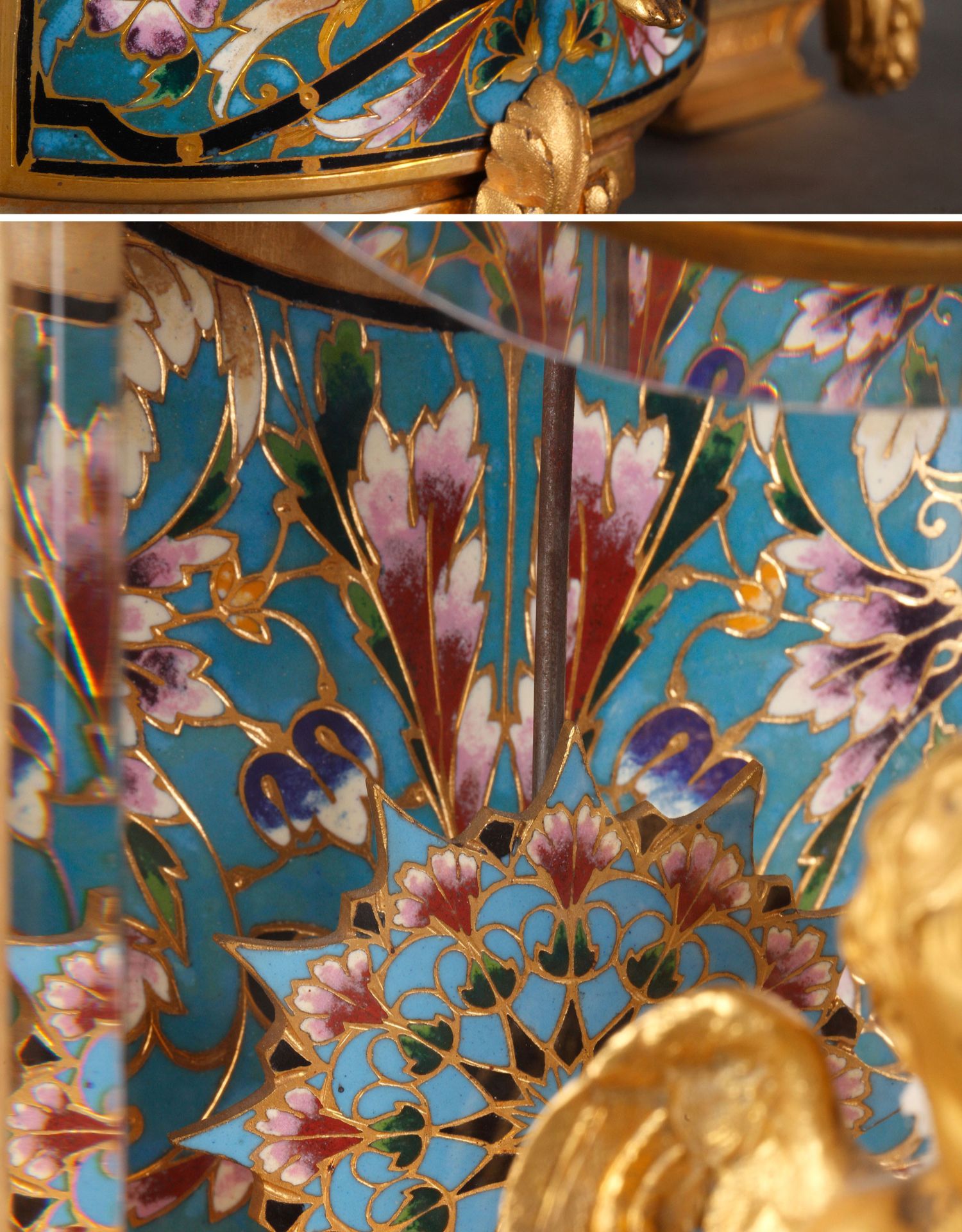 独角鹿西洋古董法国丘比特主题铜鎏金雕饰錾胎珐琅座钟烛台三件套