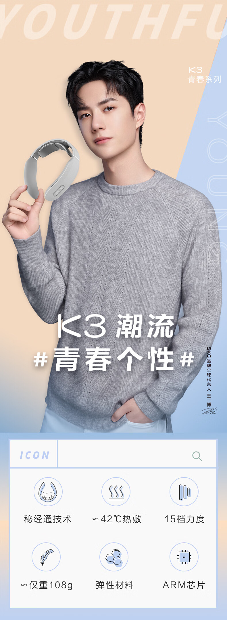 SKG颈椎按摩器 时尚颈椎按摩仪肩颈按摩器颈椎经络电脉冲护颈仪 K3浅灰色 送礼 礼物【王一博代言】